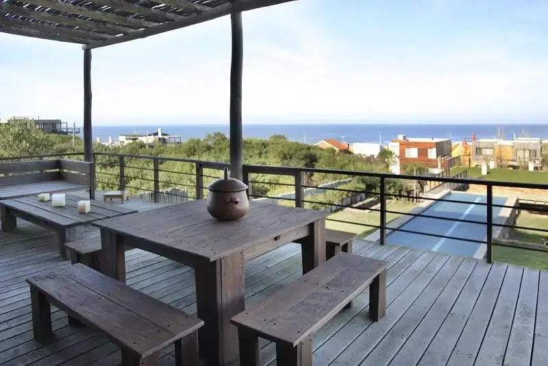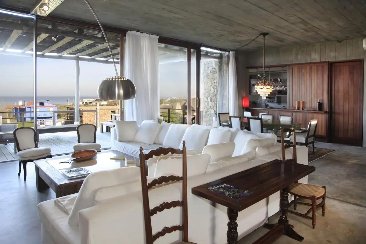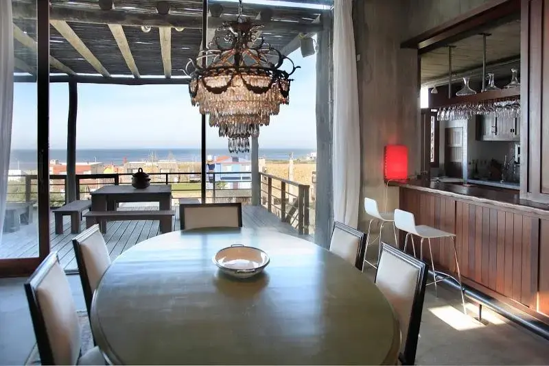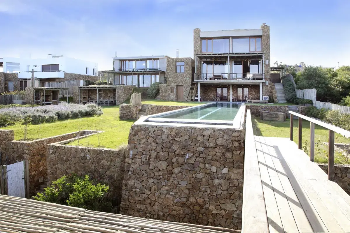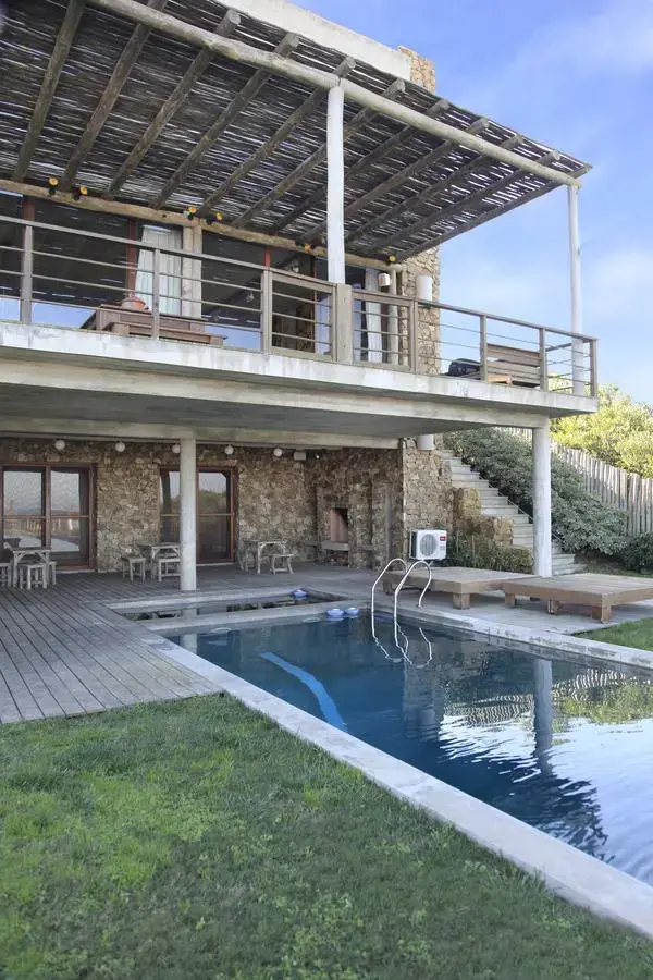 En esta casa de lineas contemporaneas diseñada por el reconocido Arq.Horacio Ravazzani,se maneja con exquisito gusto la luz y forma,utilizando materiales como piedra local ,acero,vidrio,aluminio y distintas maderas.Generosa recepcion,que abre con grandes puertas ventanas a un deck.El living y comedor contiene un balance de elementos rusticos y de estilo.Arriba la suite principal,con su gran vestidor tiene una espectacular vista al mar. Abajo,tiene un gym,sauna, la bodega y una pequeña sala de cine.Se abre a un deck donde esta el parrillero y toda la zona de la piscina. Separada por el jardin,brindando mucha privacidad,esta la segunda casa que tiene dos dormitorios y dos baños. Garage doble,y caseros que permanecen en la casa. Adjuntas 3 unidades cuya sumatoria en total son 11 dormitorios en un mismo dominio, las cuales se alquilan cada una por separado sumando al monto de la sede sus respectivos valores.