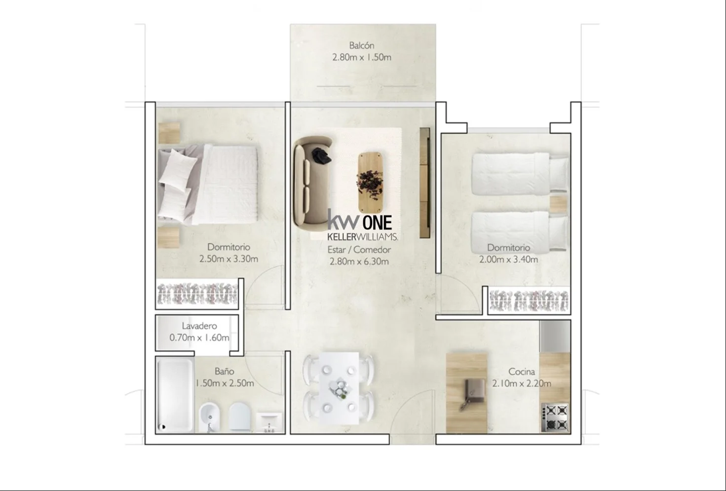 Balcon, 2 dormitorios, 1 baño en suite con espacio