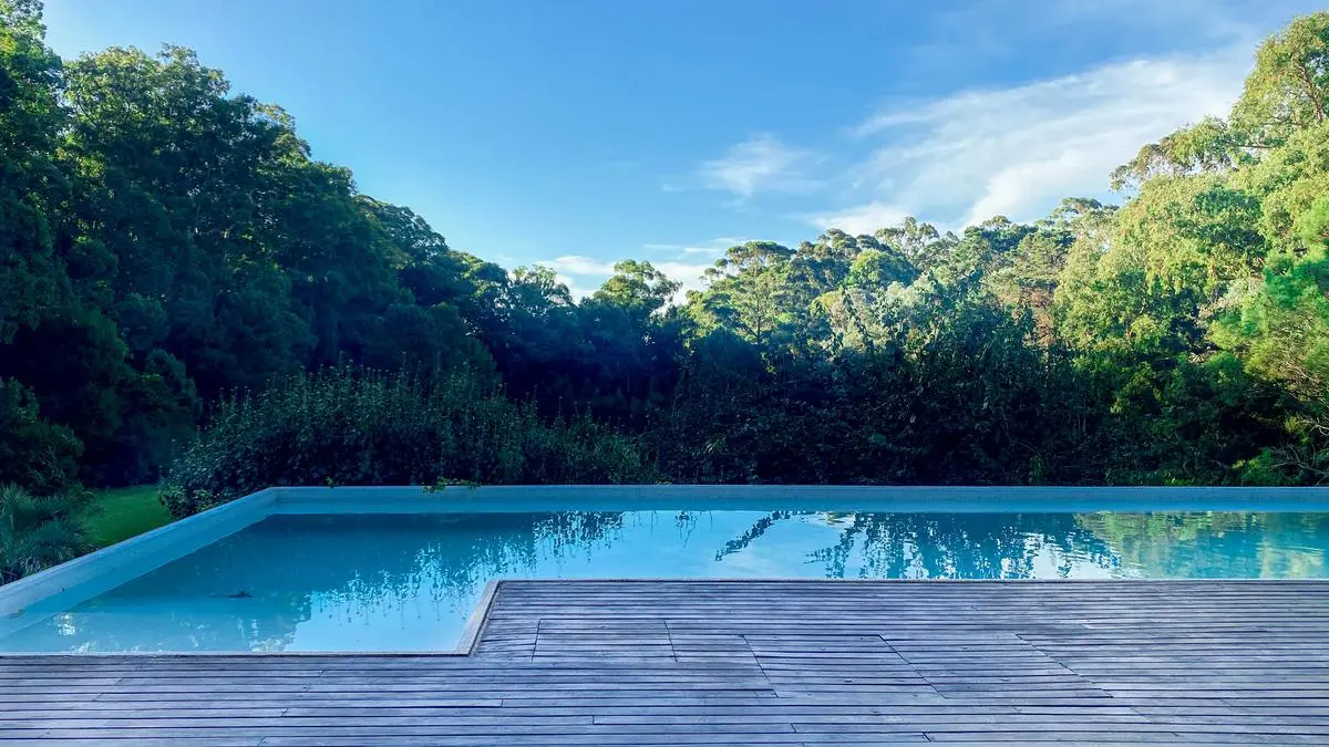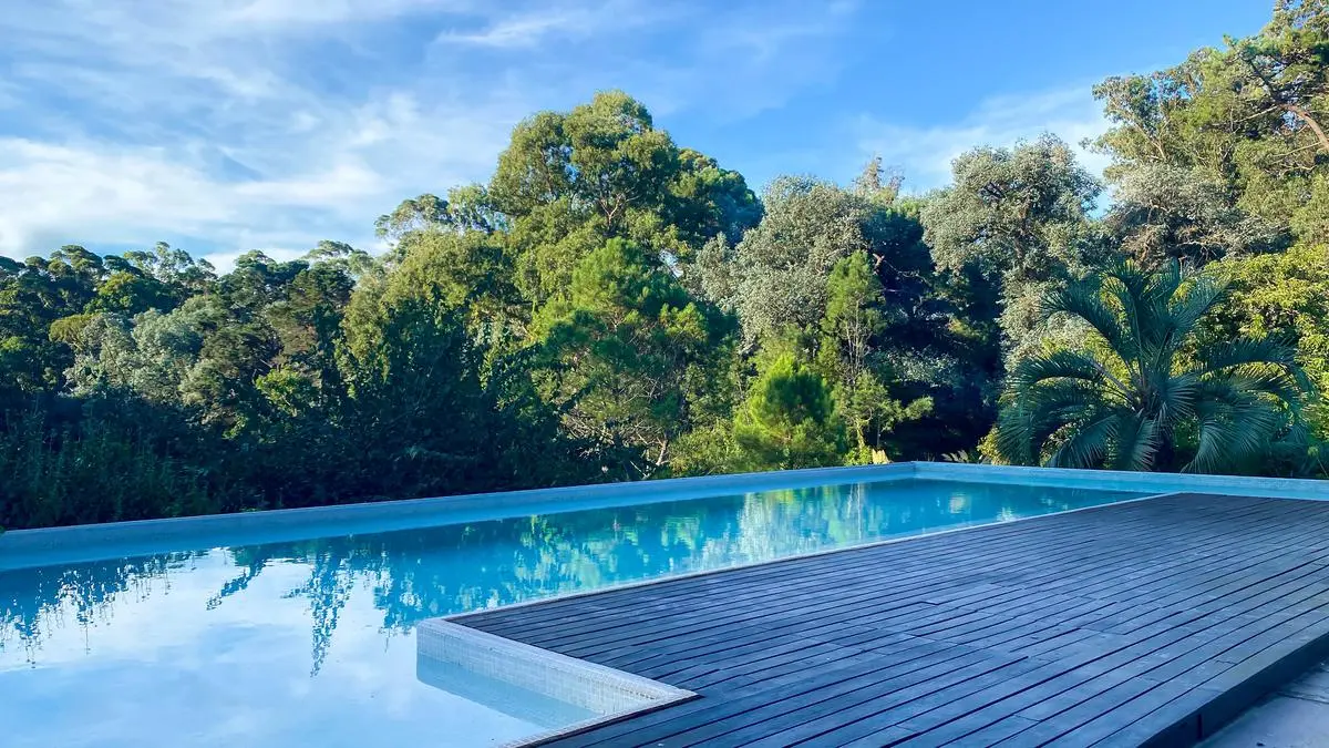Construida en altura, la casa goza de vistas privilegiadas, potenciadas por una piscina infinity que se funde con el entorno verde.