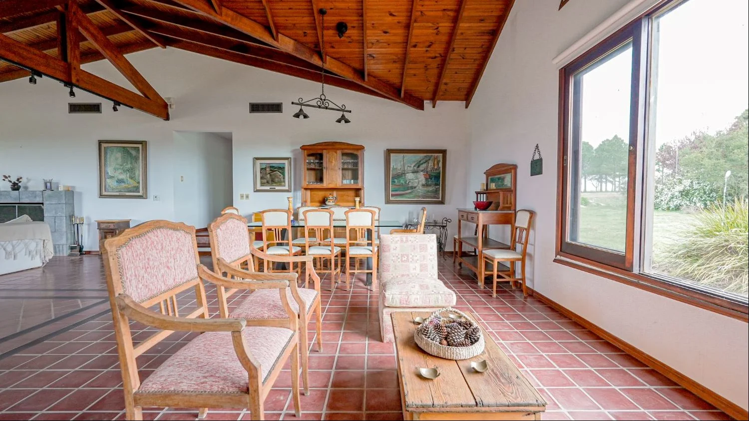 Gran living comedor con estufa a leña, techo a doble altura y ventanales al este y oeste, que integran el entorno natural.