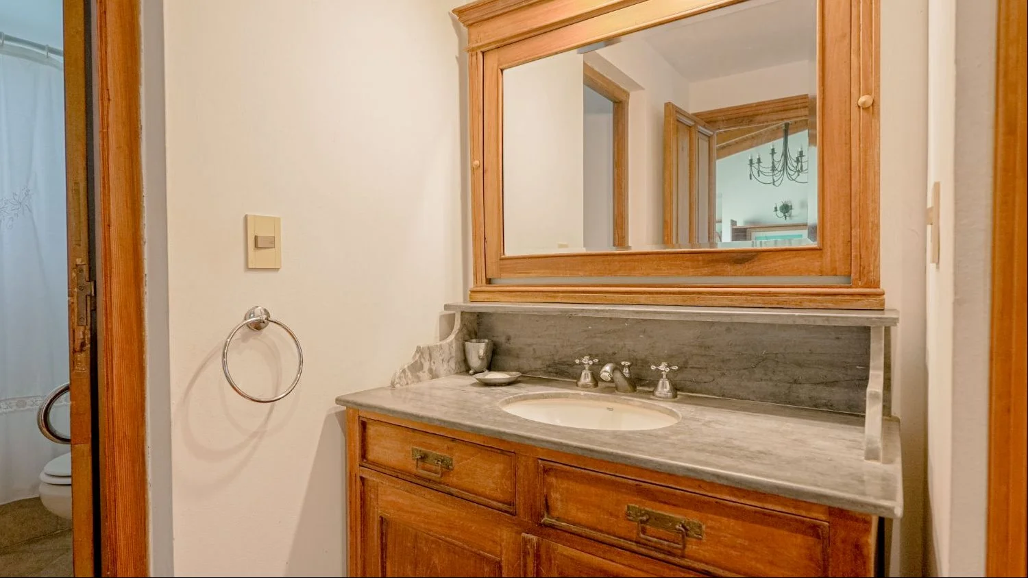 Casa de caseros con living comedor, cocina, dos dormitorios y baño, más un tercer cuarto con baño independiente.