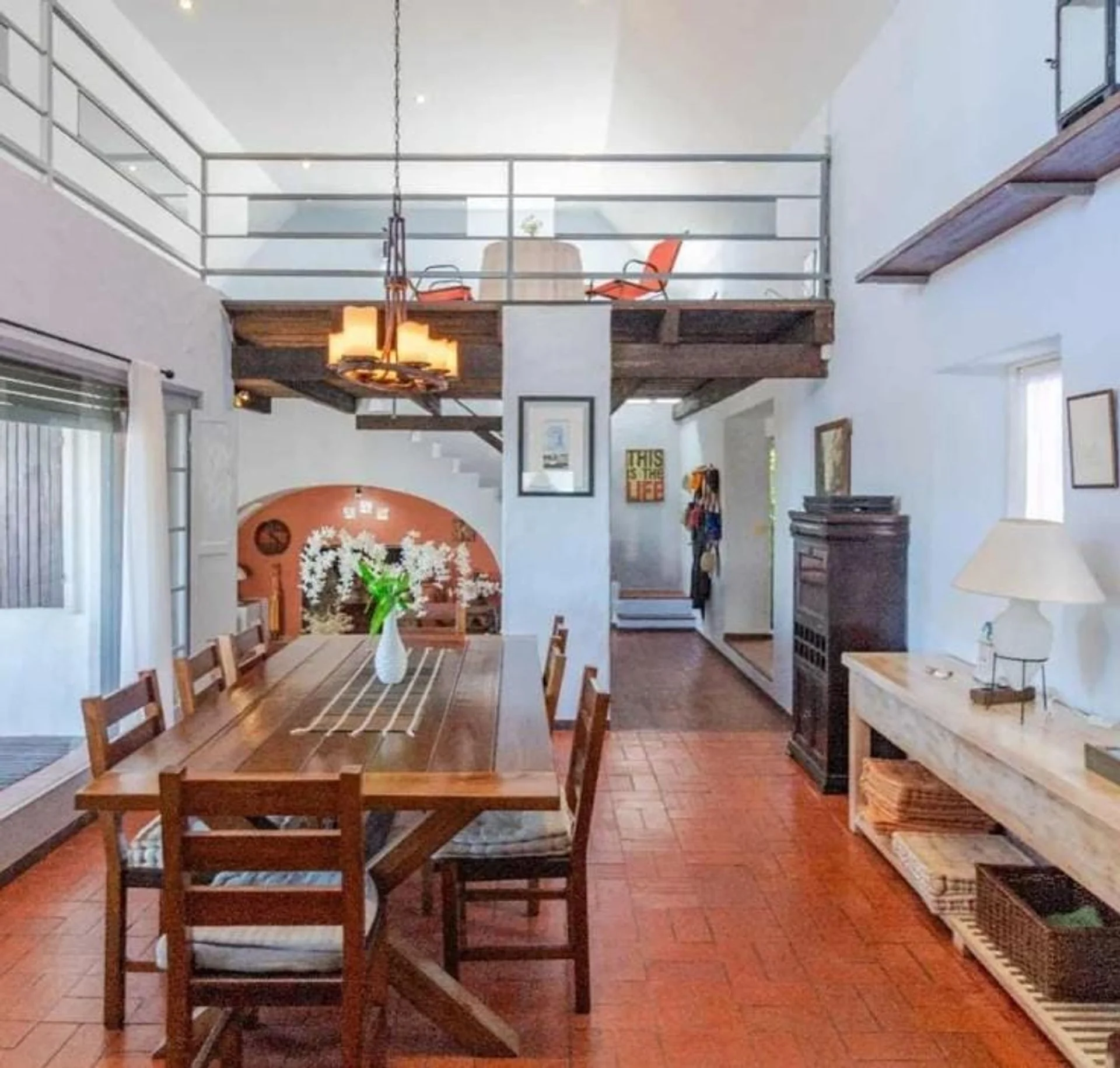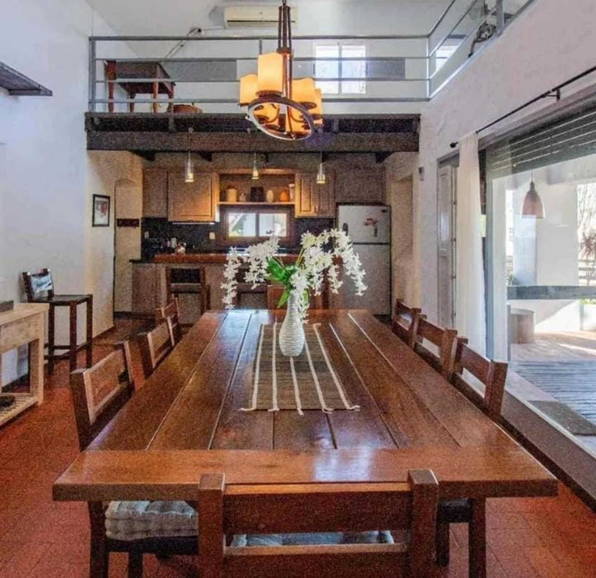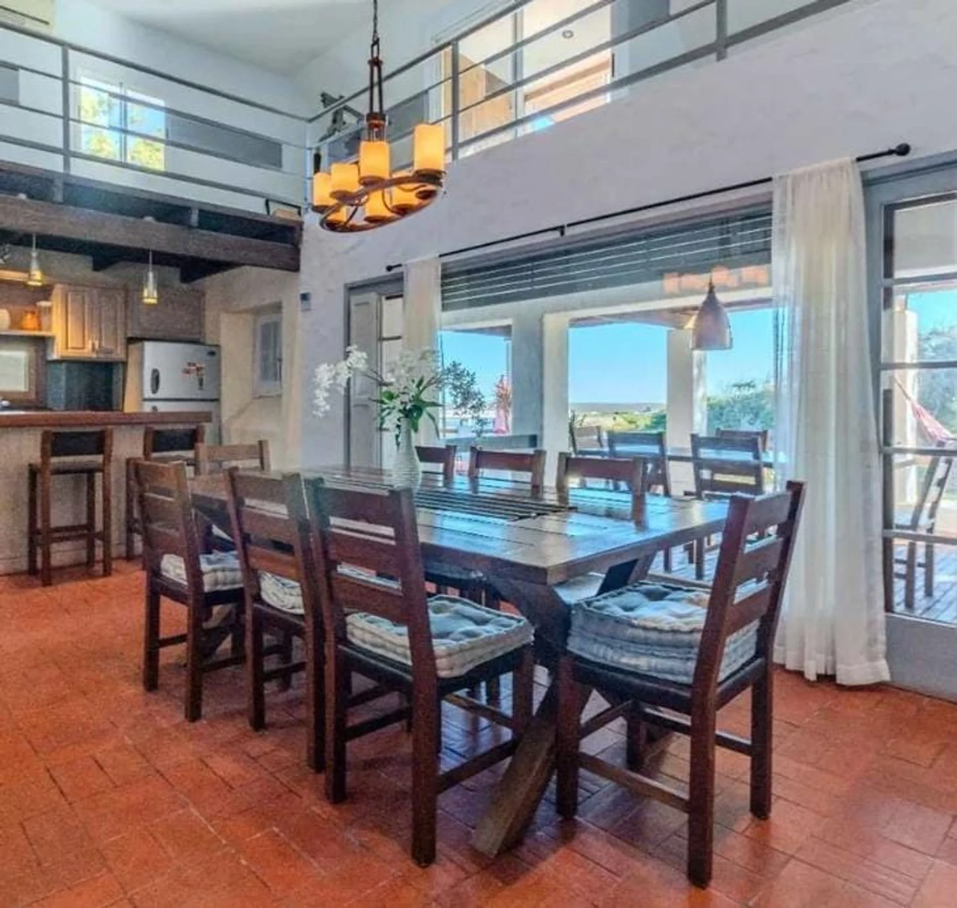 Distribuida en dos plantas, la planta baja cuenta con un espacioso hall de entrada, un luminoso living con un entrepiso y una terraza con vistas panorámicas. También cuenta con un comedor con vistas a la cañada, una cocina equipada con desayunador diario y vista a la piscina. Además, dispone de tres dormitorios en suite y un toilette, todo ello decorado para ofrecer espacios cálidos y acogedores.