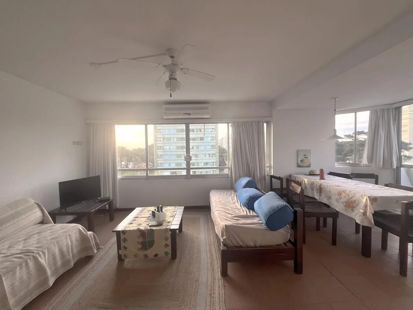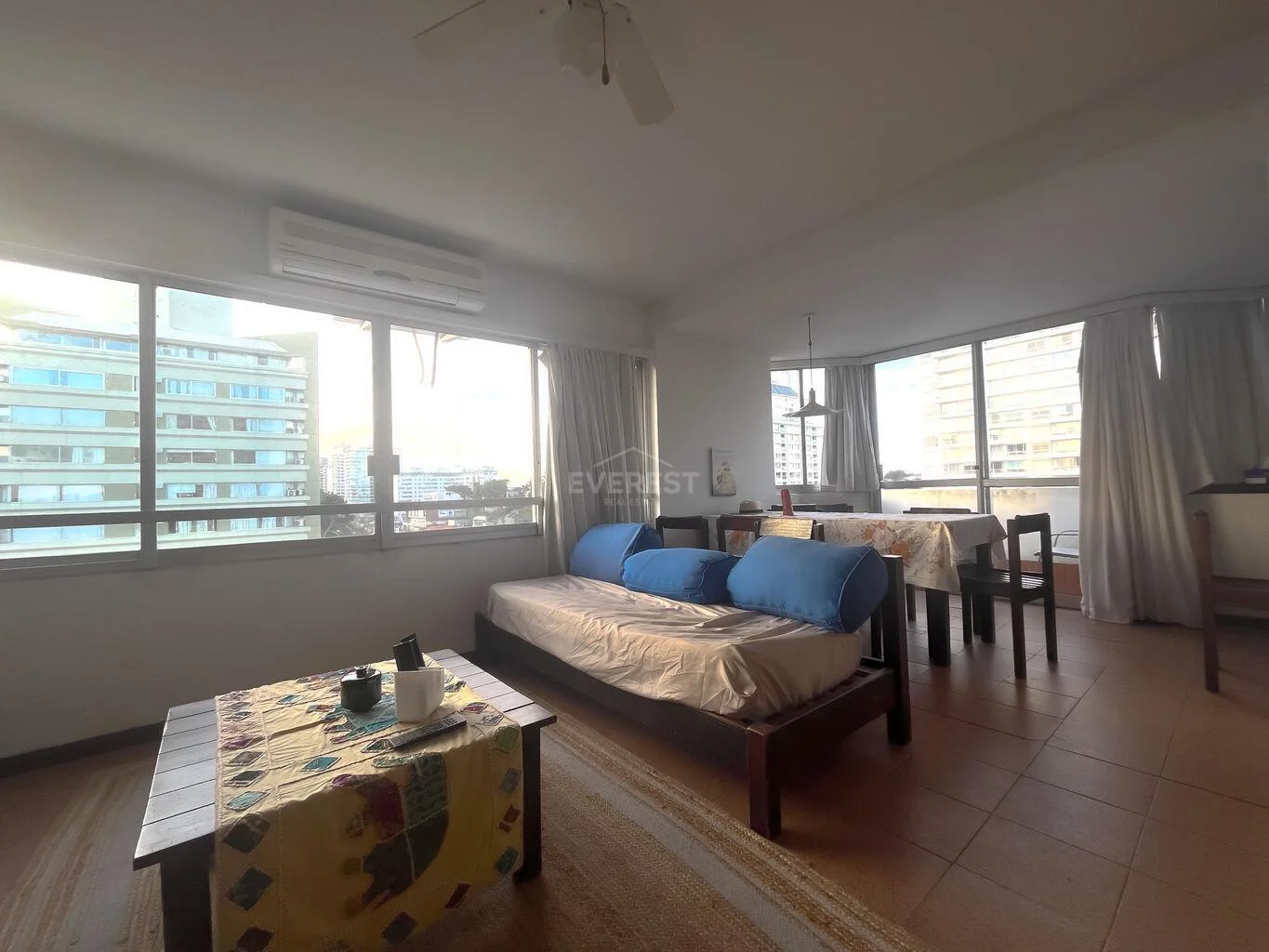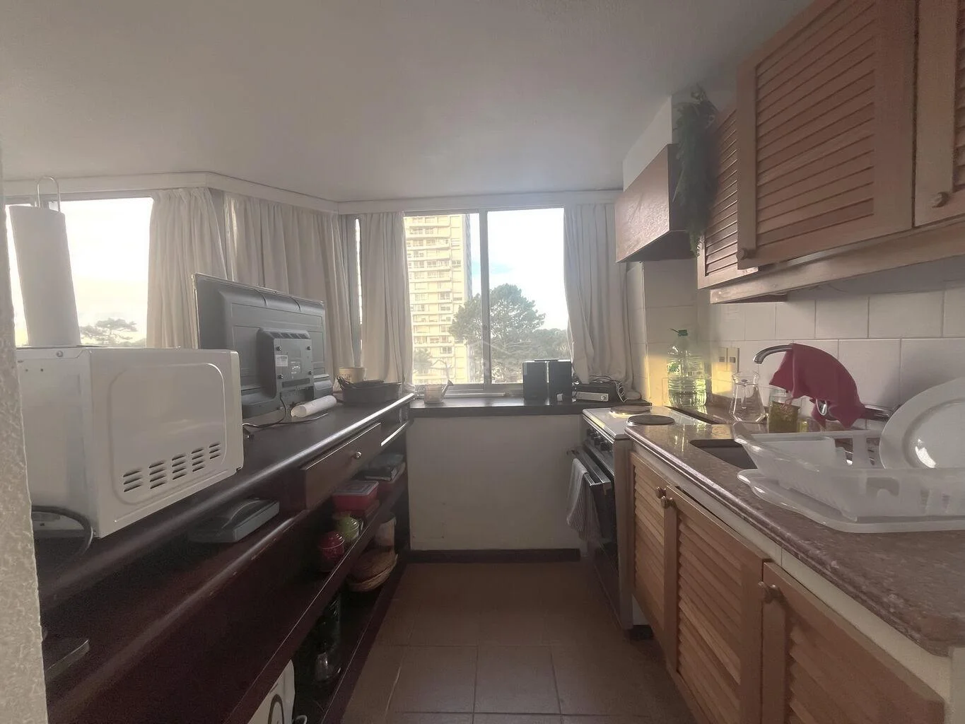 Amplio living comedor con cocina integrada con salida a terraza, orientación Norte. Mucho Sol