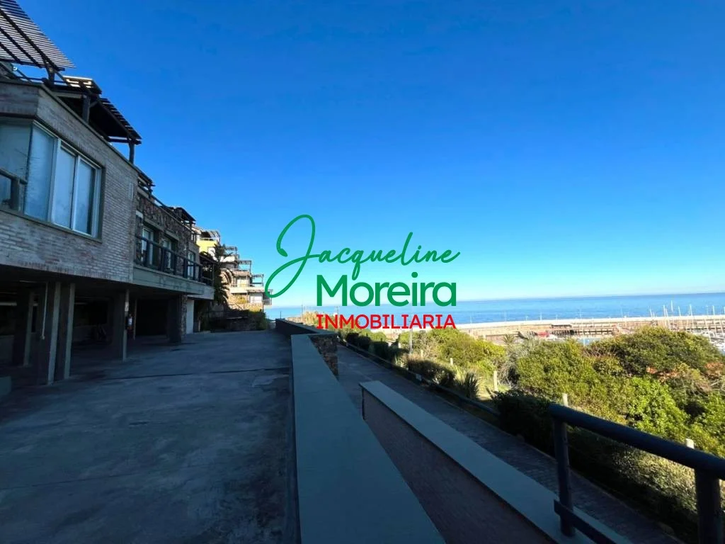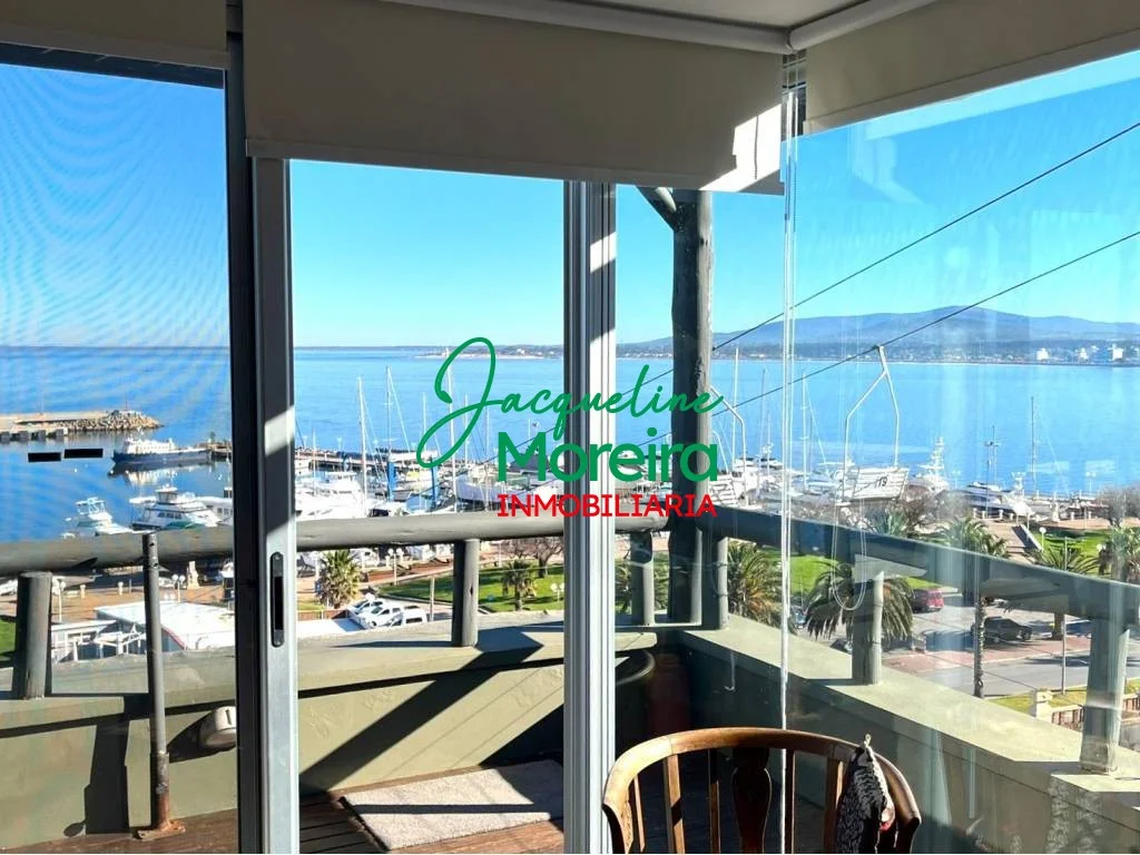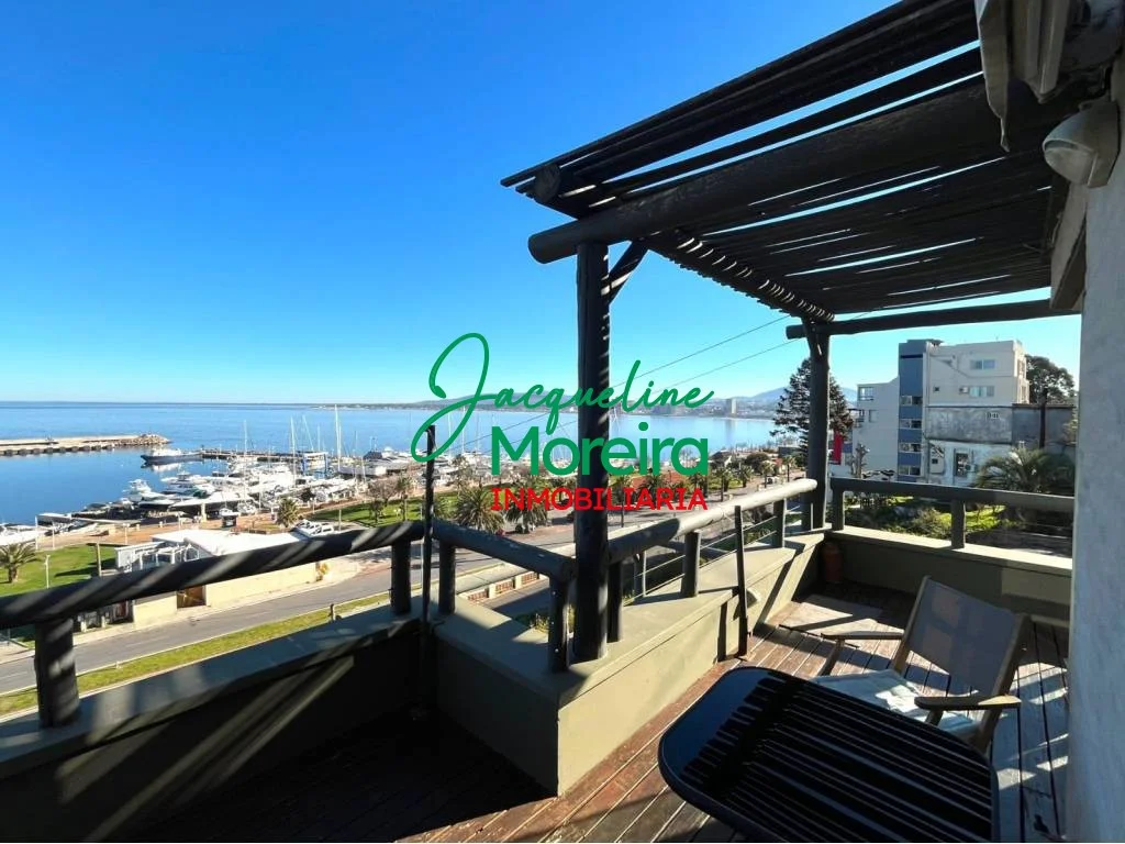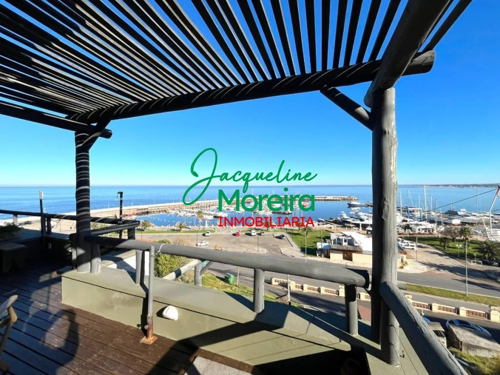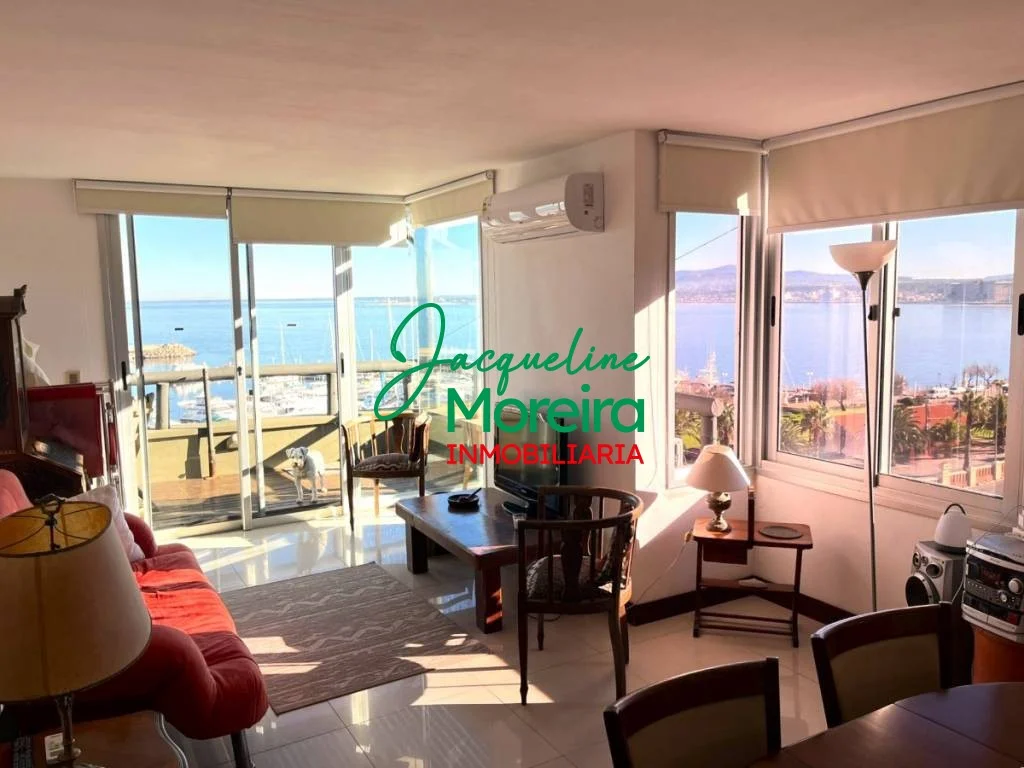Living-comedor-cocina integrado con amplios ventanales hacia una gran terraza con barbacoa a gas desde donde se puede disfrutar de una espectacular vista del mar, los cerros, el puerto y la bahía de Piriápolis.