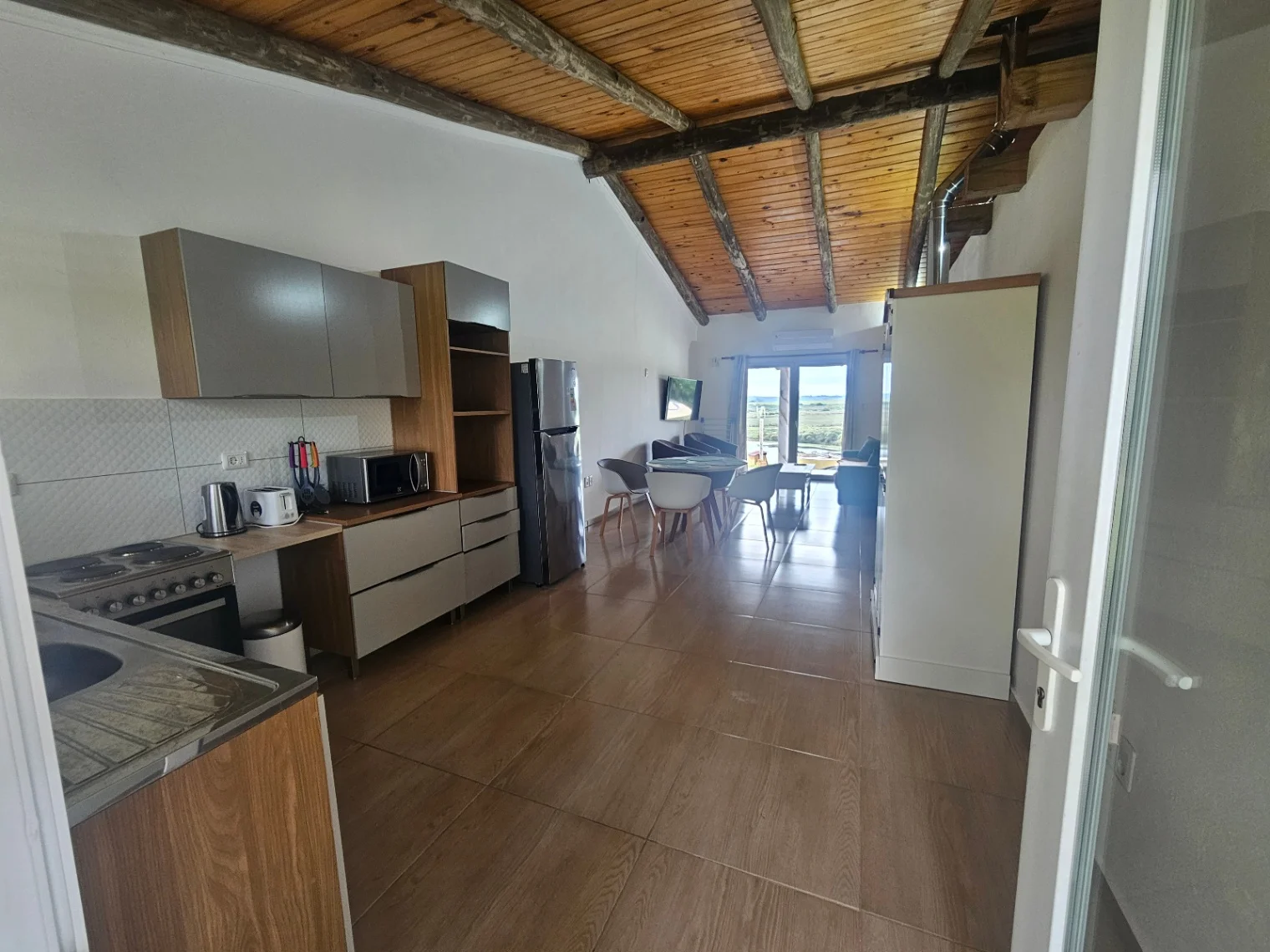 Los apartamentos tienen entrada independiente, por la puerta principal se ingresa a un amplio estar/comedor con cocina integrada, por el cuál a través de puertas vidriadas se sale directamente al área de la piscina con una increíble vista al parque y al lago.