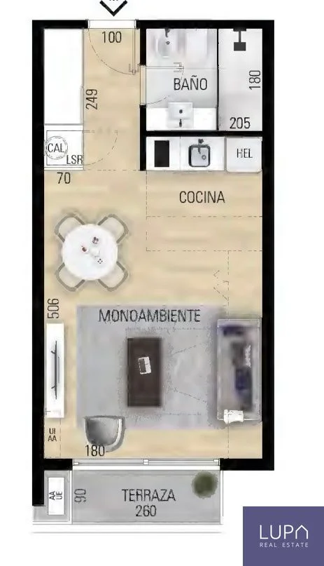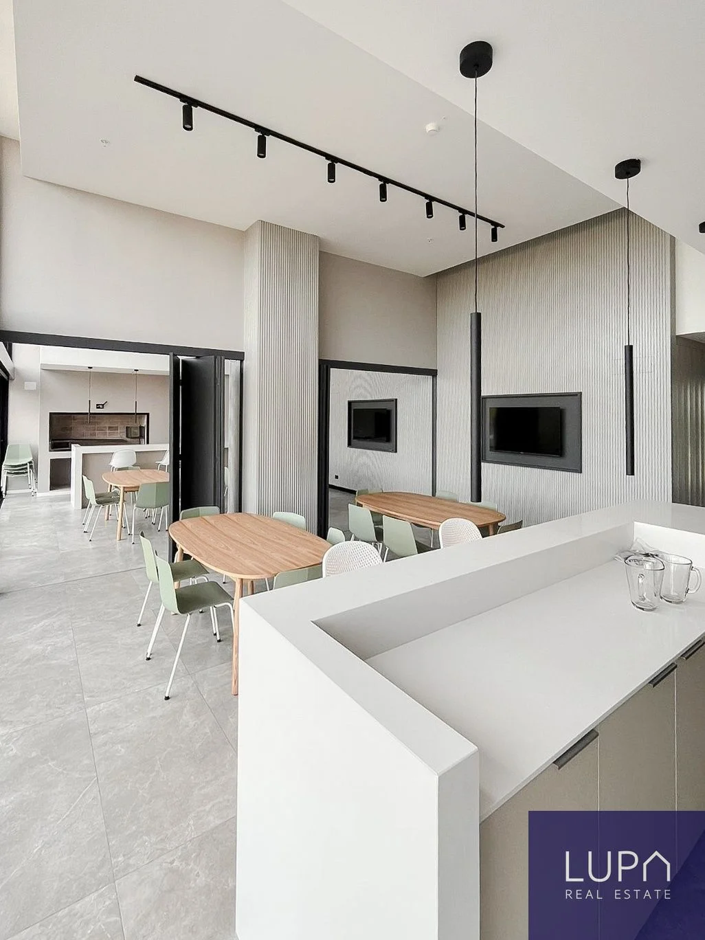 Diseñado con un enfoque en la comodidad y seguridad, el apartamento cuenta con una cocina equipada con anafe, horno y campana, ideal para quienes disfrutan de la gastronomía.