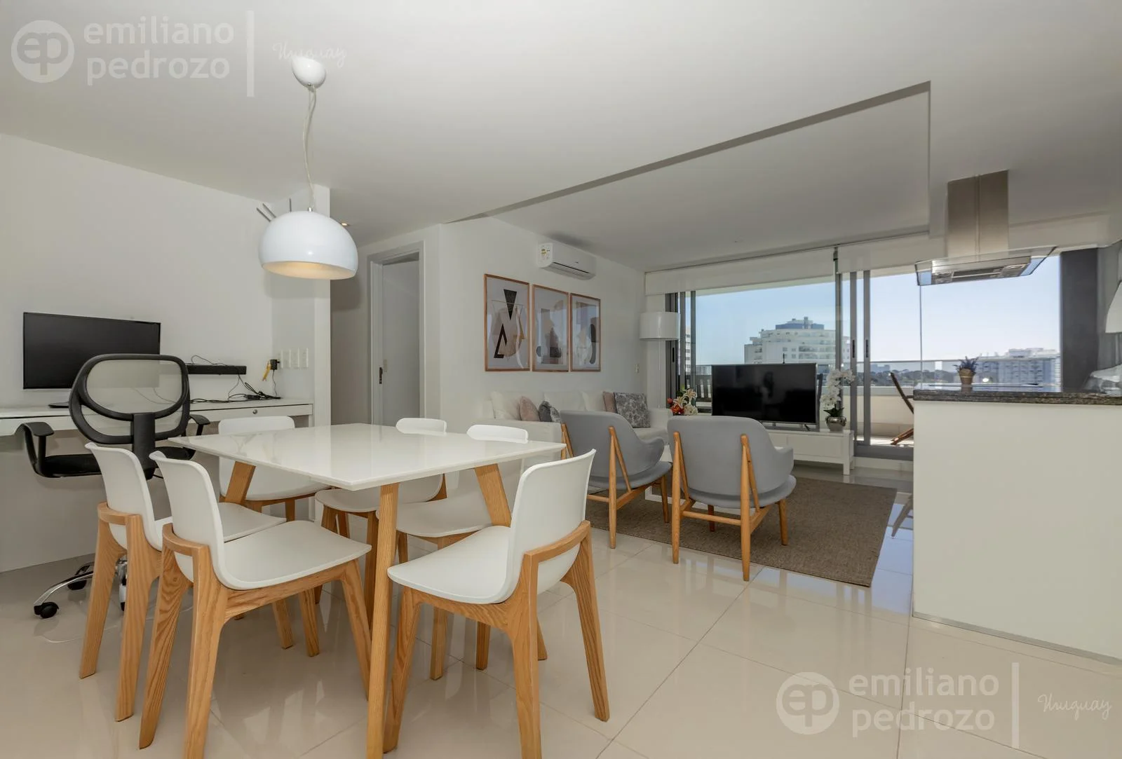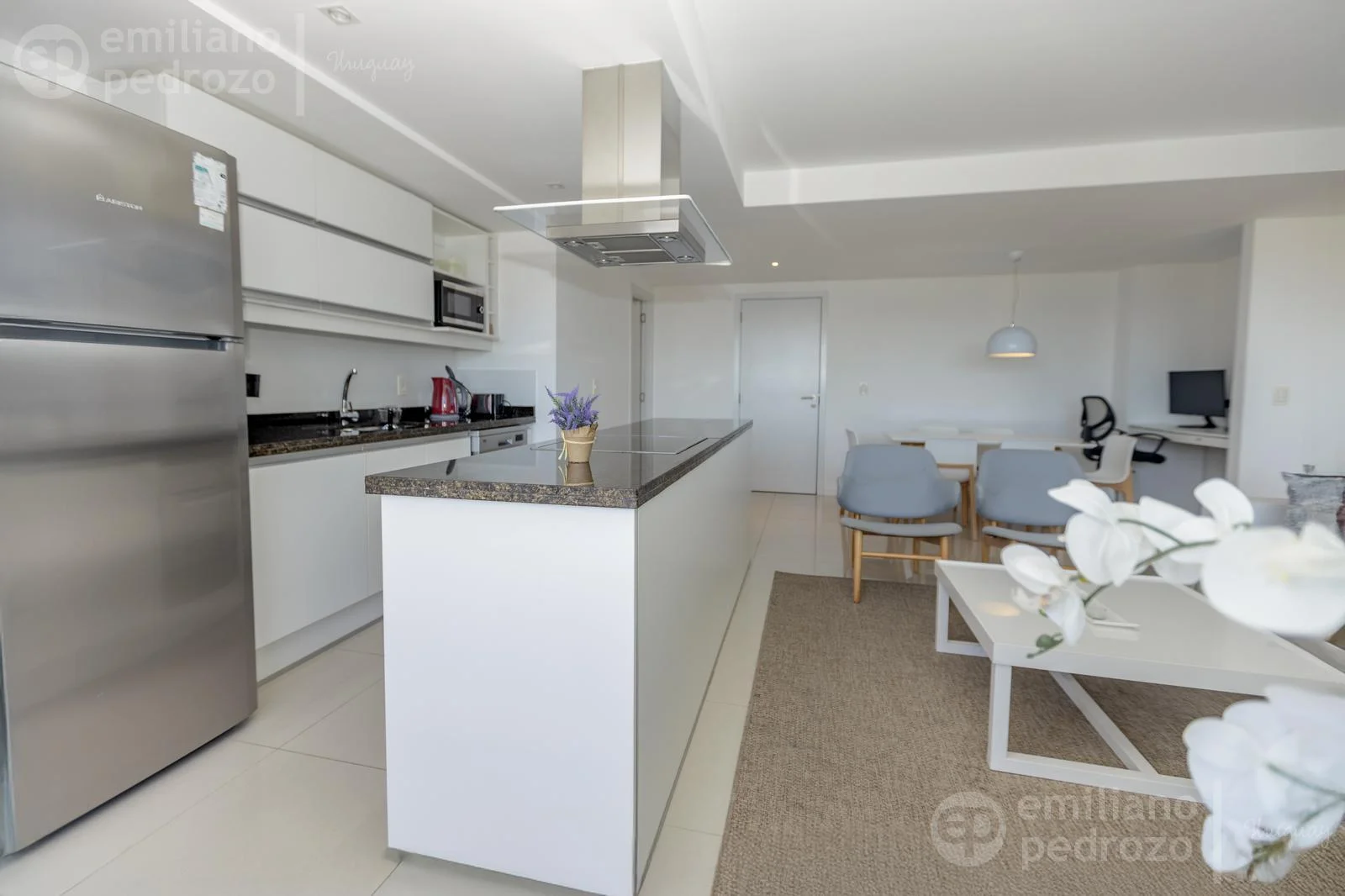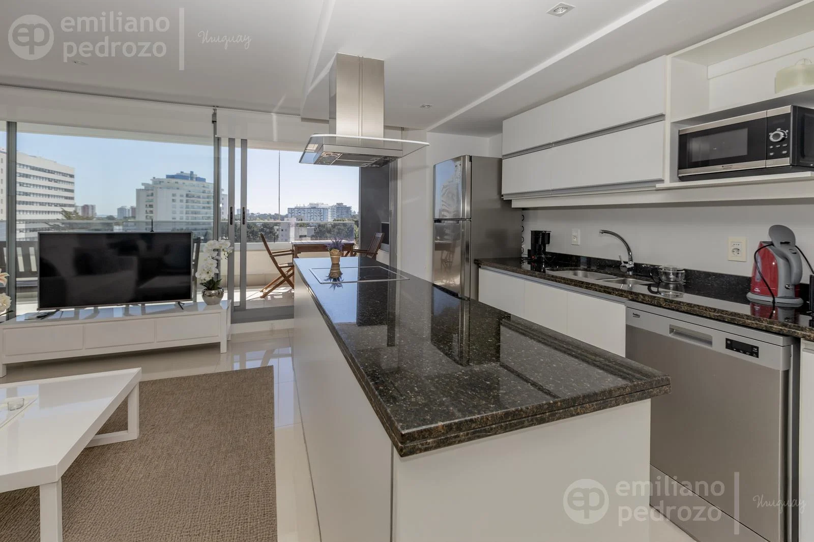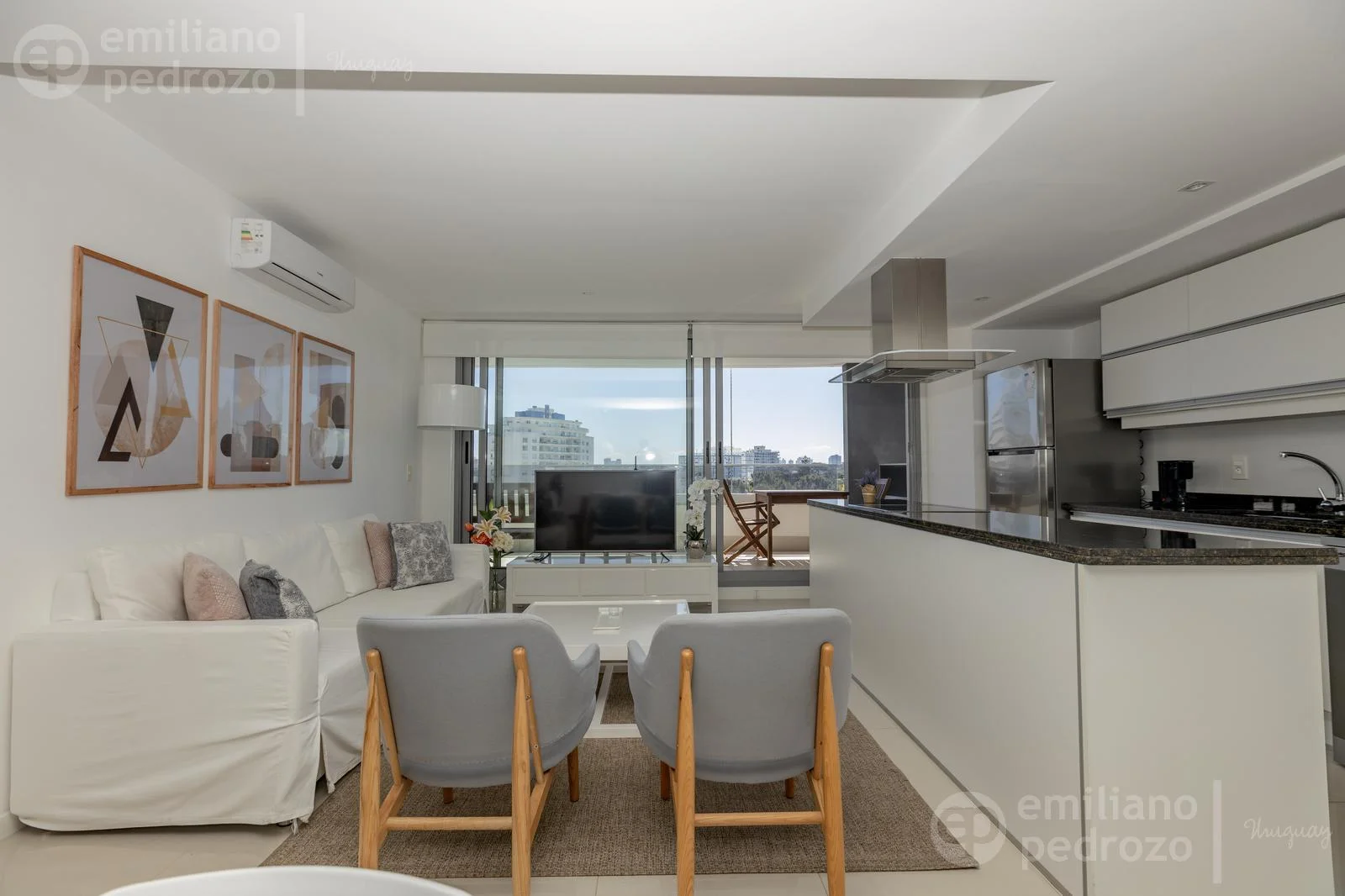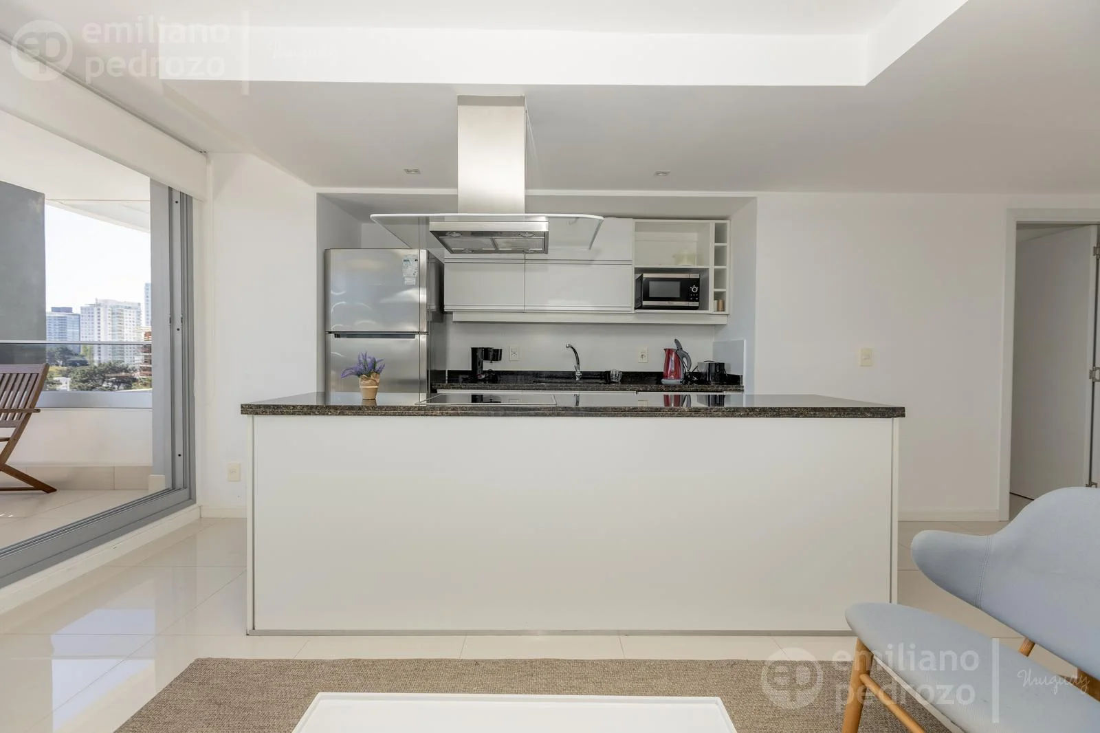 La unidad cuenta con un amplio y luminoso living-comedor con cocina integrada, totalmente equipada y diseñada para compartir momentos únicos en familia o con amigos. Se entrega completamente amueblado y equipado, con electrodomésticos y mobiliario importado, vajilla completa, ropa de cama y toallas (blanquería), y shades y blackouts en todas las ventanas, lo que garantiza privacidad y confort. Listo para habitar, en estado como nuevo.