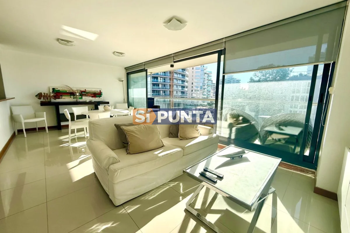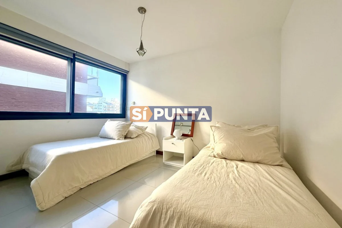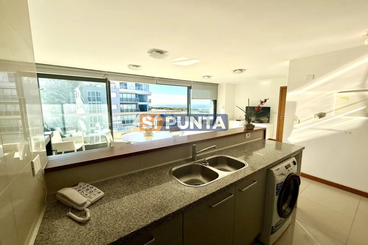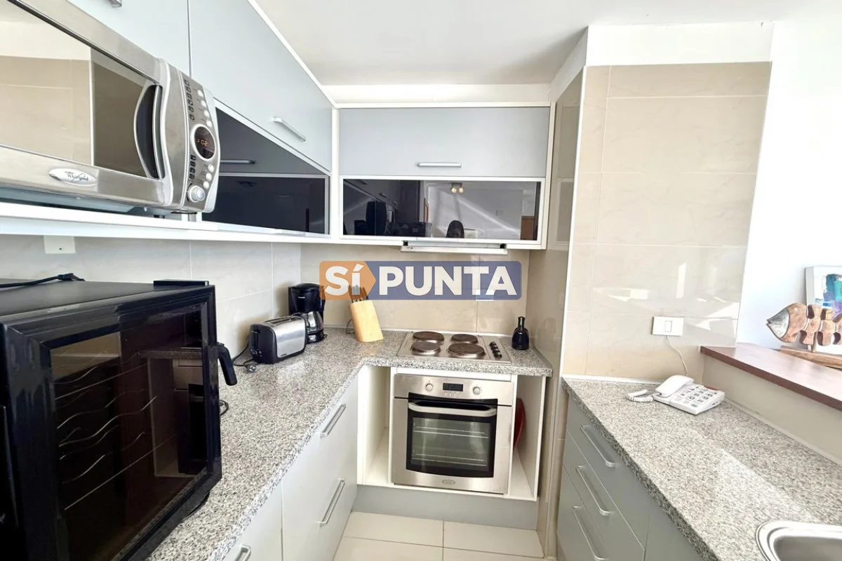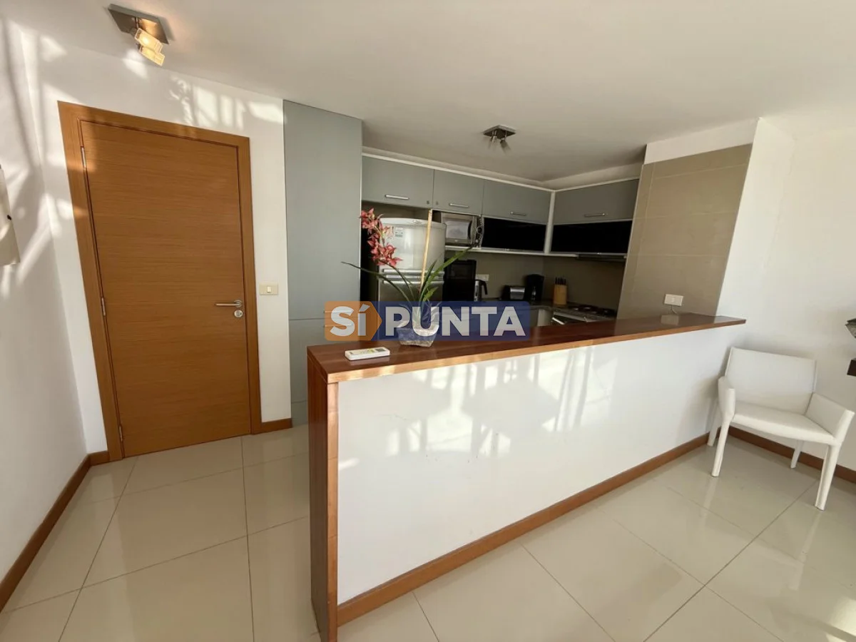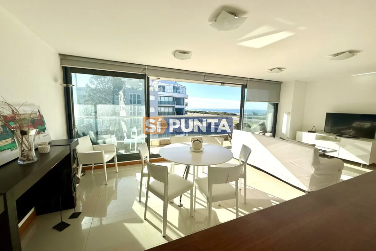 Edificio en primera línea de Playa Brava. Cuenta con vista al mar. Comodidades: - Living - Comedor - Cocina integrada - Terraza con parrillero propio - 2 Dormitorios (una suite) - 2 Baños - Aire acondicionado en todos sus ambientes - Losa Radiante - Garaje Amenities: Recepción, vigilancia, serv. de mucama, sauna, spa, solarium, parrillero, gimnasio y piscina climatizada Referencia Interna : Tera-263