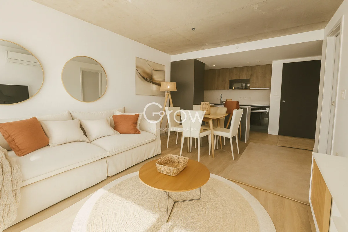 La planta se ubica en un piso medio. La misma, es frontal a la calle chiverta y se distribuye en 2 dormitorios (uno en suite), 2 baños y un amplio living comedor con una cocina integrada y salida a balcón espacioso.