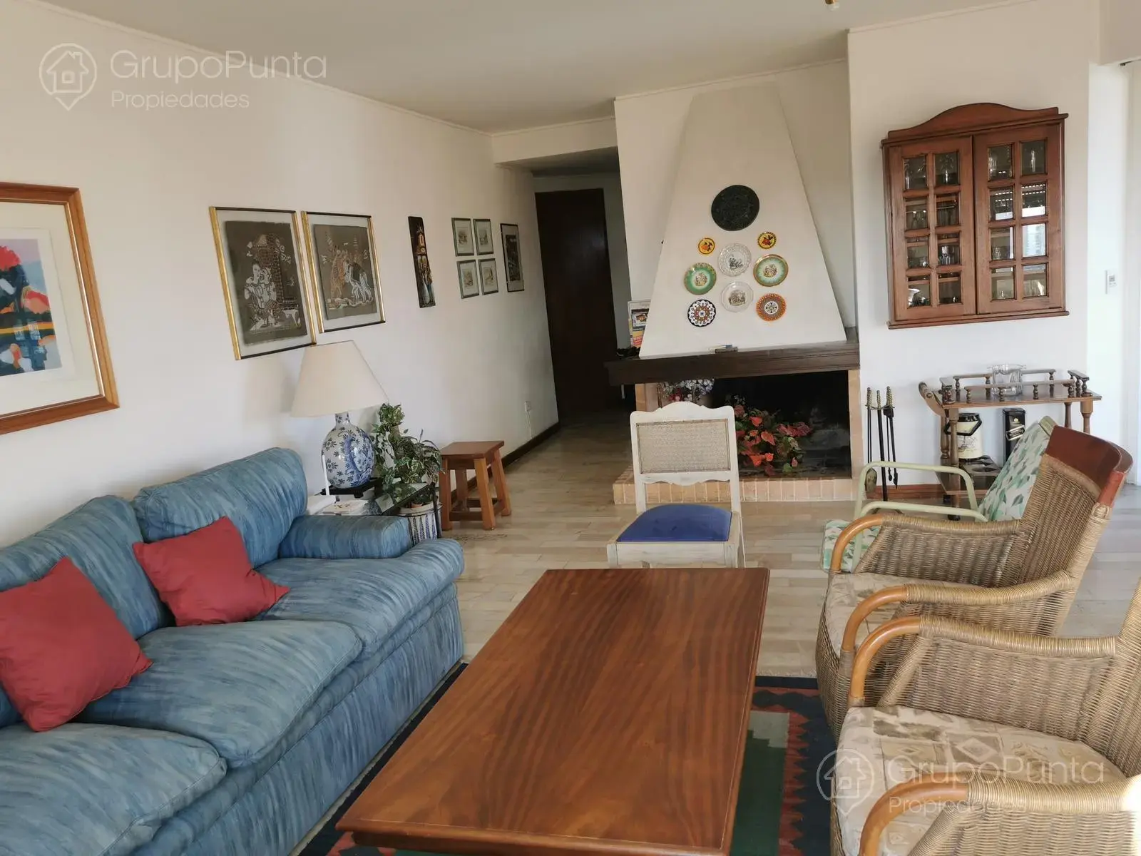 El apartamento ofrece un amplio living comedor con estufa a leña y balcón integrado.