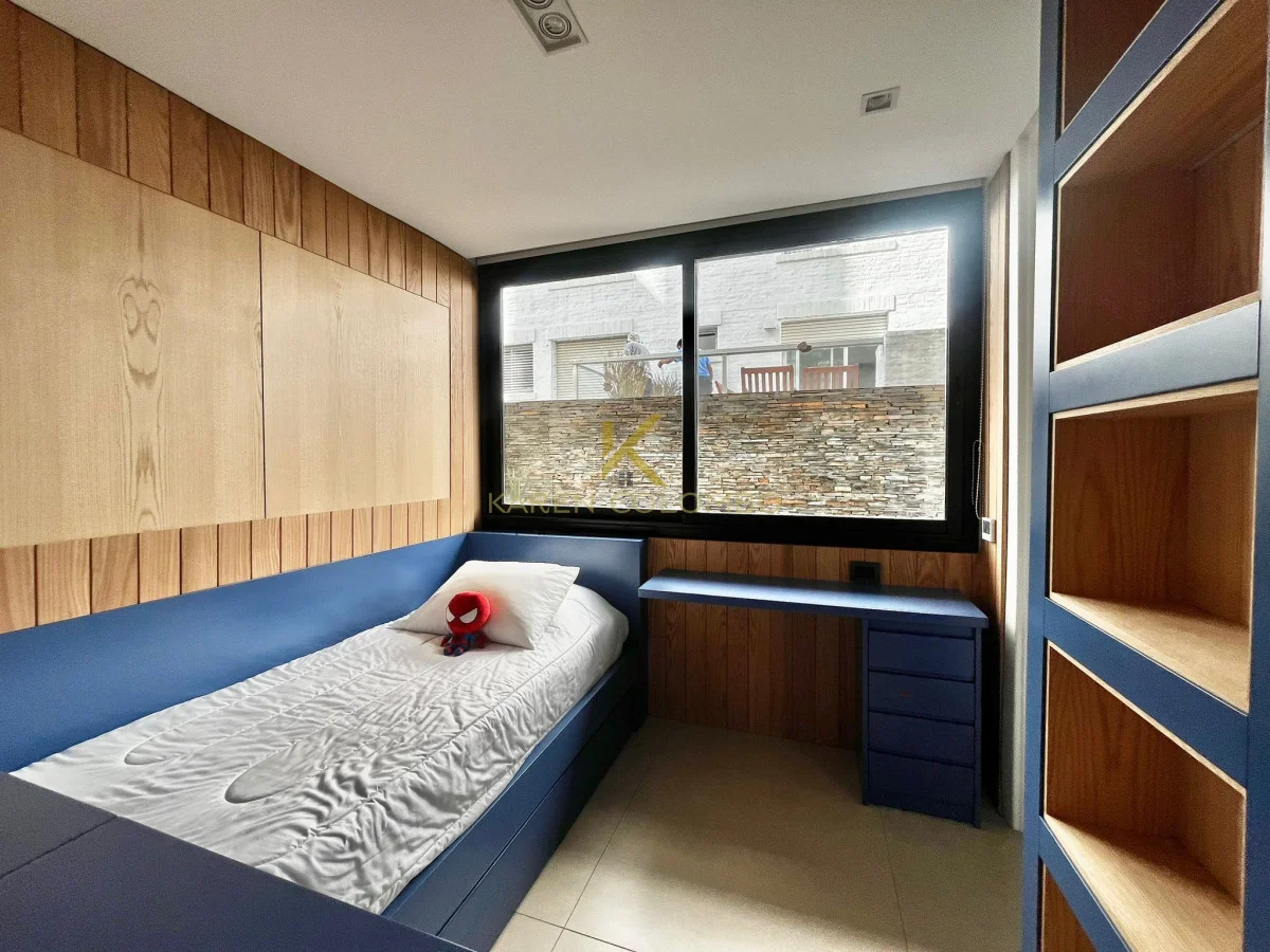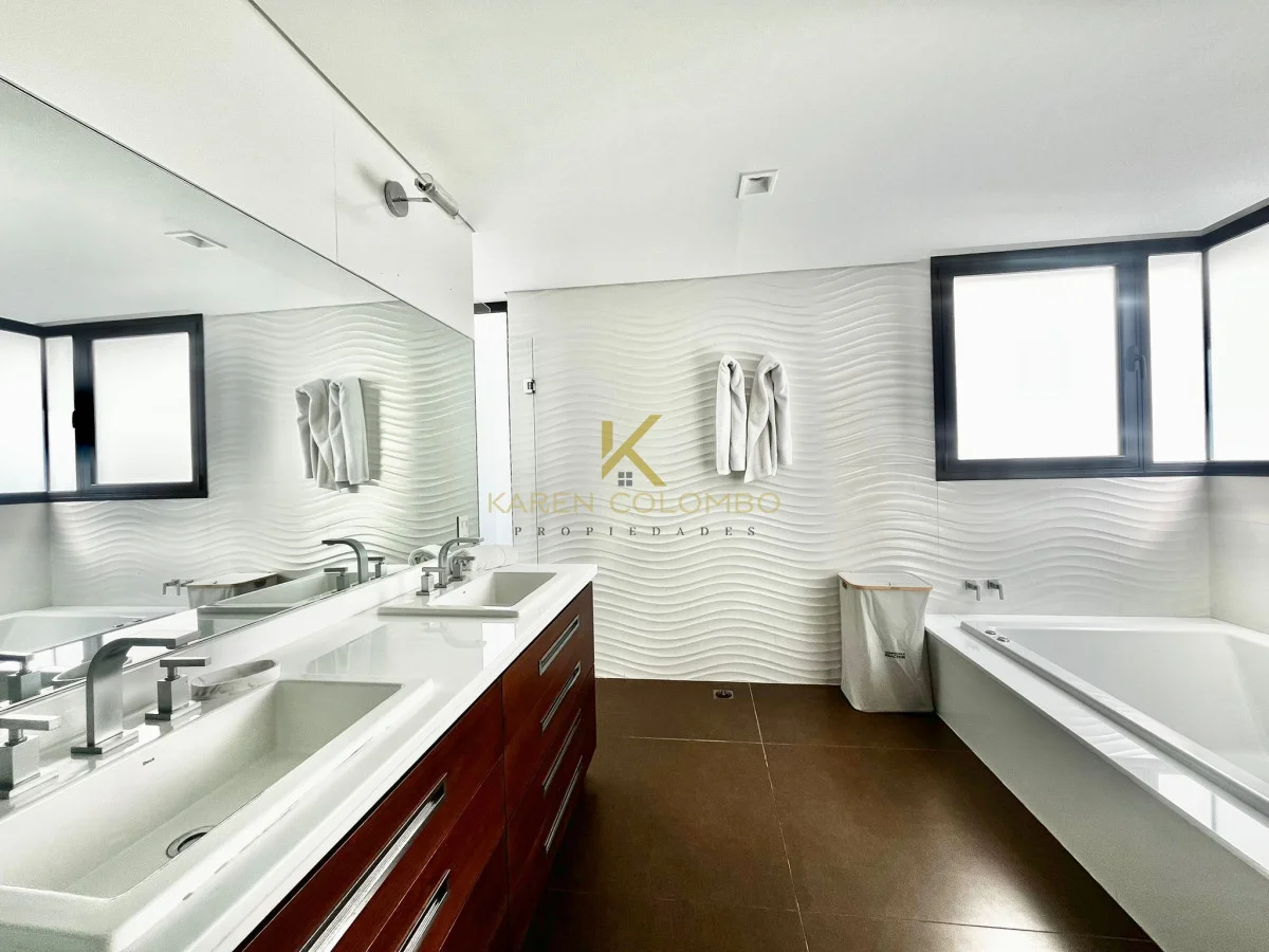 SI recorremos la unidad hacia el contra-frente disponemos de tres dormitorios en suite. La cocina es definida y con entrada de servicio, lavadero y dependencia con baño. Toda la unidad esta finamente equipada. Para acceder a la misma se hace desde recepción en un ascensor privado que directamente para en el living. Además, cuenta con triple cochera para sus vehículos.