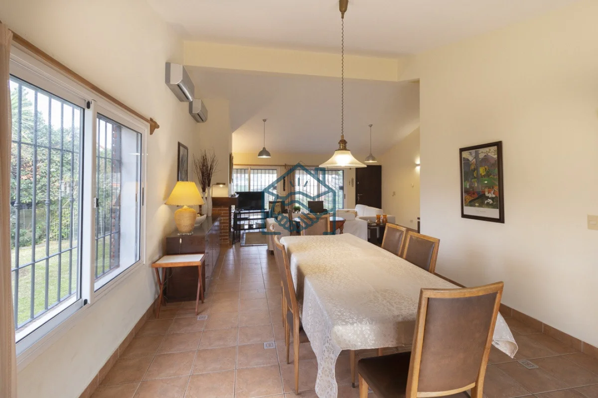 4 dormitorios, 2 en suite, 3 baños, losa radiante mas aires acondicionado en todos los dormitorios. lavarropas y aire acondicionado. Todo bien equipado, mas Bungalow independiente de la casa para servicio o para chicos, 2 ambientes con camas cuchetas, baño completo con calefón, lavarropas y aire acondicionado. Todo bien equipado.