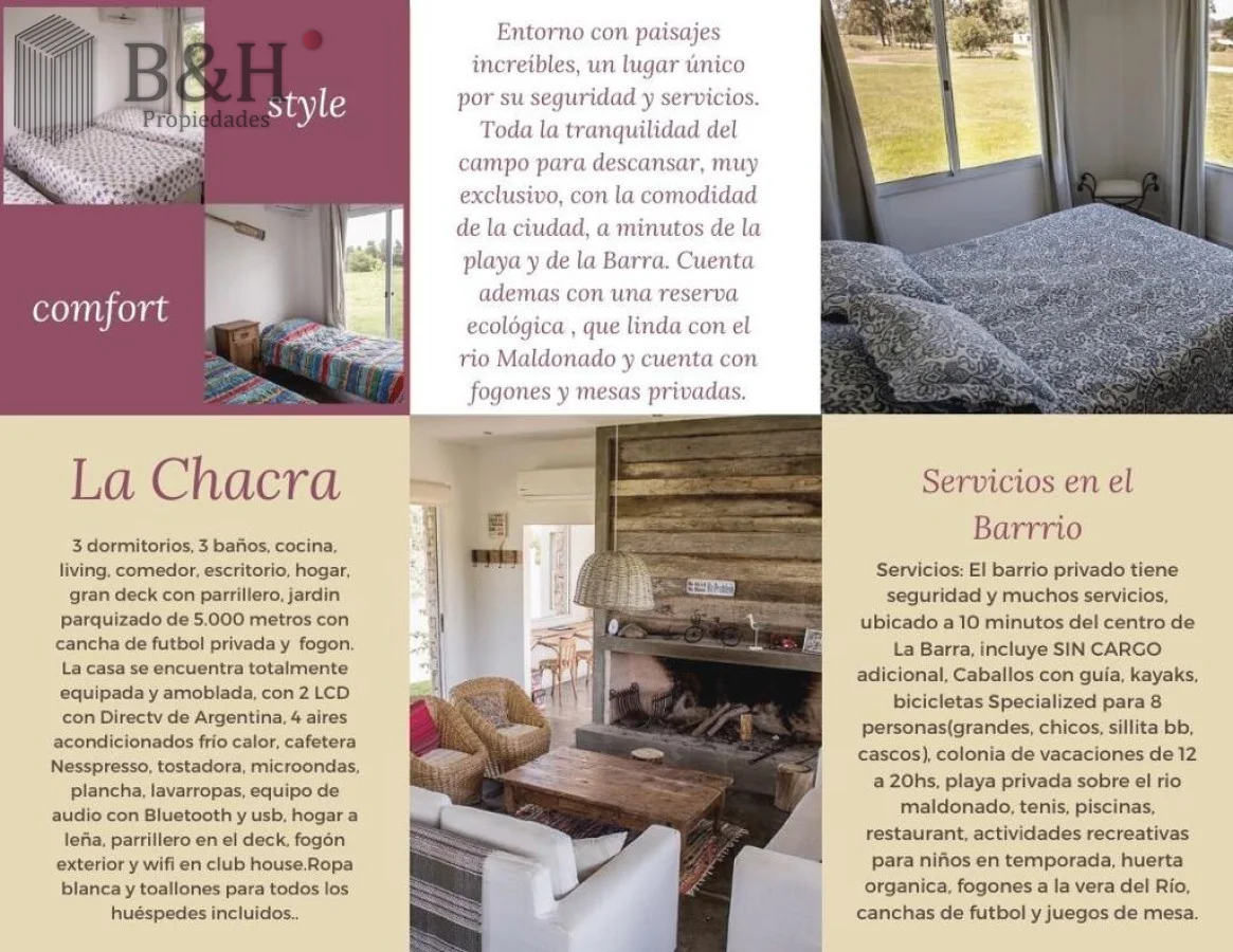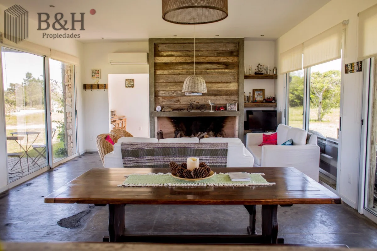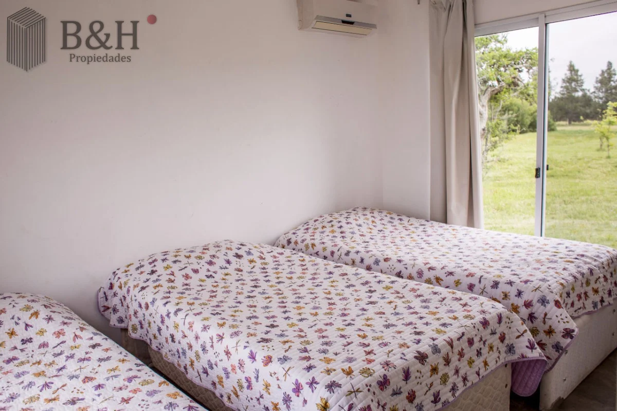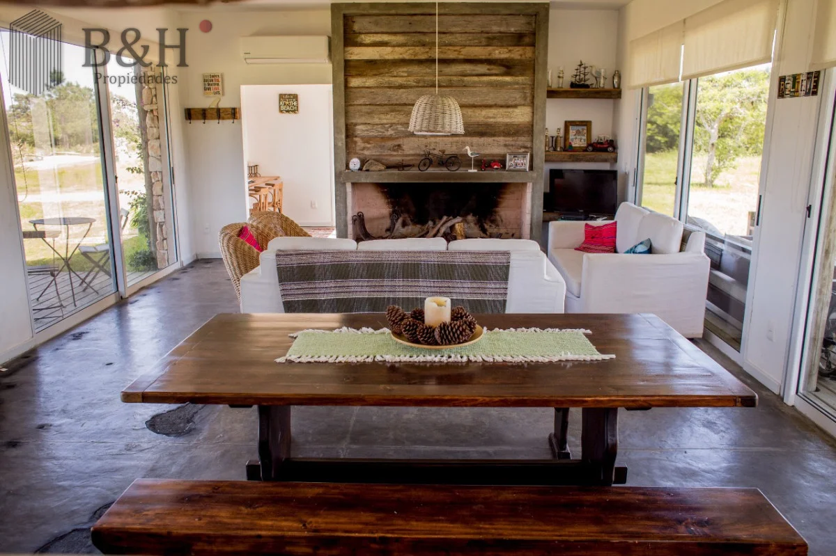 Cuenta con 3 Dormitorios, uno de ellos en suite, 2 Baños, cocina con barra, living comedor, parrillero y estacionamiento. Aire acondicionado en todos los dormitorios y en living. Galería muy cómoda techada con parrillero. Equipamiento: Aire acondicionado - Estufa a leña - T.V. - Heladera - Microondas. Ubicada cerca del Club House. Terreno : 5000 m2 Edificado : 200 m2 Amenities Seguridad 24 hs Red Eléctrica Semi-Subterránea Red de Agua Propia Club House Restaurante Huerta Orgánica Piscina Sectorizada Colonia de Verano Casa de Huéspedes Cancha de Tenis Cabalgatas Separación de Residuos Kayaks Playita Asadores Referencia Interna : Tera-615