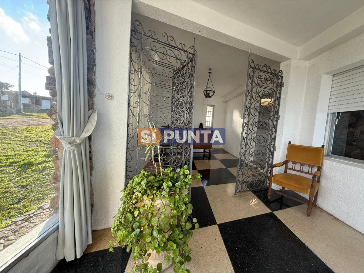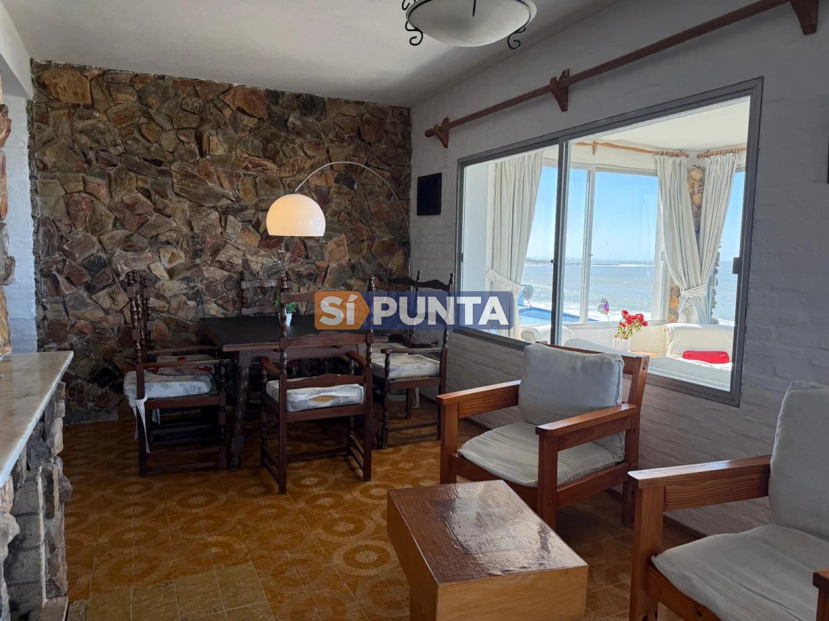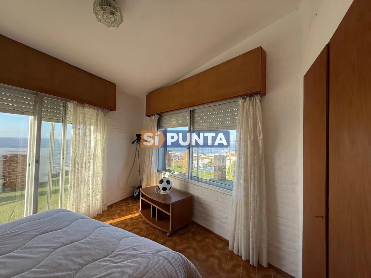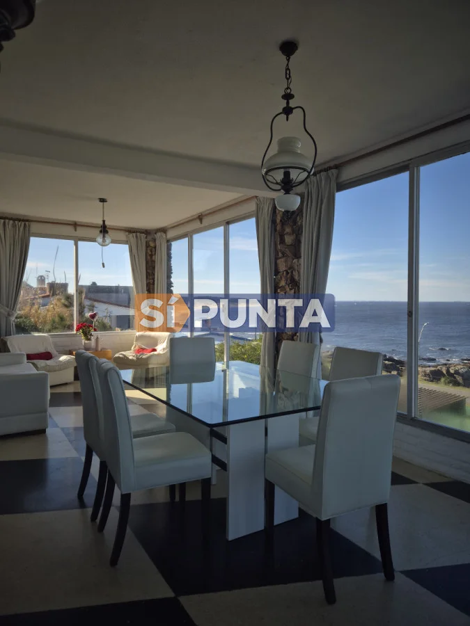 La casa, distribuida en dos plantas, fue diseñada para maximizar las vistas al mar. Su espacioso living cuenta con amplios ventanales que enmarcan una vista de 180 grados de toda la bahía, abarcando incluso Punta del Este. Complementan la planta baja un acogedor comedor con estufa a leña, una cocina bien definida y un baño completo. En el nivel superior se encuentran los tres dormitorios y un baño completo, recientemente renovado. Un punto destacado es su generosa terraza en forma de L, ideal para disfrutar del paisaje sin interrupciones.