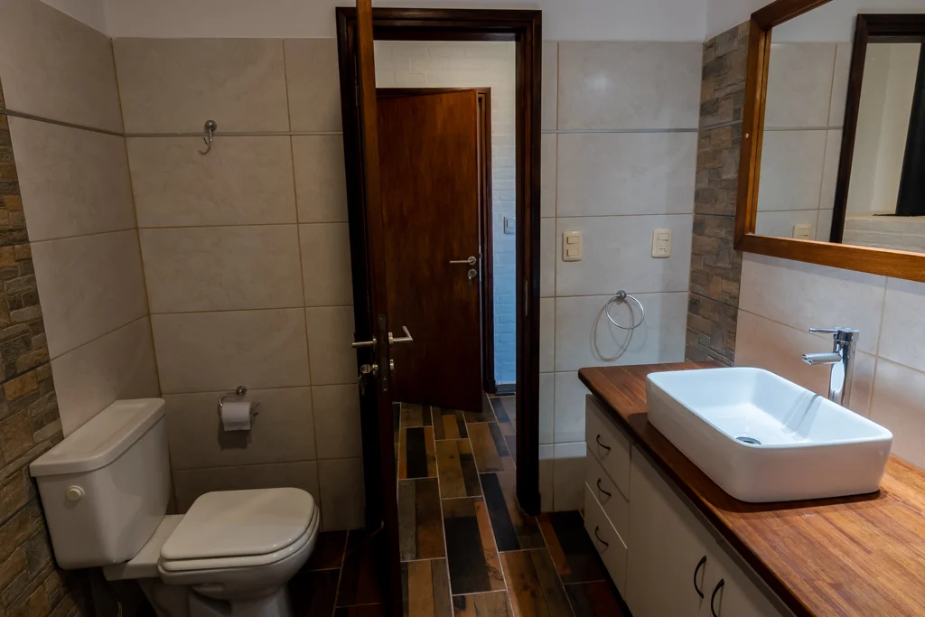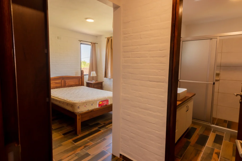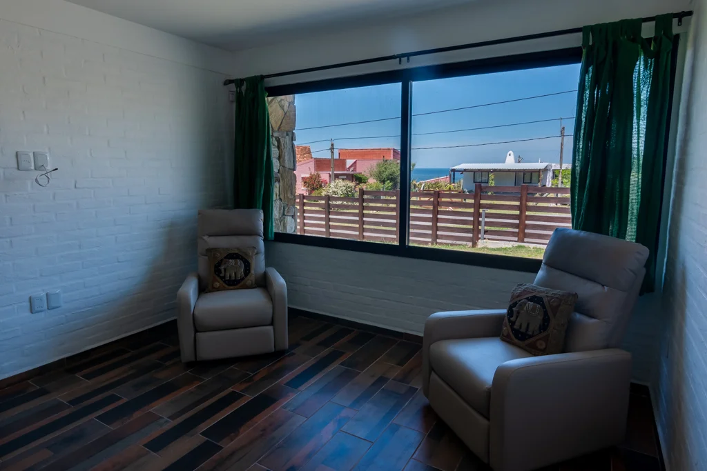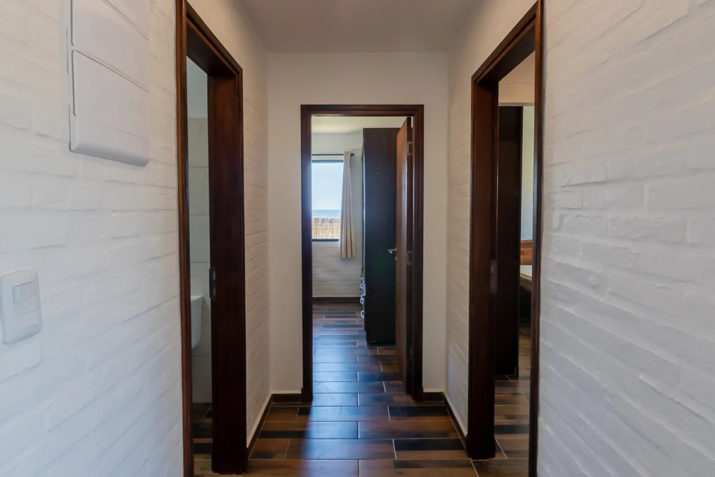 Mediante pasillo se accede al resto de la casa, la cual cuenta con dos baños, dos dormitorios ambos con parcial vista al mar y uno de ellos con baño en suite.