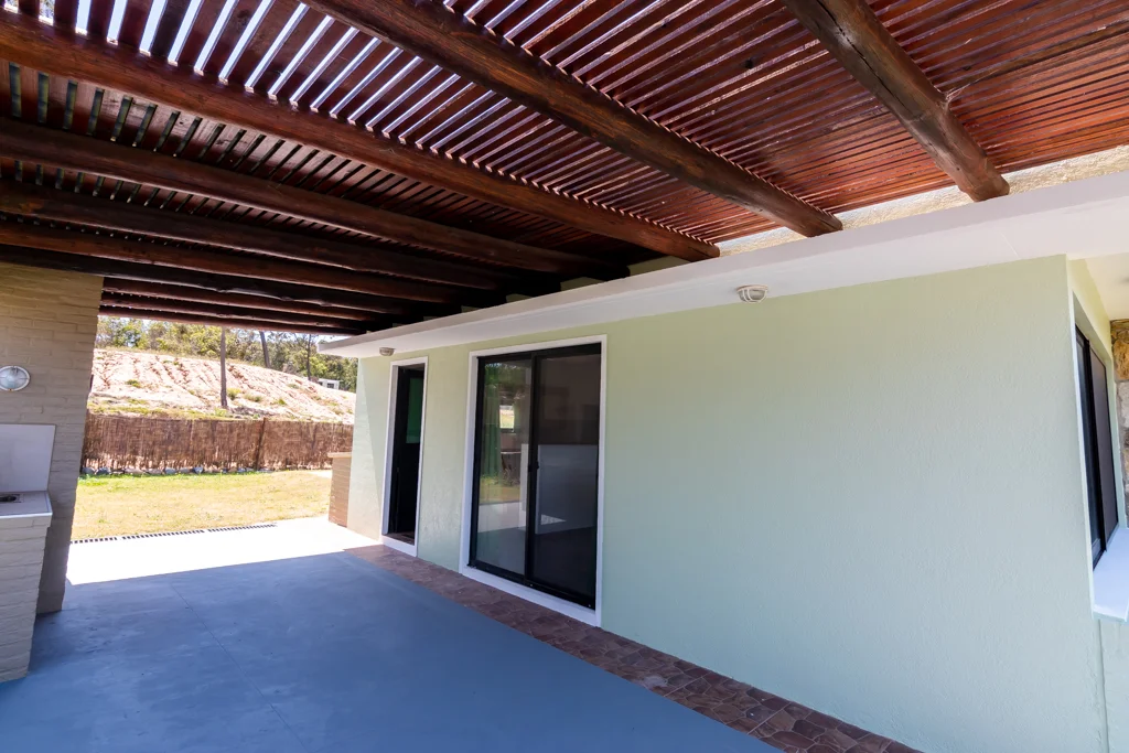 En el exterior, sobre el lateral izquierdo de la propiedad, parrillero techado con entrada para vehículo y al fondo, se contempla un espacio verde con piscina ideal para disfrutar en familia.