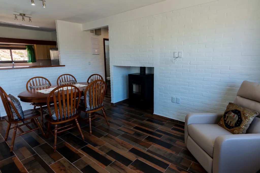 Living con estufa de alto rendimiento, comedor con cocina integrada limitada por barra desayunadora y muebles aéreos hechos a medida con mesada en granito.