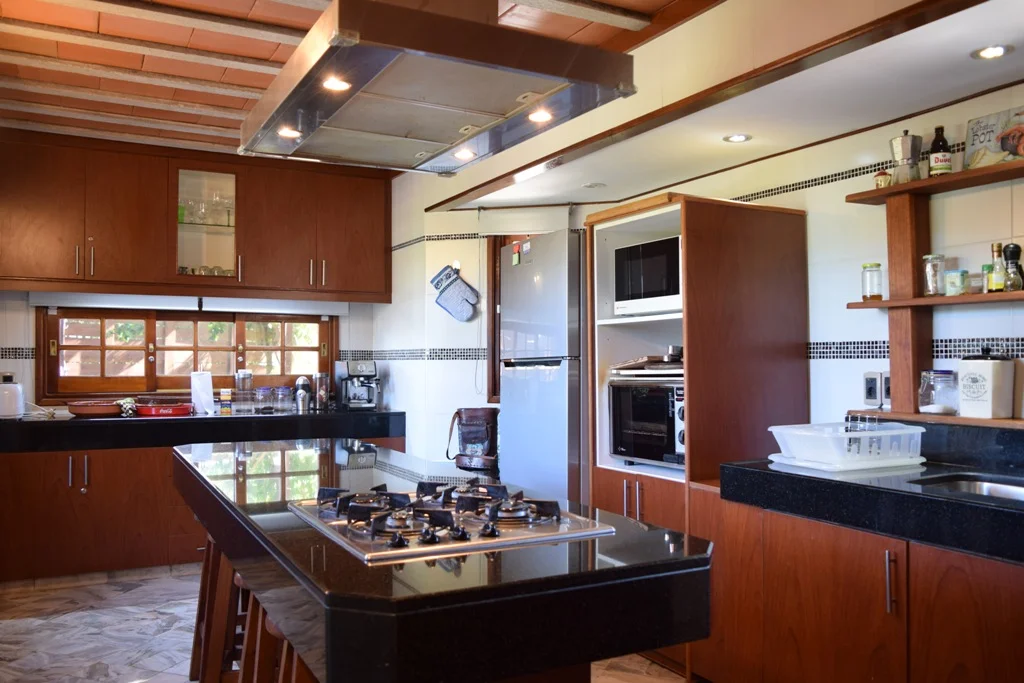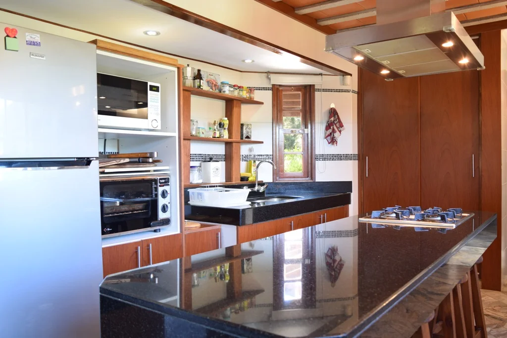 En planta baja cuenta con amplio living-comedor de importante estufa a leña tradicional y techo a doble altura dando la sensación de amplitud en el espacio principal de la vivienda, cocina con mesadas de granito, isla principal con anafe, horno de empotrar entre otros electrodomésticos de primera generación. Pasillo de distribución a dormitorio con placares empotrados y baño completo.