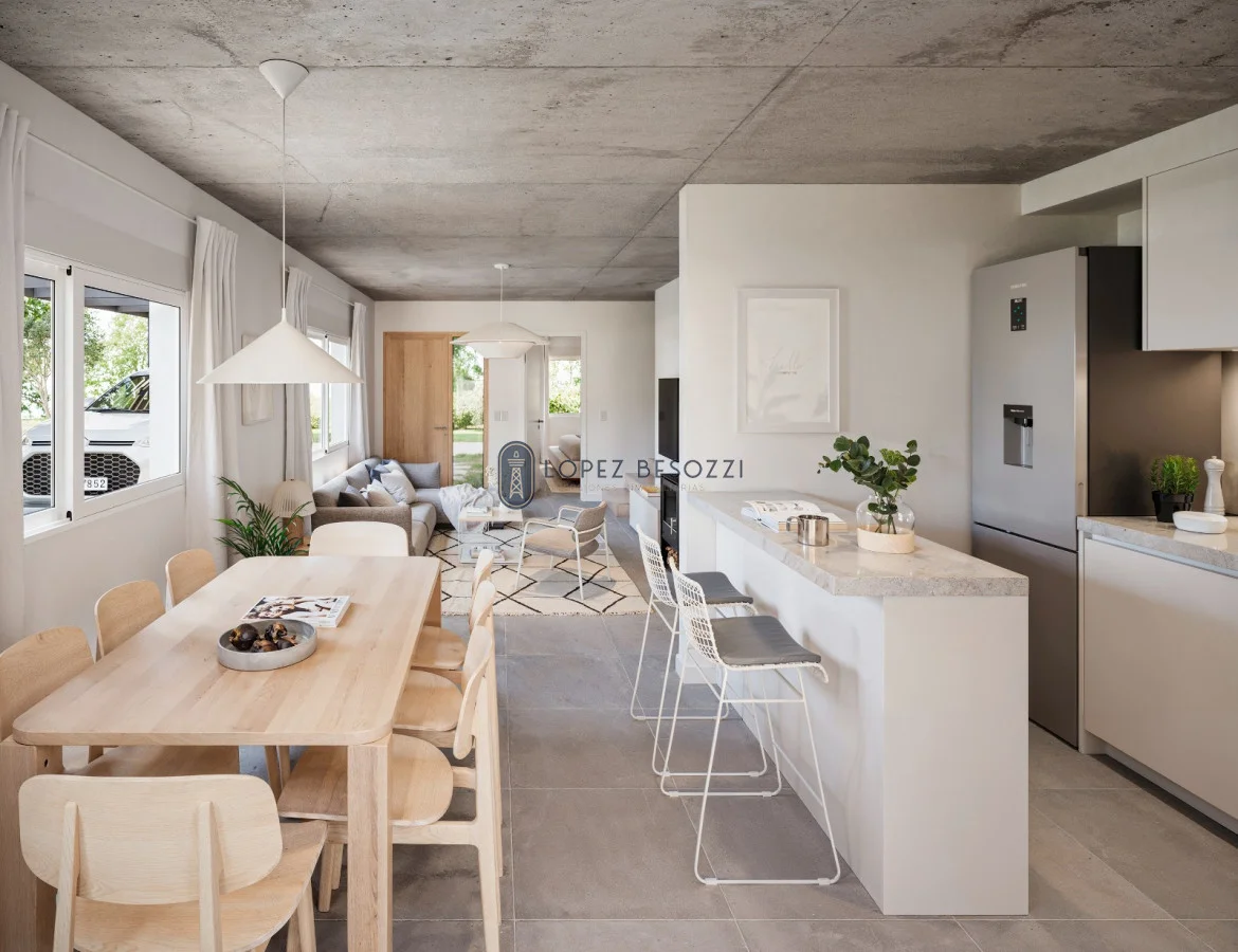 Construcción tradicional; pisos en porcelanato o vinílico (a elección); revestimiento interior en yeso aislado con lana de vidrio; aberturas en PVC con vidrios DVH + cortinas de enrollar en dormitorios; techo de planchada (hormigón) y cielorraso de yeso aislado con lana de vidrio; mesadas de granito; previsión para equipos de aires acondicionado en todos los ambientes