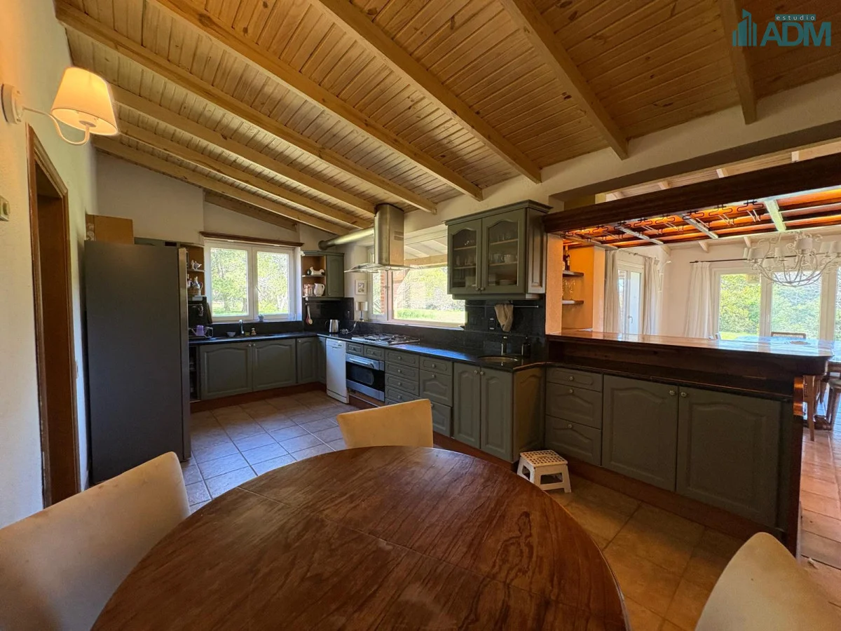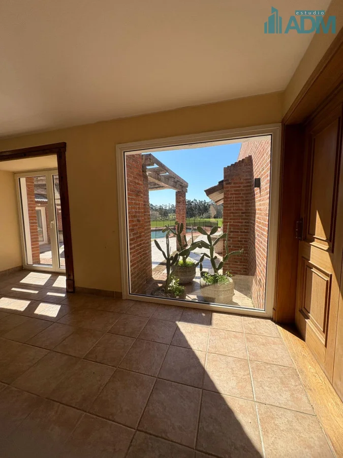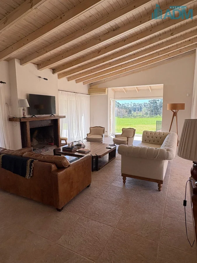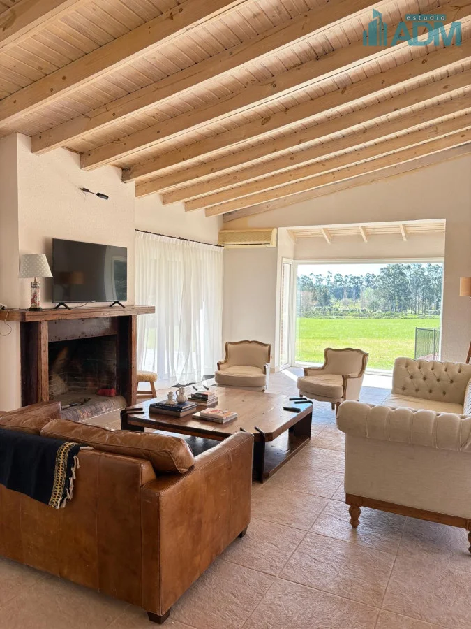 La misma se dsitribuye de la siguiente manera,ingresamos al hall que se comunica a la izquierda con un gran living rodeado de luz,con muy lindas vistas al campo,al costado del mismo tenemos el comedor que esta integrado a la cocina ,que es muy grande y se comunica al lavadero cerrado y luego a la dependencia de servicio.