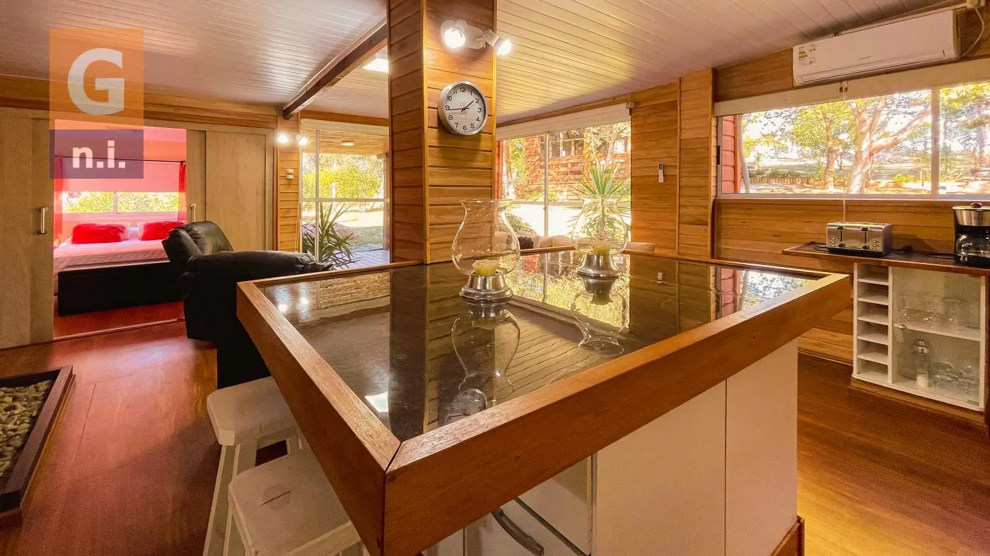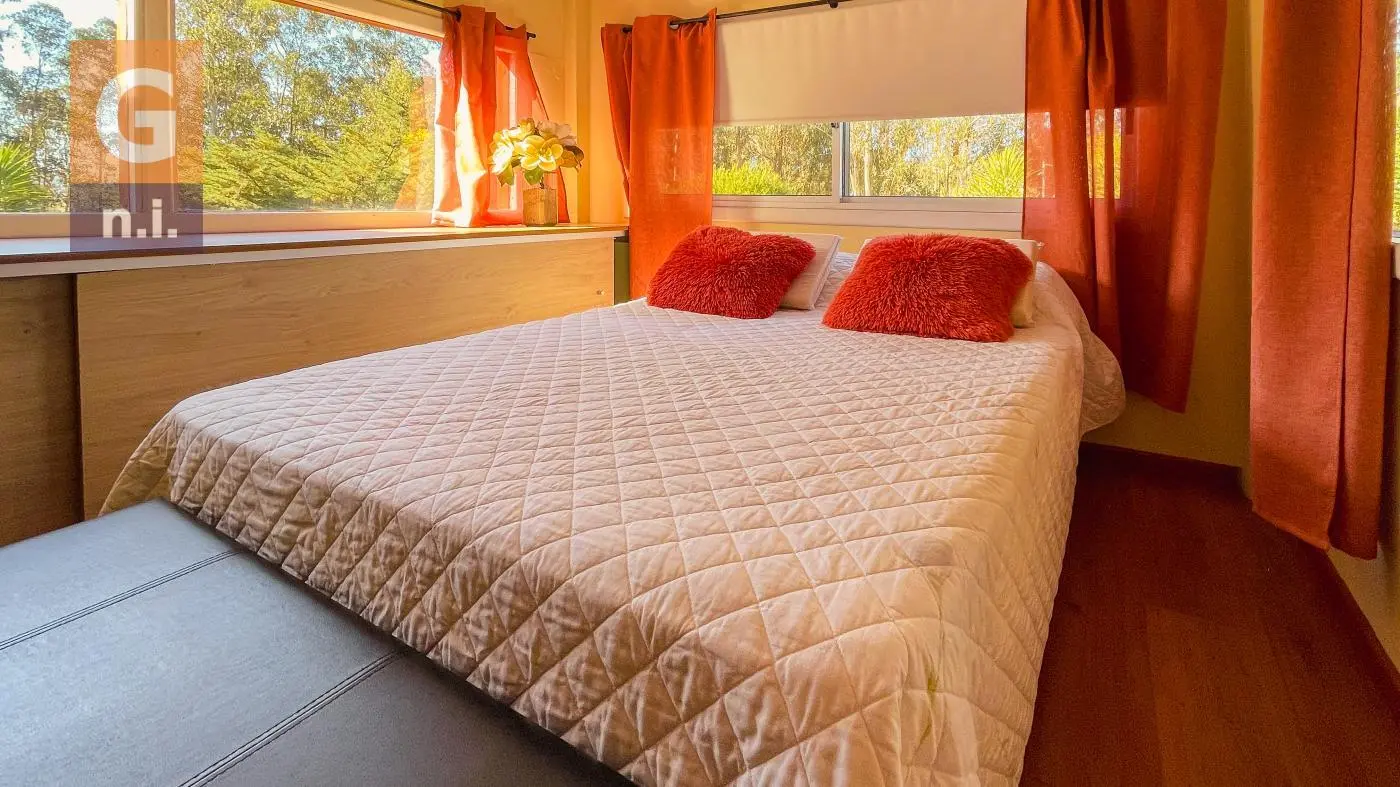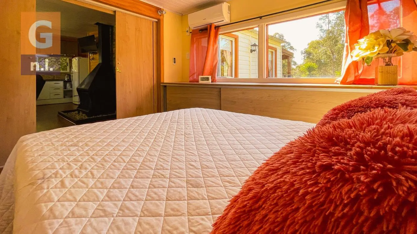 La segunda cabaña, de menor tamaño, ofrece un acogedor living comedor con cocina integrada, un dormitorio con vestidor y baño completo.