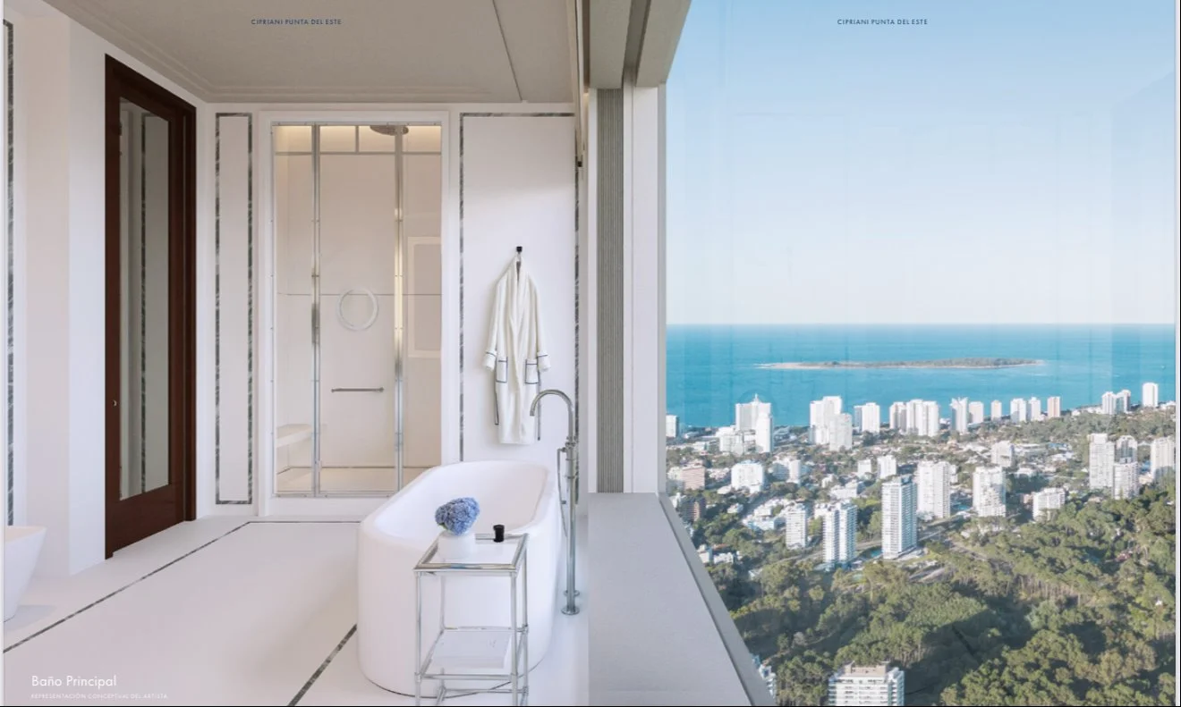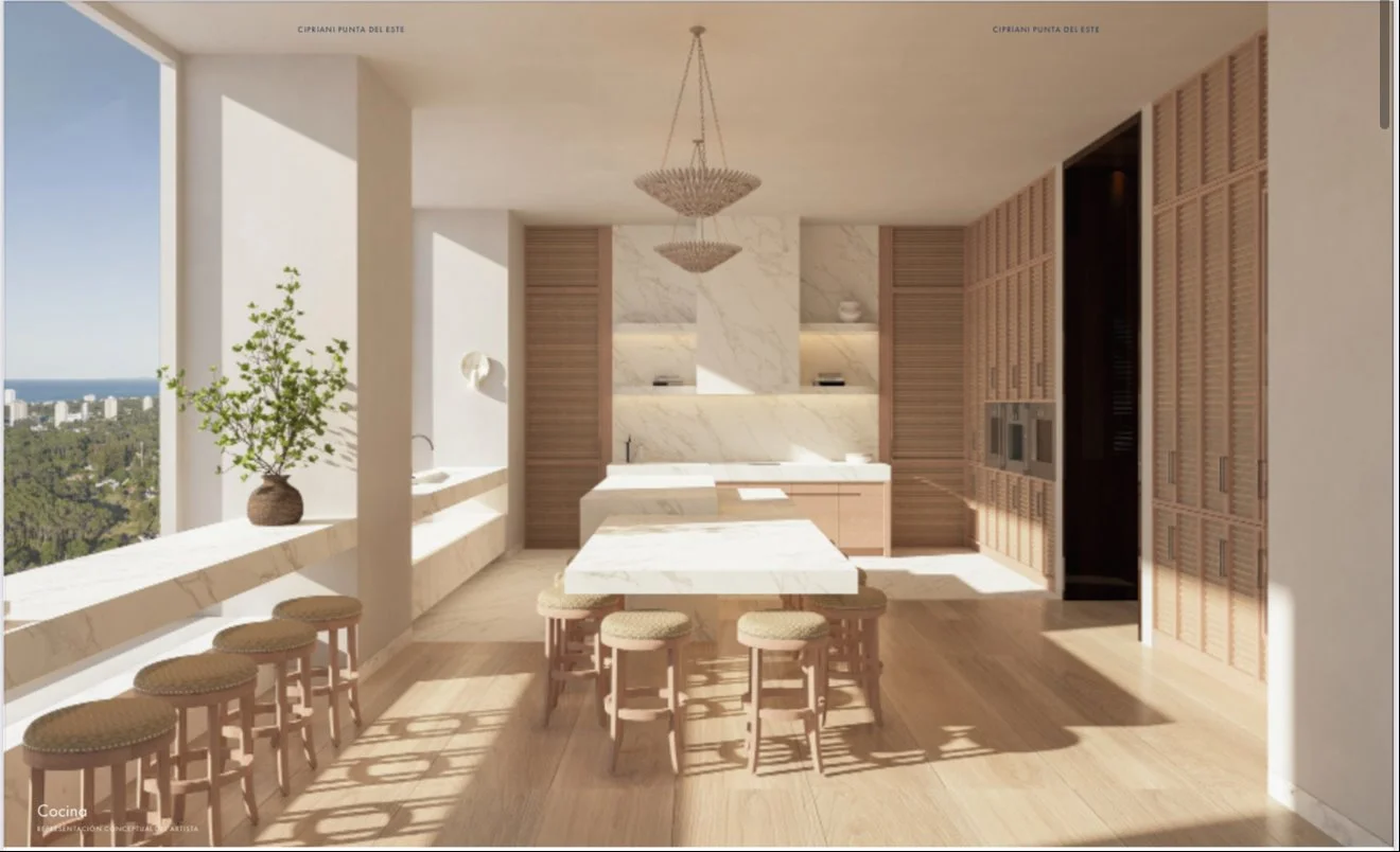 Diseñado por el prestigioso arquitecto Rafael Viñoly, junto a Hassen Balut en interiores y el inconfundible sello Cipriani, el proyecto combina arquitectura monumental, residencias de diseño sofisticado y servicios hoteleros de clase mundial. Con solo 65 residencias exclusivas en Torre 1, cada hogar ofrece amplias vistas a Playa Brava y Playa Mansa, techos de 3,4 metros, terminaciones en mármol italiano, cocinas Cipriani personalizadas y equipamiento de última generación Wolf y SubZero.