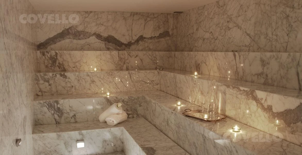 Comienza por un hall principal, de tres imponentes arañas de cristal, hacia el interior, un lujoso promenade al deck exterior el cual se encuentra la gigantesca "Infinity pool" y una zona de barbacoas privadas equipadas.Un moderno gimnasio equipado por Technogym, piscina cubierta, spa, biblioteca, sala de conferencias y microcine.