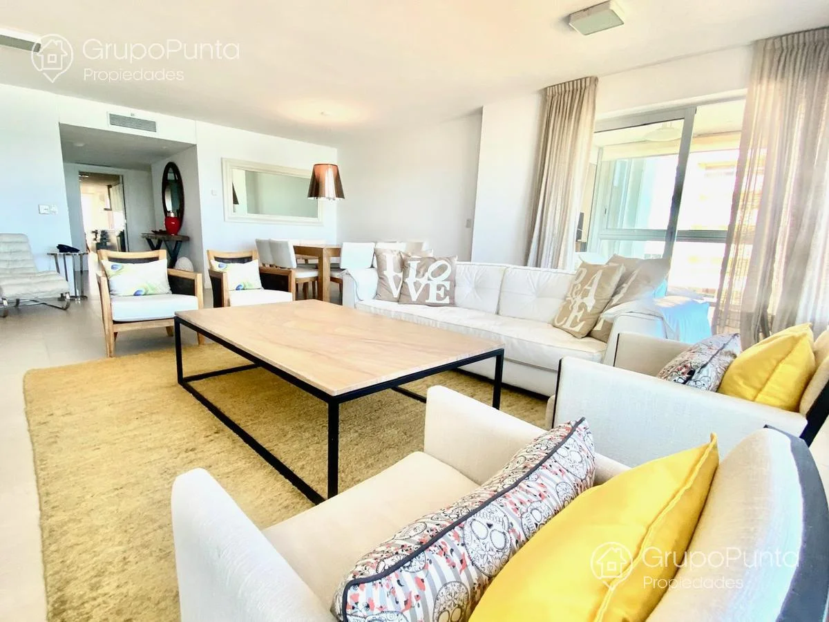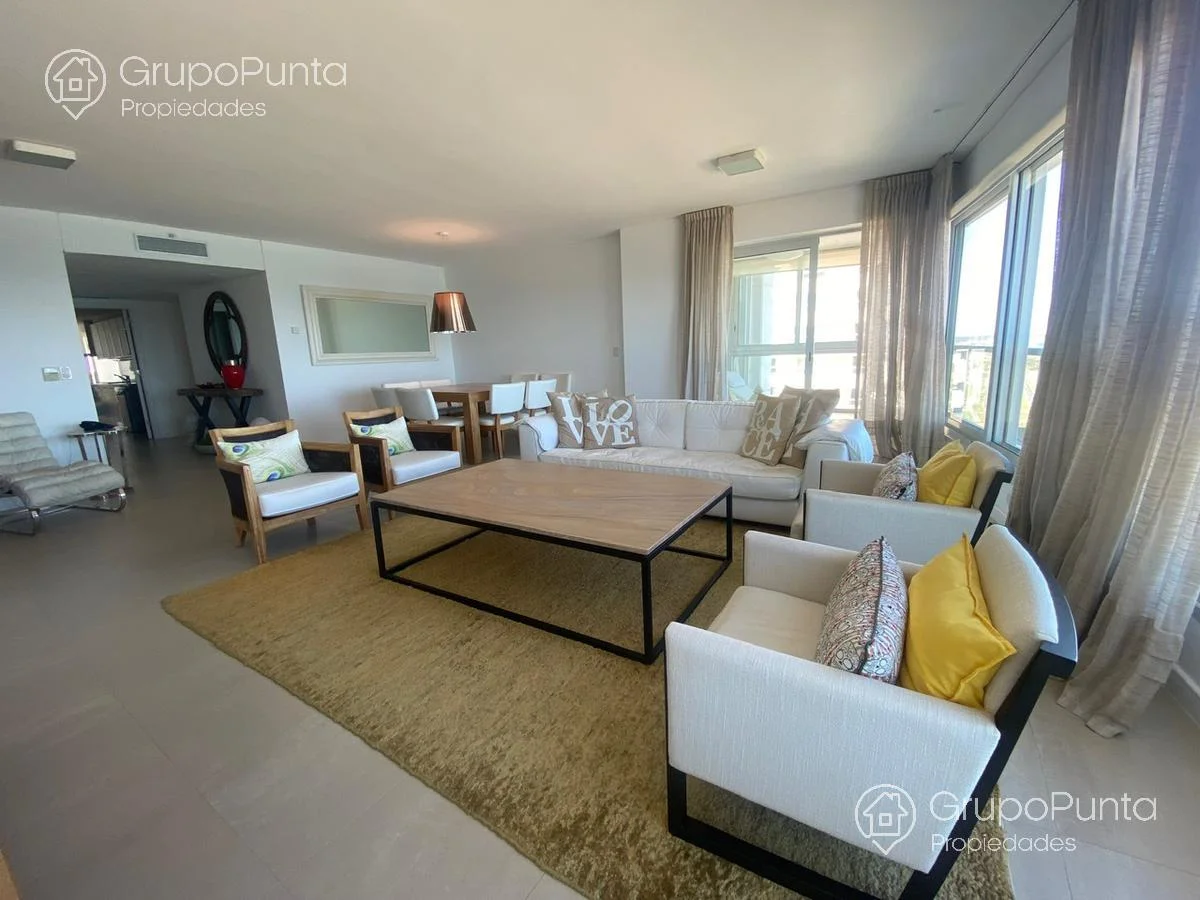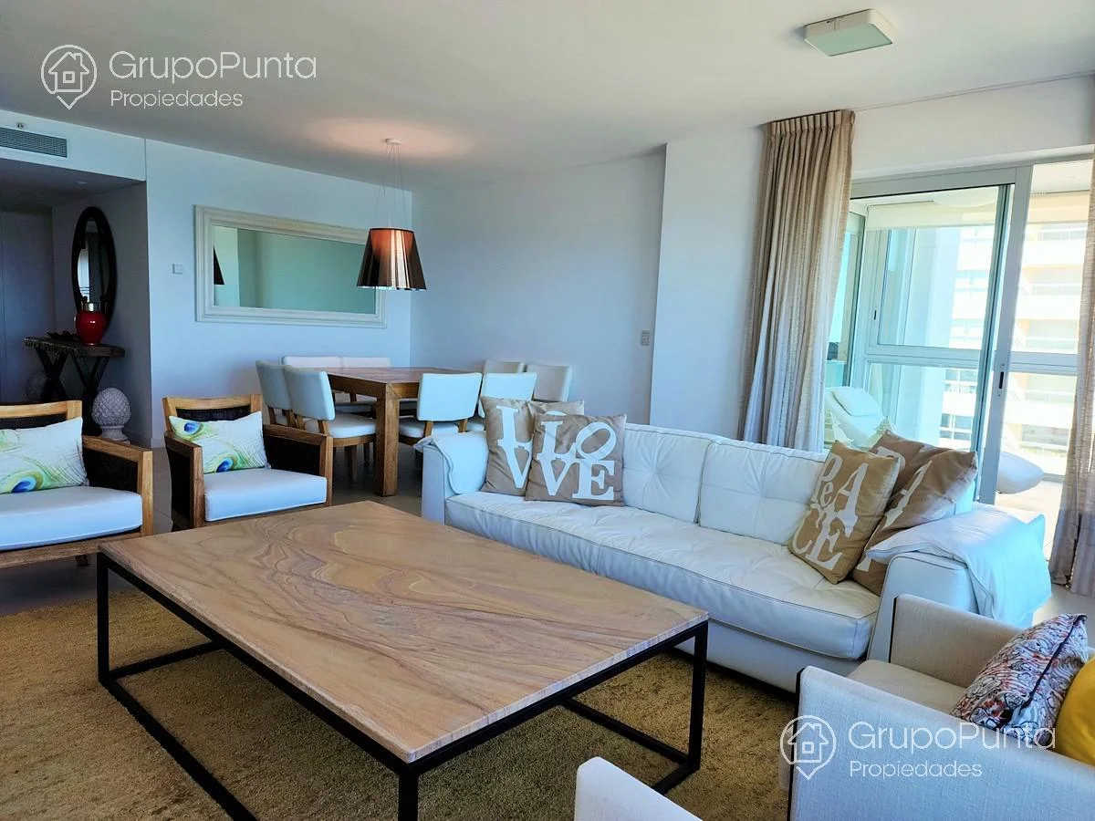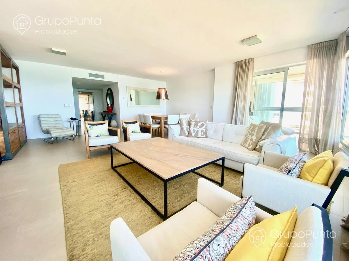 Alquiler de departamento esquinero en torre de categoría de playa Brava.Ubicado sobre primera fila de Playa, se encuentra este departamento de amplio metraje y generosos ambientes con vista plena al Mar e Isla de Lobos.Cuenta con tres dormitorios en suite con amplios placares más dependencia de servicio con baño, cocina muy cómoda y muy bien equipada. Living comedor con hermosa vista y luminosidad que conecta con terraza integrada al dormitorio principal.Losa radiante sectorizada y aires acondicionados frío calor en todas la habitaciones.Garaje en sub suelo.