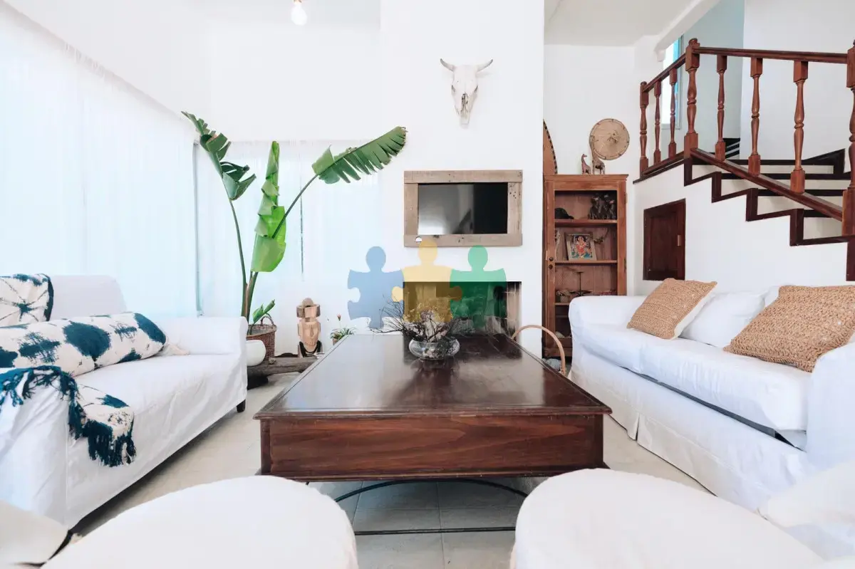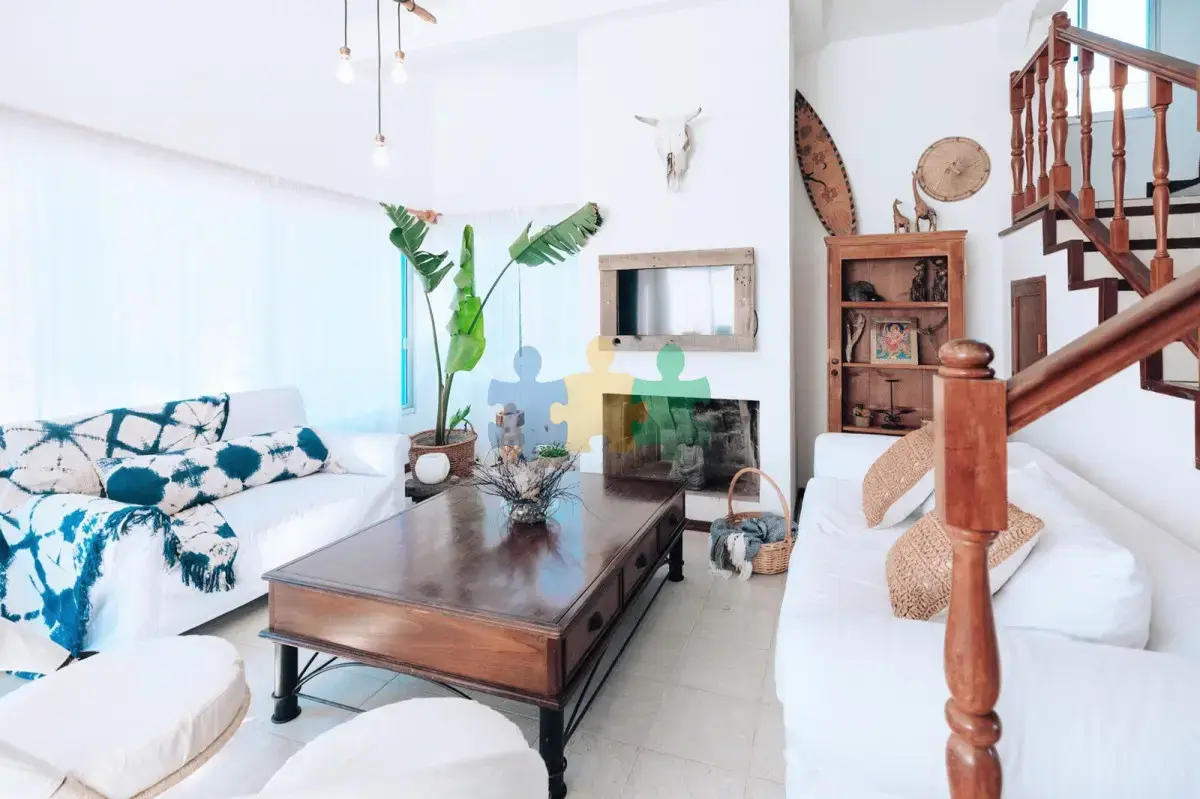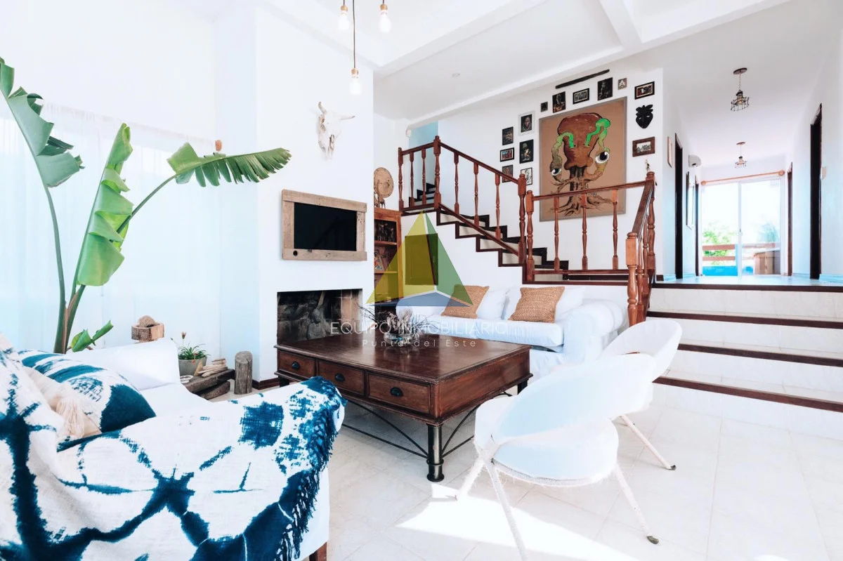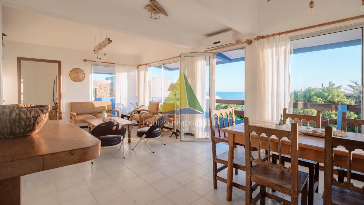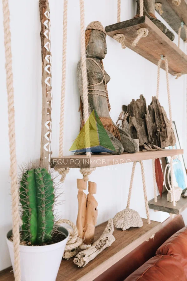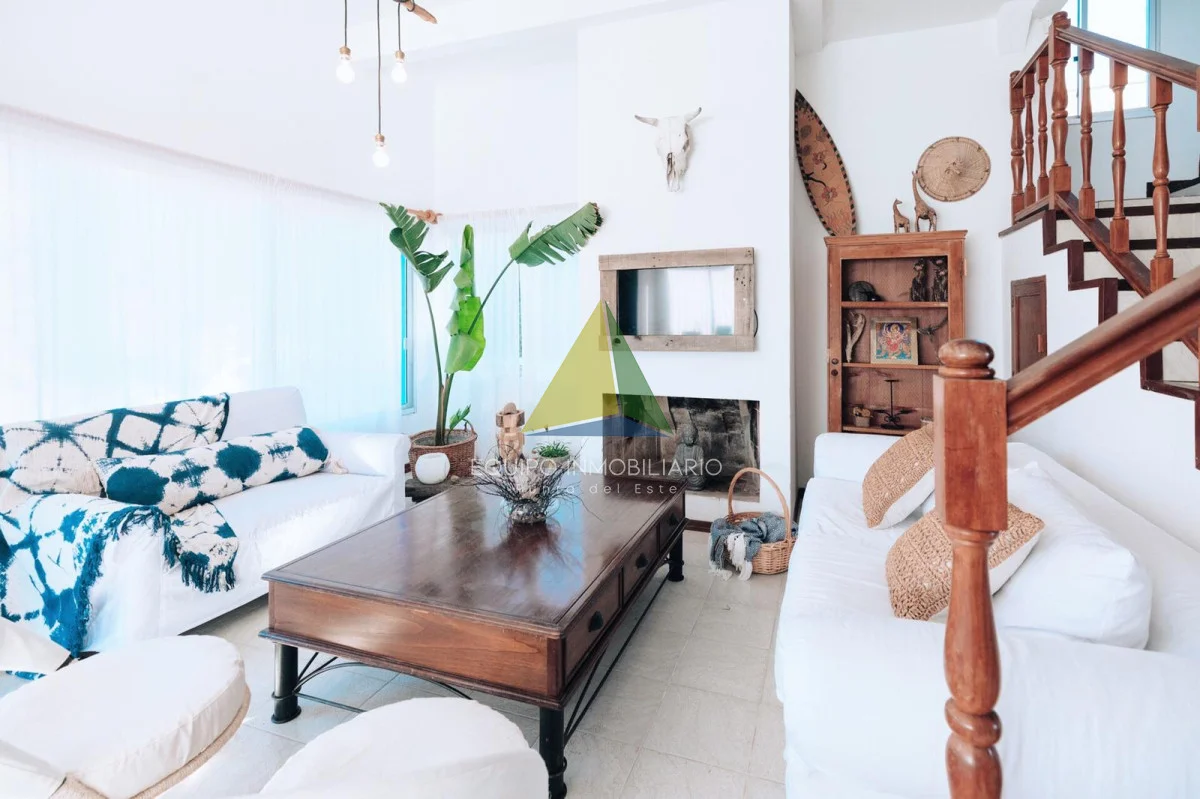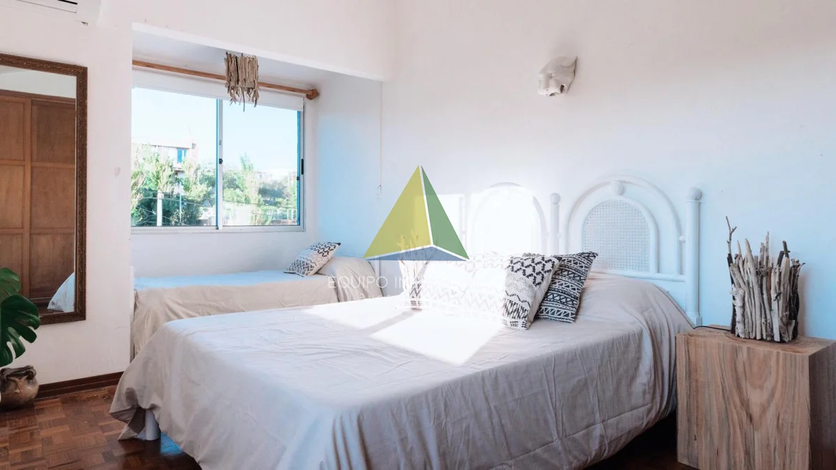 tercer piso con suite principal con estufa a leña, y otro cuarto con cuchetas, más otro baño, y salida a terraza con parrillero y vista al mar.