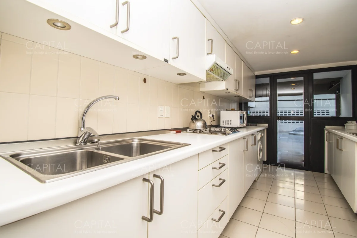 Tres dormitorios, el principal en suite, terraza con pileta mirando la Isla Gorriti, los otros dos dormitorios comparten un baño completo mas toilette, living comedor amplios, cocina totalmente equipada con salida a un amplio patio interno.