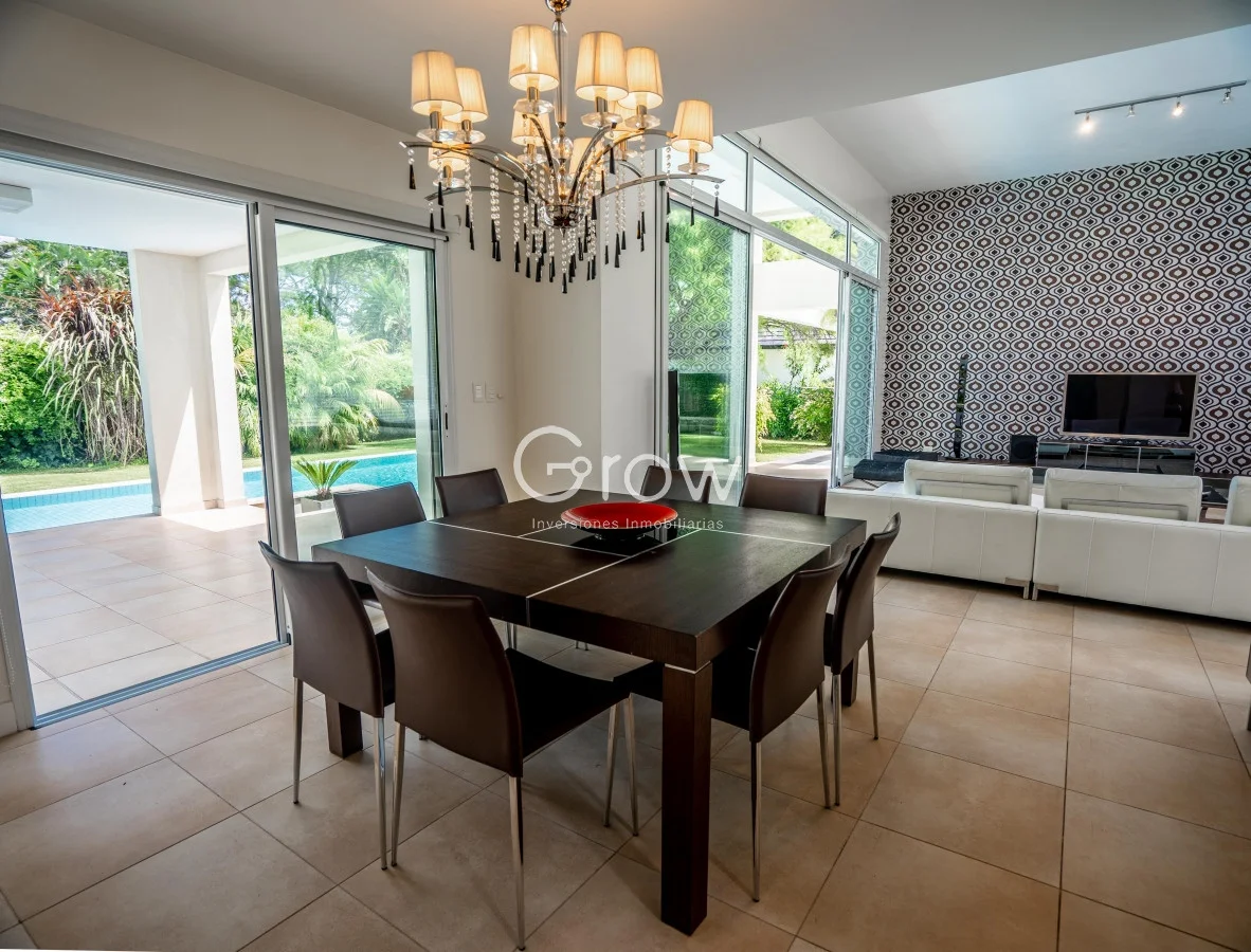 La casa se encuentra distribuida en dos plantas, en planta baja posee un hall de ingreso, un gran living en doble altura y con luz natural, finamente decorado, un comedor con vista al parque y piscina, la cocina posee una desayunador diario y vista al parque, lavadero separado con salida independiente, habitación de servicio con baño y un amplio dormitorio en suite con vista al complejo.