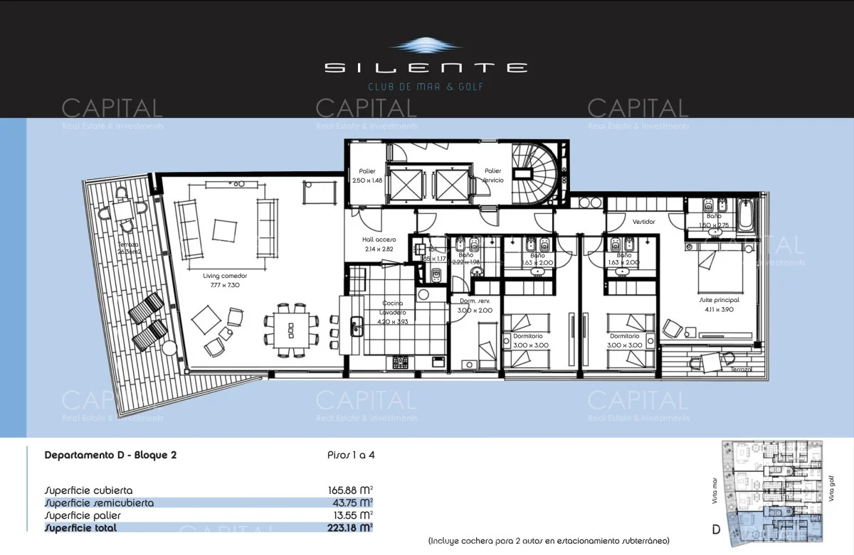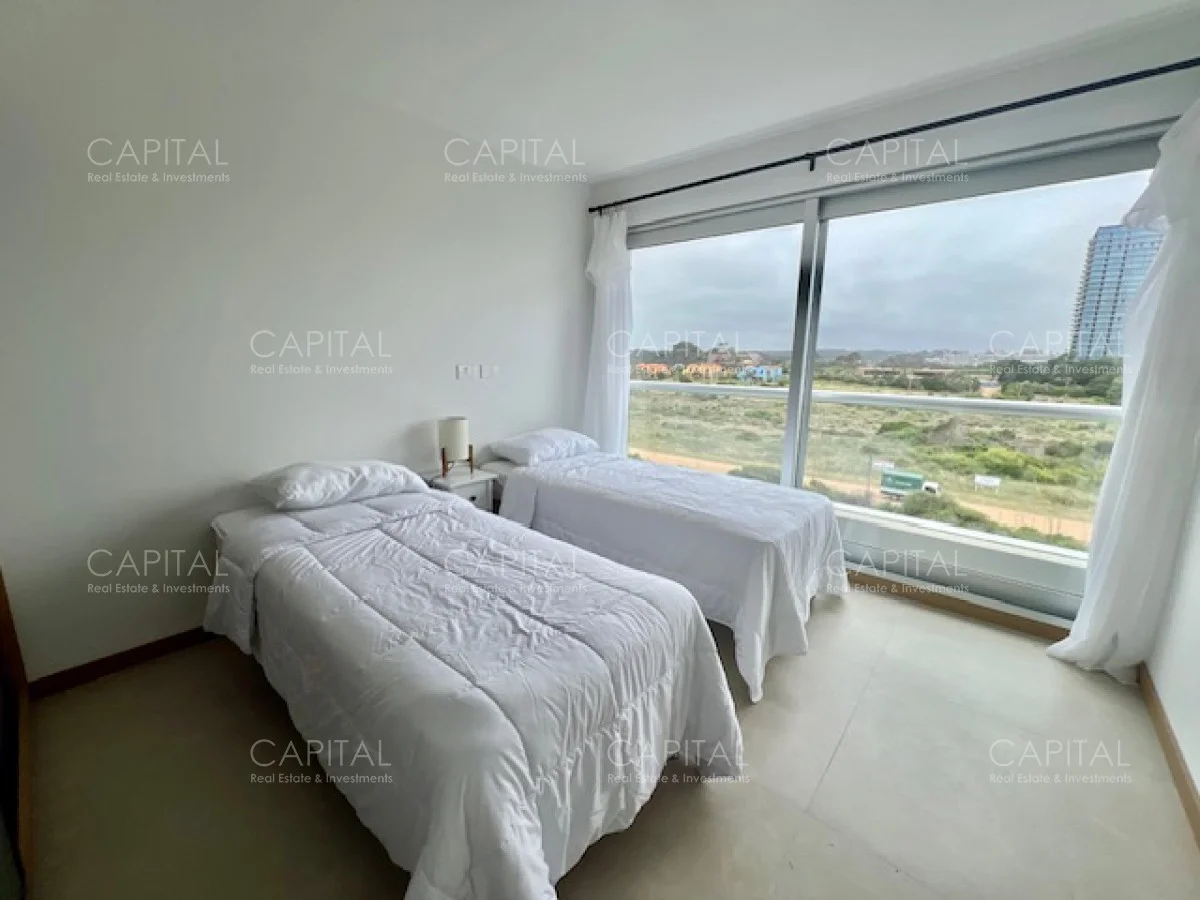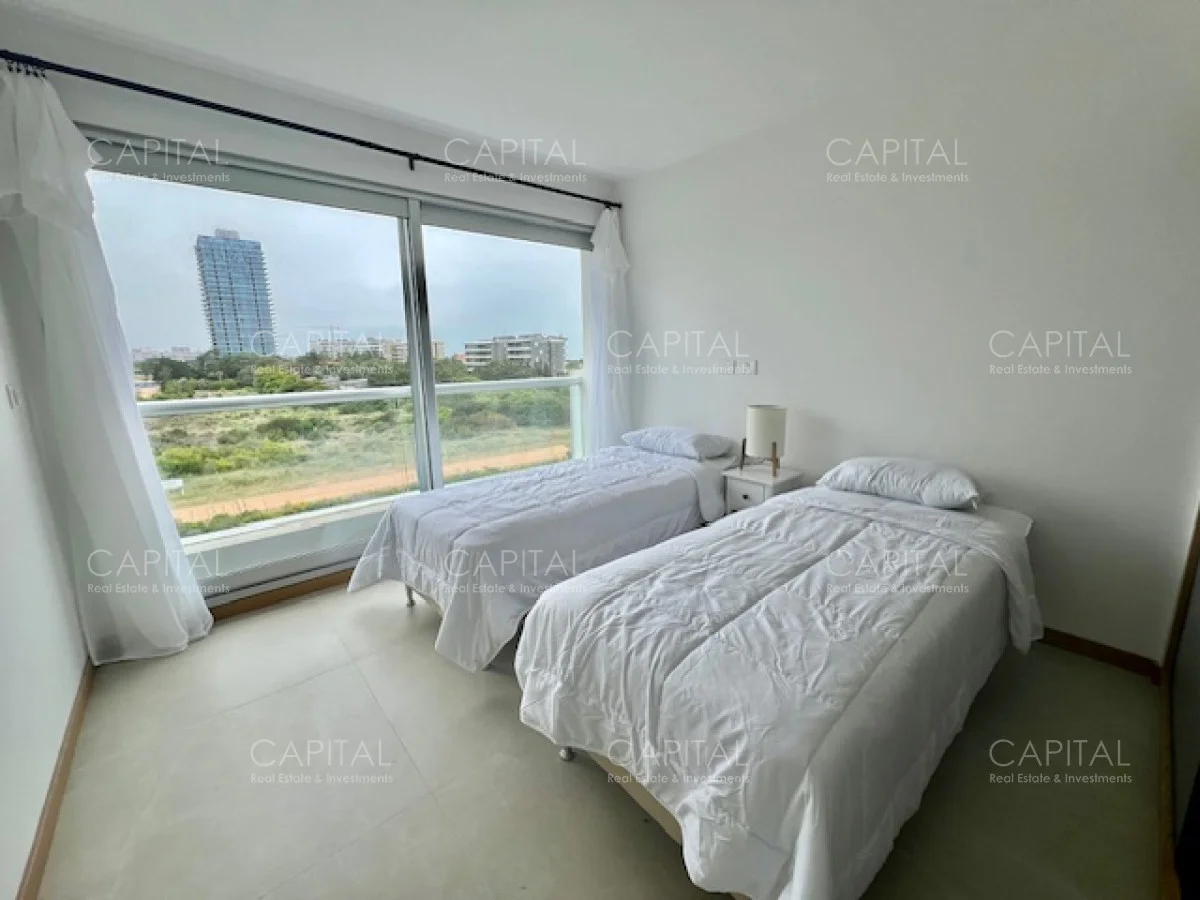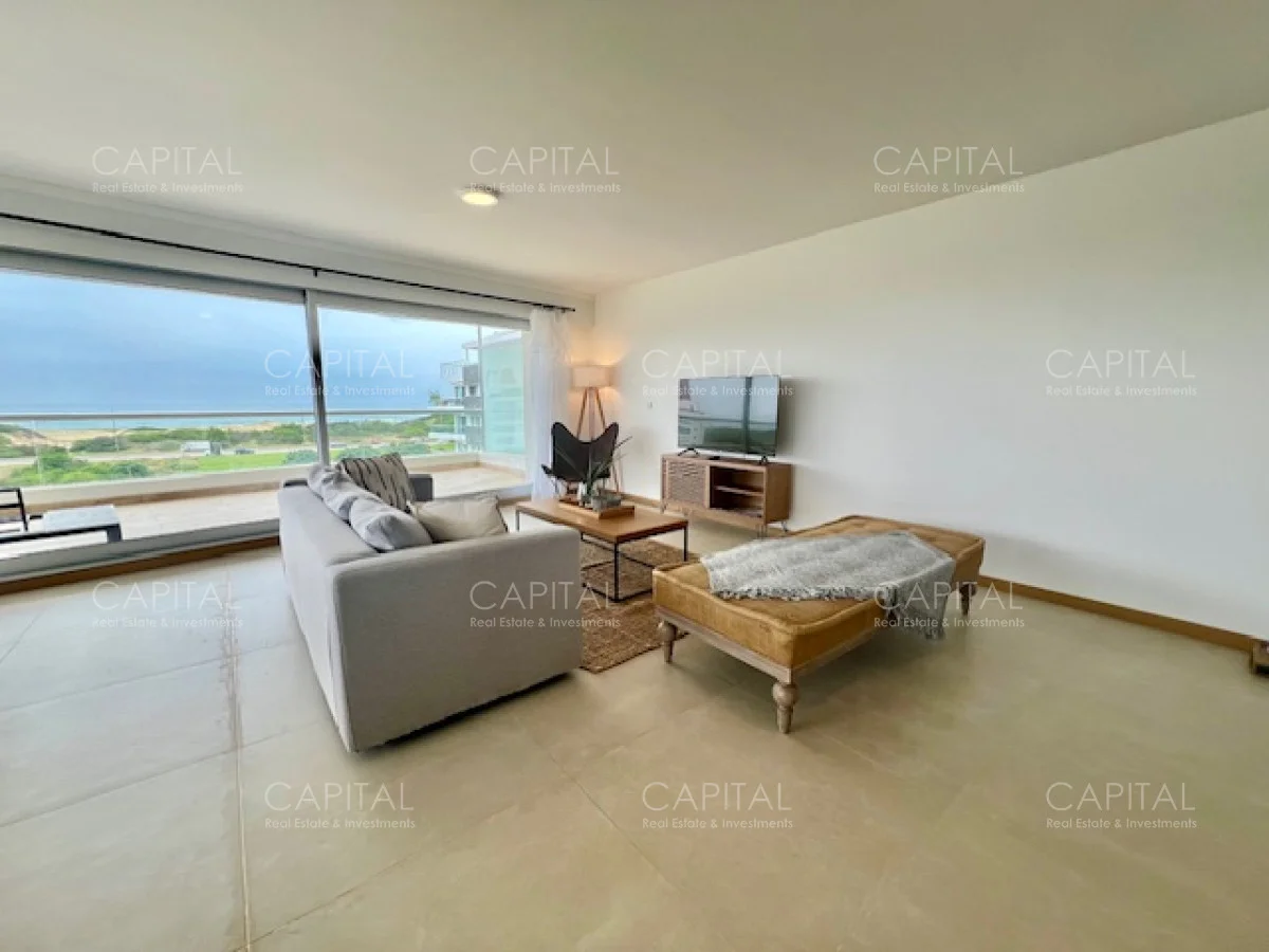 En la parada 33 de la Brava se encuentra el complejo Silente, con 3 bloques de apartamentos siendo esta unidad en 5to piso esquinero a La Barra, con vista asegurada al mar. Cuenta con grandes ambientes, todo con mucha luz. Living comedor con cocina semi integrada, 3 suites completas, toilette y dependencia de servicio con su baño y lavadero. Todo el living da al balcon aterrazado para disfrutar de la vista a los jardines y el mar.