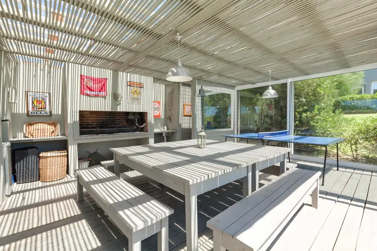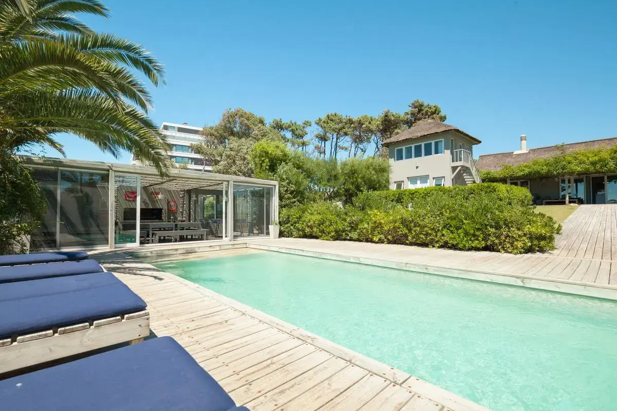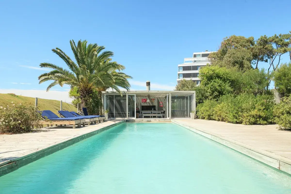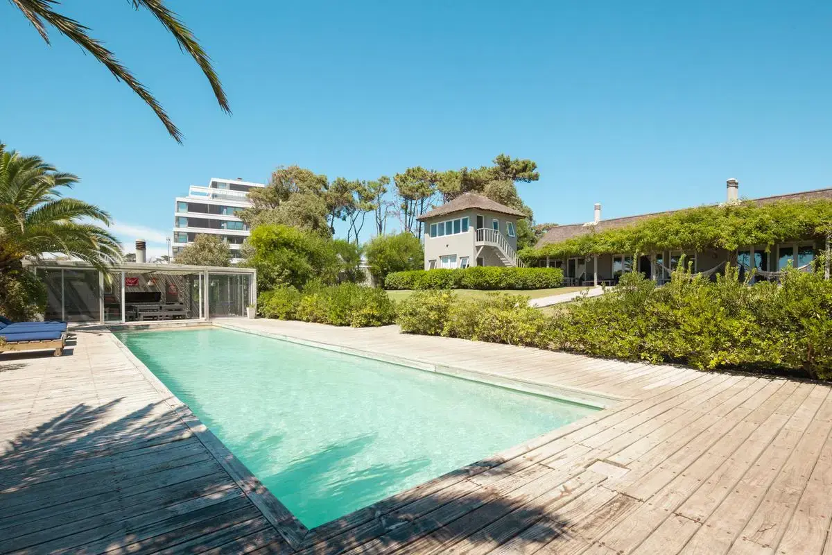 El terreno es de 2000 mts , con 550 mts construídos, con una galería de 300 mts. que le da a la casa una forma de U. La casa cuenta con 5 dormitorios de los cuales 3 son en suite y 2 comparten un baño en el medio. (Dos de ellas son suite que estan afuera de la casa). Comedor y living de gran tamaño con salida a el jardín de 1500 mts y la piscina de 18 x 4 al frente con vista al mar. La cocina se conecta con la casa de caseros que tiene su propia sector de cocina. Toda la casa tiene ADSL , losa radiante , directv , playroom.