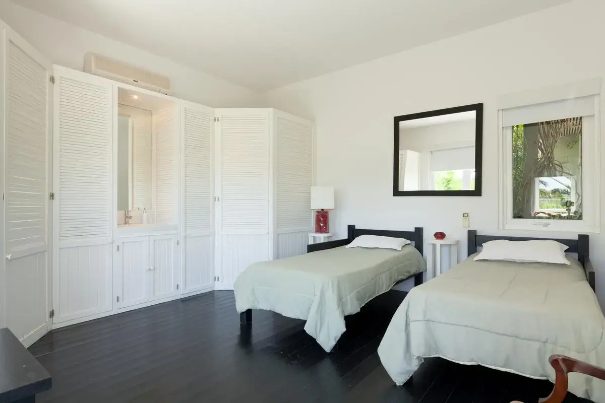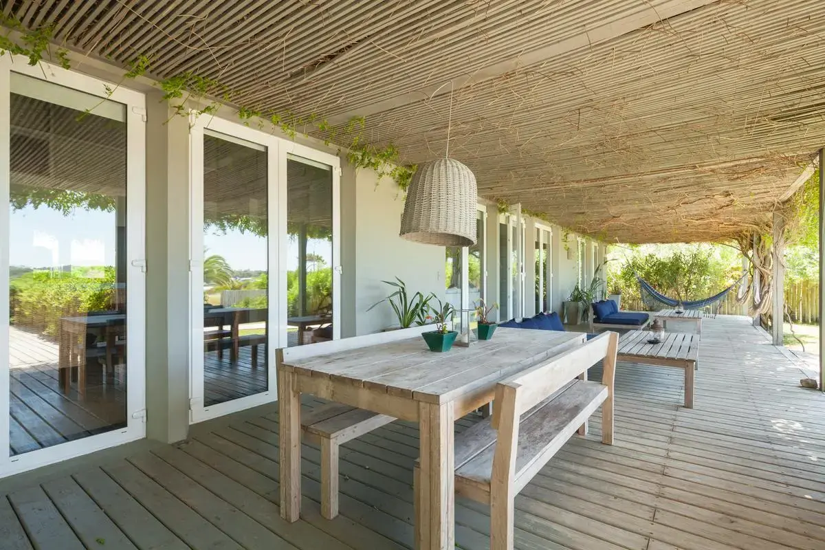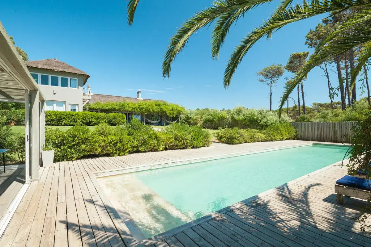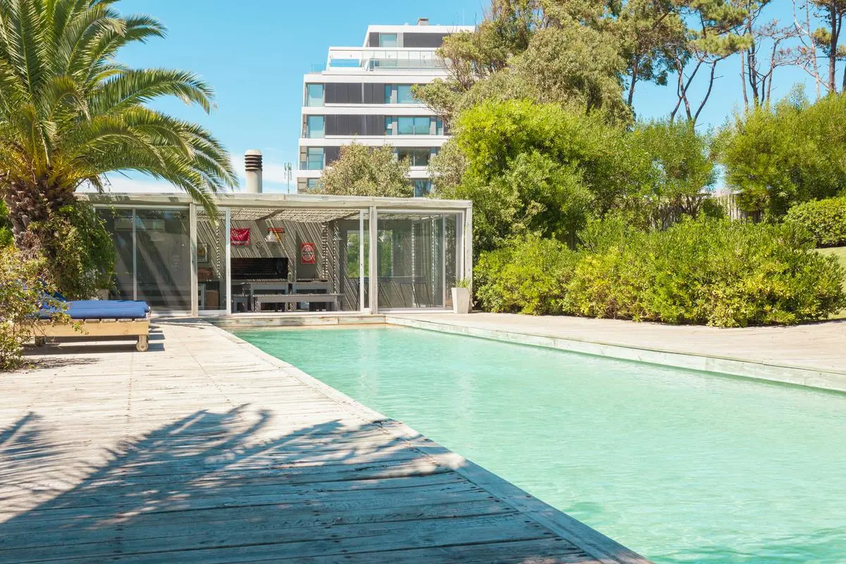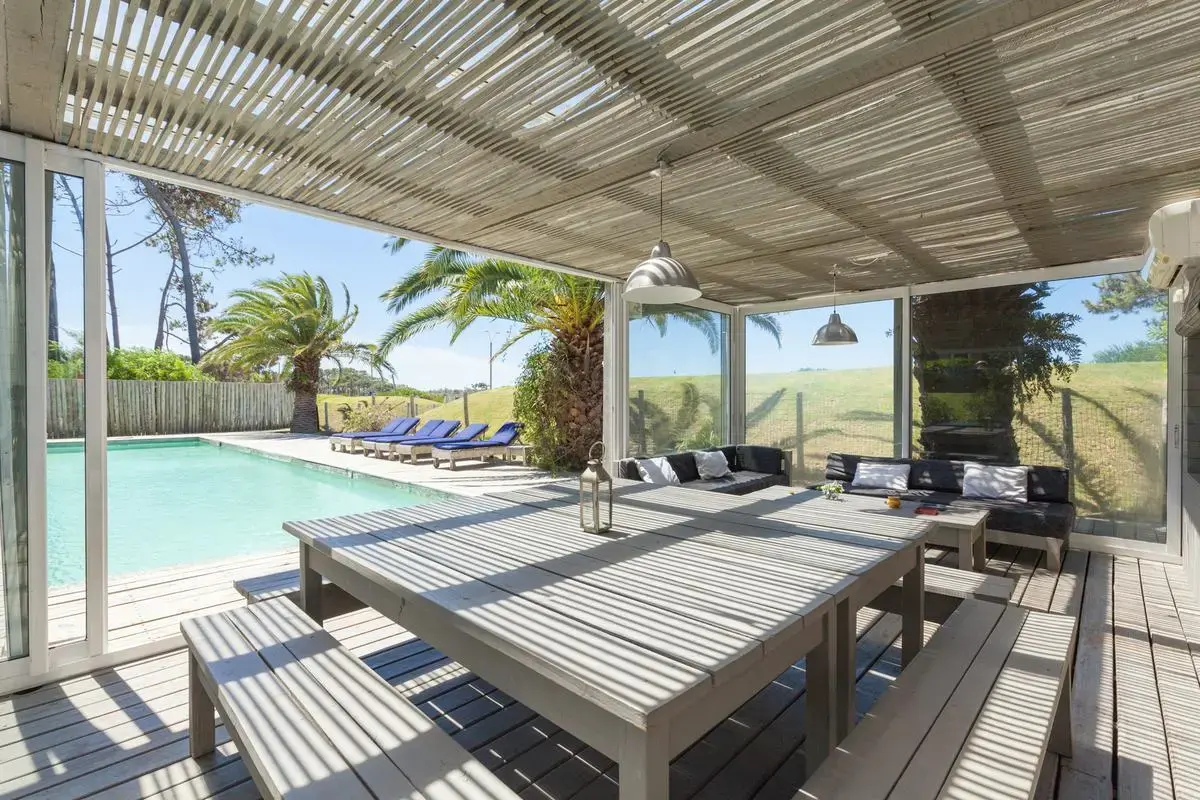 El terreno es de 2000 mts , con 550 mts construídos, con una galería de 300 mts. que le da a la casa una forma de U. La casa cuenta con 5 dormitorios de los cuales 3 son en suite y 2 comparten un baño en el medio. (Dos de ellas son suite que estan afuera de la casa). Comedor y living de gran tamaño con salida a el jardín de 1500 mts y la piscina de 18 x 4 al frente con vista al mar. La cocina se conecta con la casa de caseros que tiene su propia sector de cocina. Toda la casa tiene ADSL , losa radiante , directv , playroom.