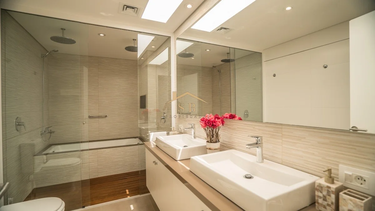 Living - comedor, una gran cocina con desayunador, 3 amplias suites (una de ellas en planta baja), una máster suite con vestidor y sala de estar; 4 grandes baños, dorm. De servicio en suite, toilette, recepción, escritorio, parrillero techado, pergolado exterior y solárium, piscina climatizada.