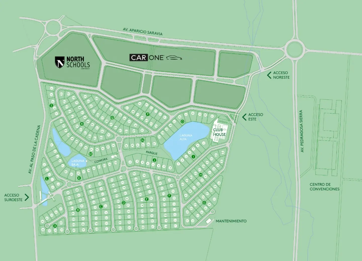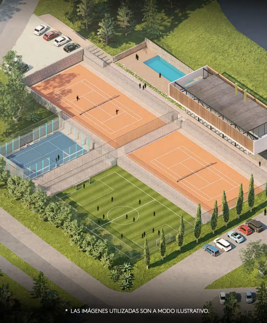 Club House con Piscina, Canchas de Tenis, Cancha de Futbol, Cancha de Padel, Gym, Espacio Co-work, Salon de Yoga y Relax. 2 accesos, 2 lagos, Parque central de uso común.