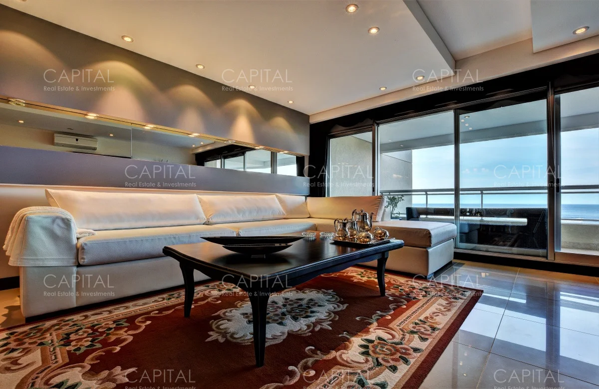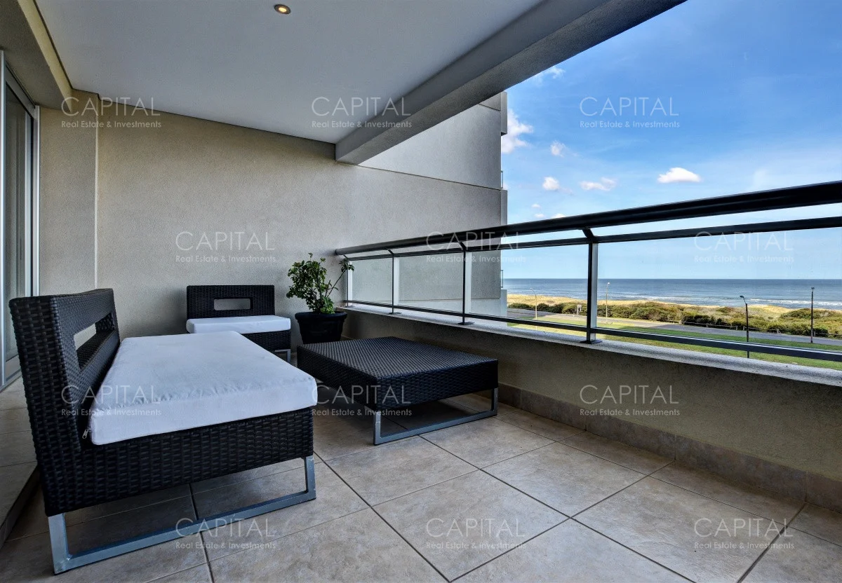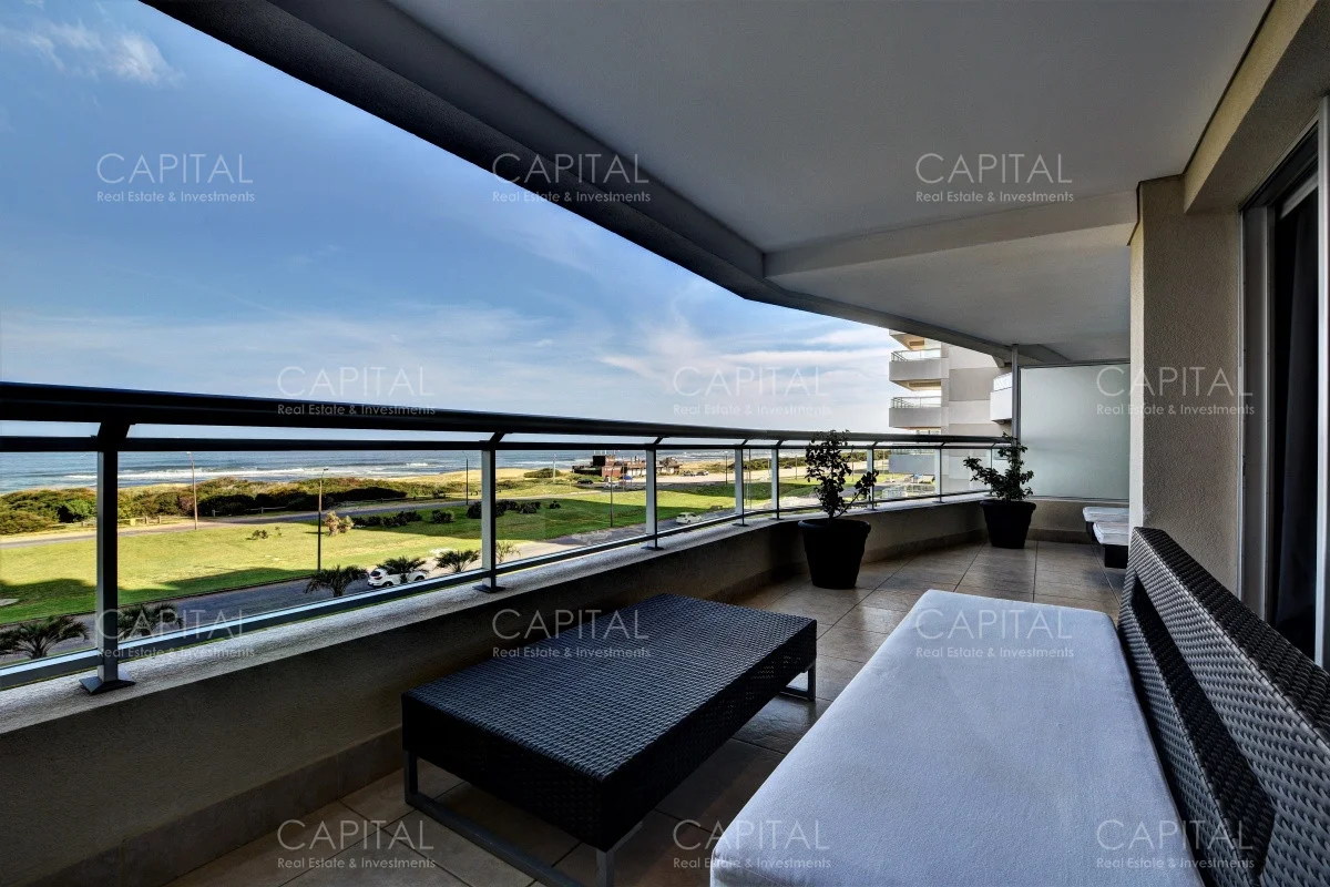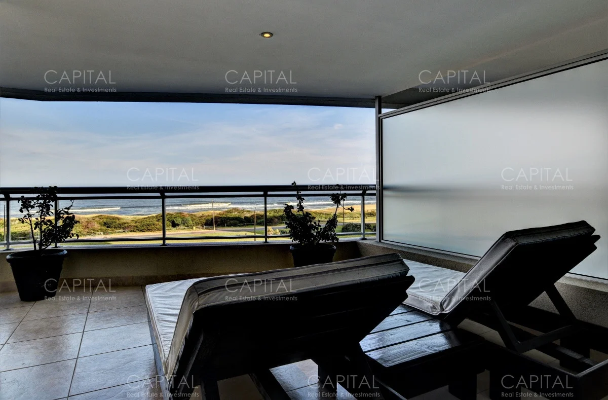 Torre de Categoria, living comedor, cocina, comedor diario, lavadero, tres dormitorios en suite, toilette, dependencia de servicio con baño, terraza con vista frontal a playa brava, garaje. Cuenta con servicio de playa, cancha, piscina externa e interna, servicio de mucama, parrillas común, recepción, sauna, gimnasio.