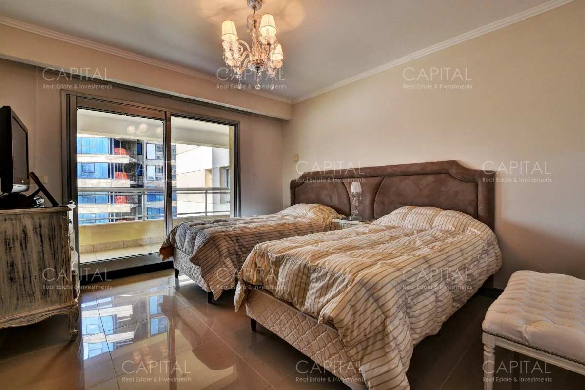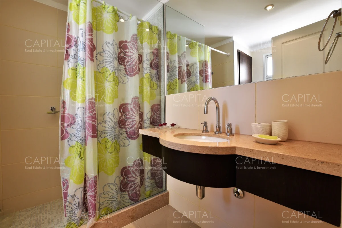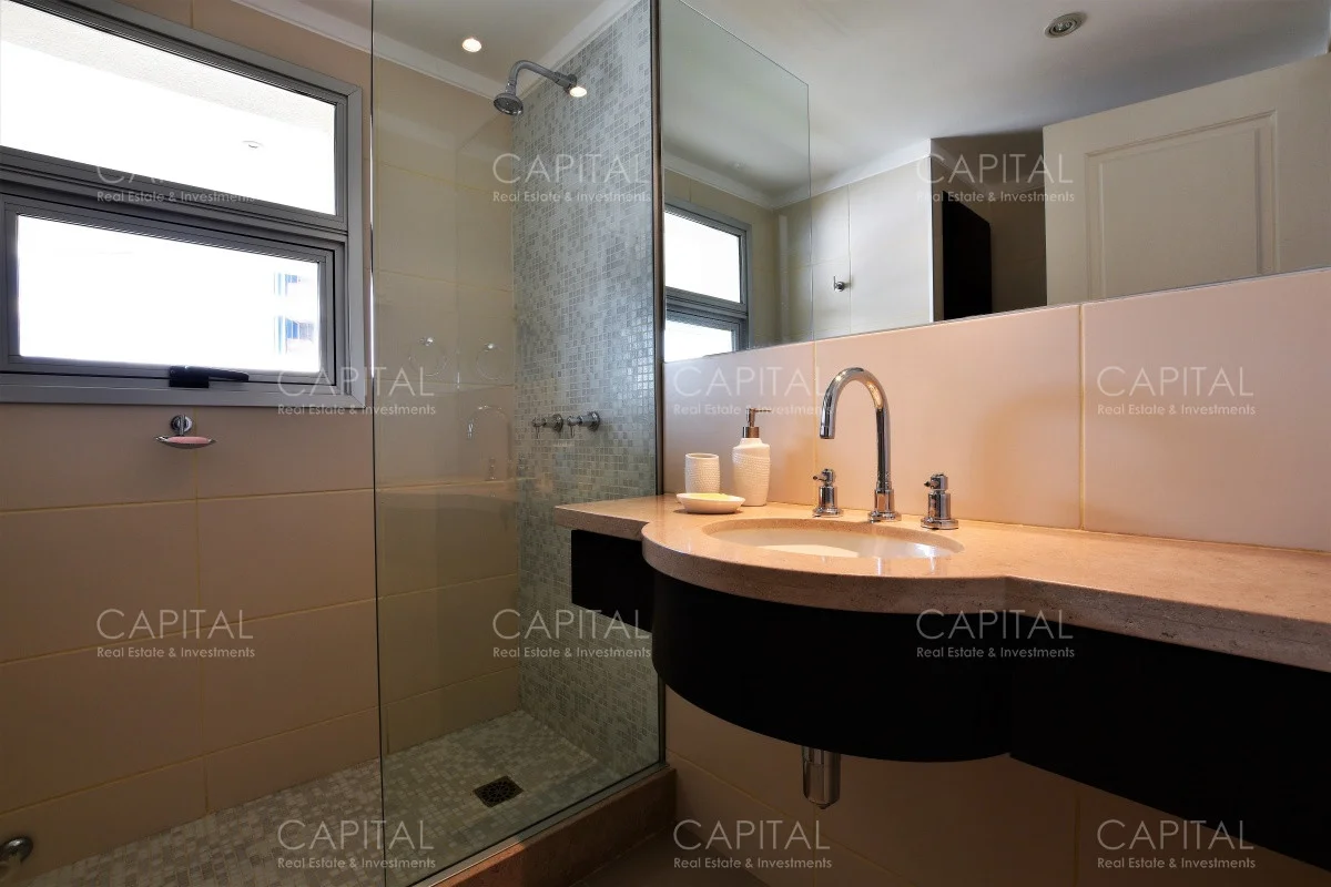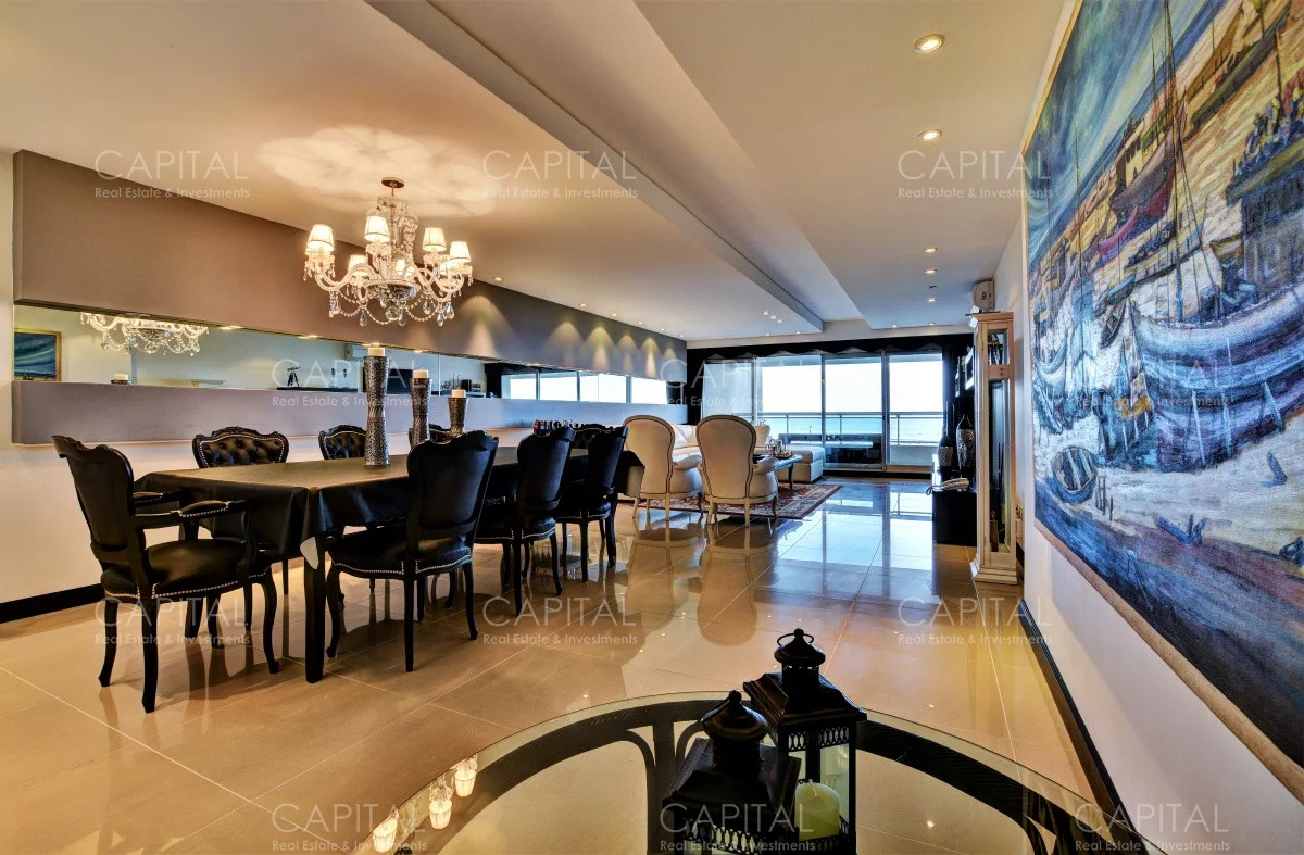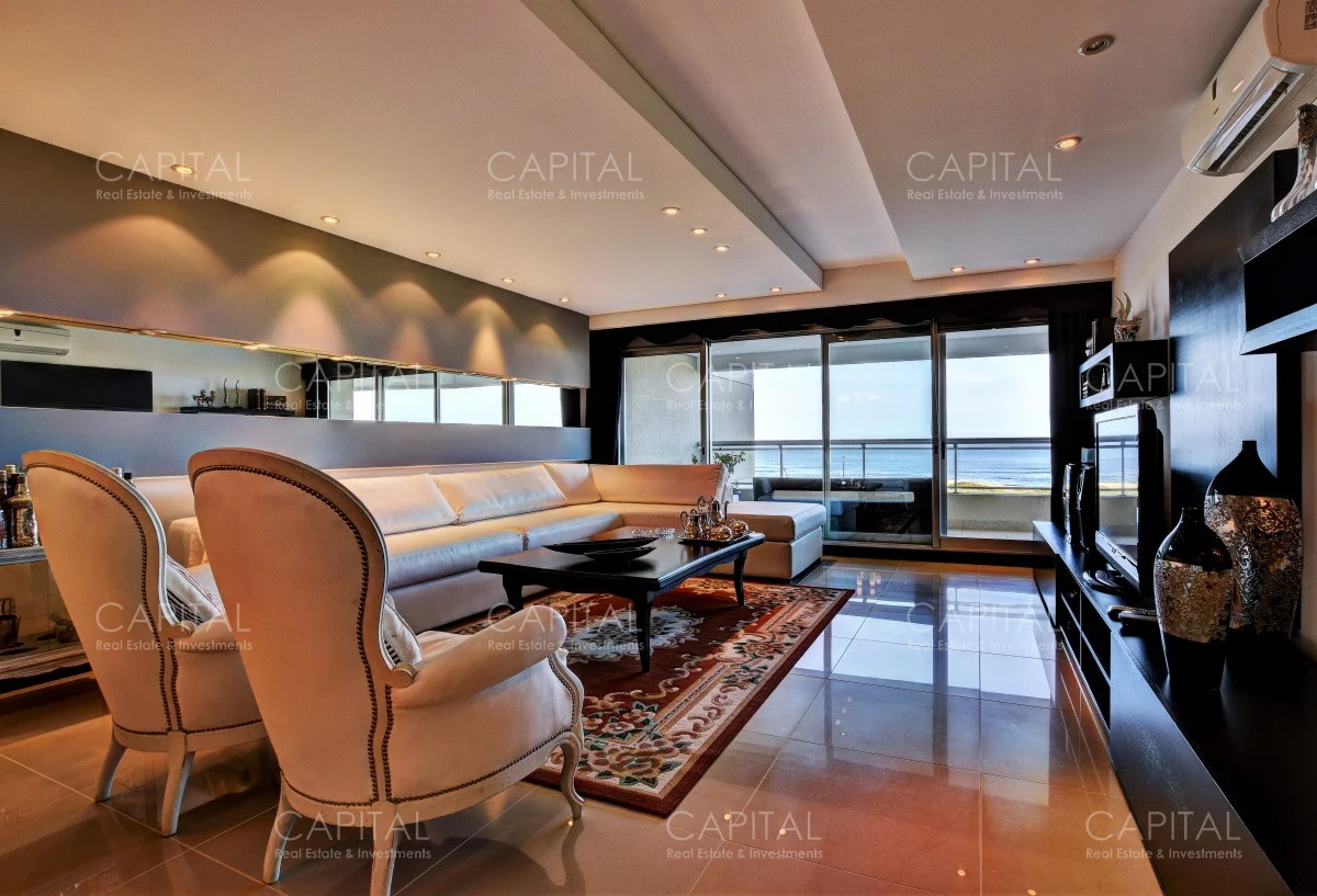 Torre de Categoria, living comedor, cocina, comedor diario, lavadero, tres dormitorios en suite, toilette, dependencia de servicio con baño, terraza con vista frontal a playa brava, garaje. Cuenta con servicio de playa, cancha, piscina externa e interna, servicio de mucama, parrillas común, recepción, sauna, gimnasio.