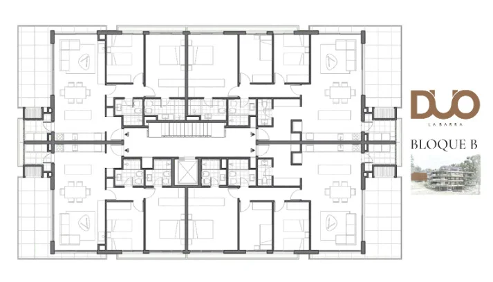 Ubicado en el corazón geográfico de la Barra, se desarrolla en dos bloques de tres pisos que ensamblan en perfecta armonía con el entorno de bosque y playa.