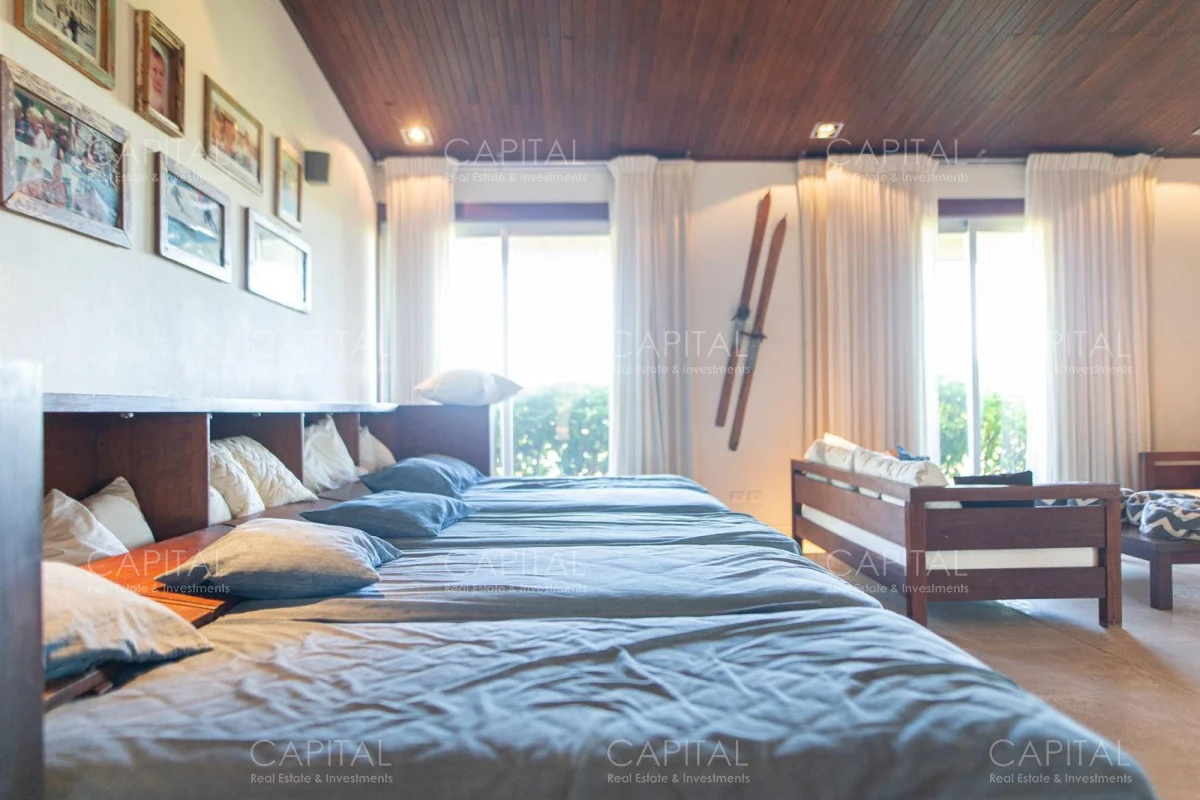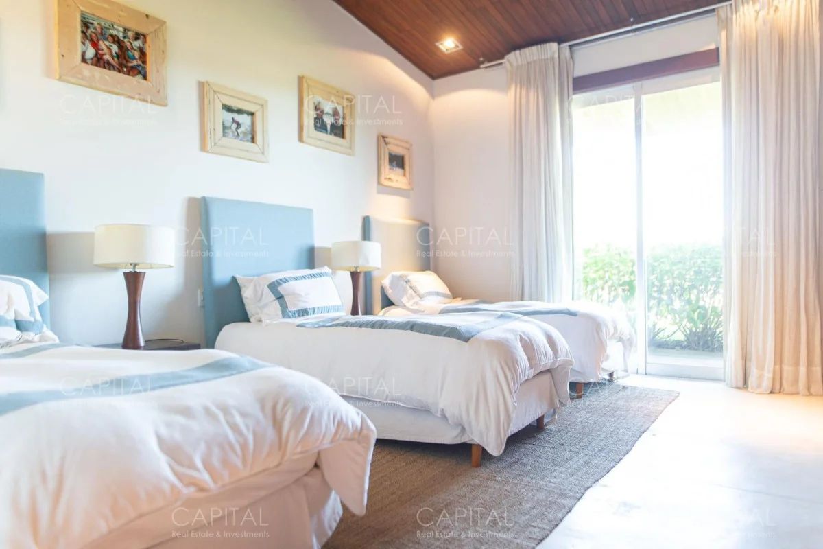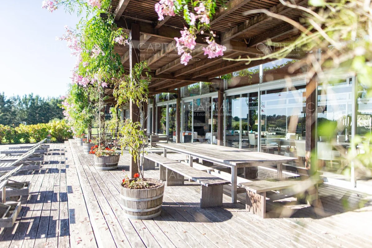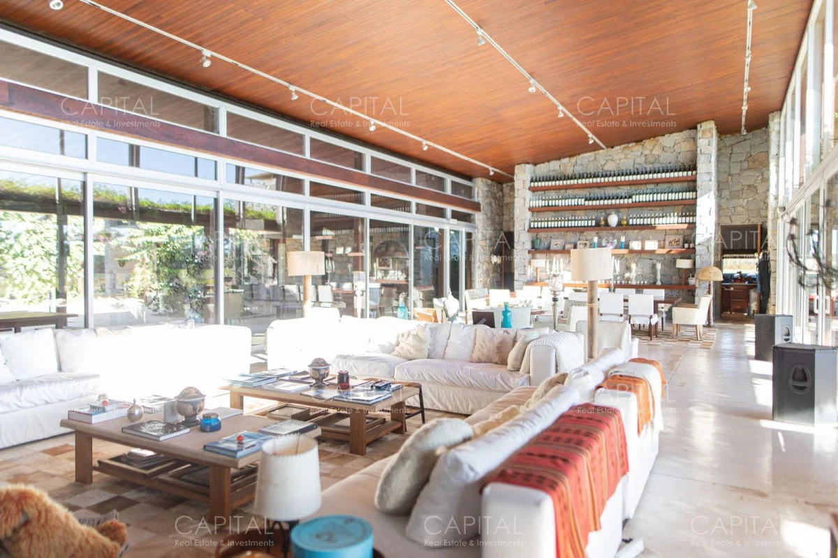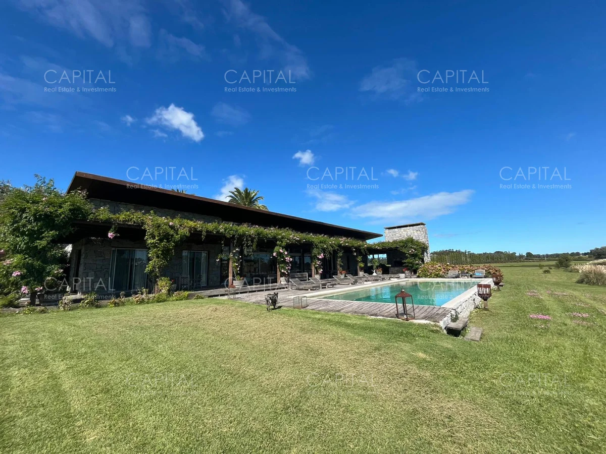 Cuenta con ambientes amplios y luminosos con grandes ventanales que ofrecen vistas espectaculares a gran terreno con tajamar. El aislamiento y la privacidad son las características principales de esta casa de 8 dormitorios todos con vistas magnificas. Los detalles en piedra ofrecen una apariencia natural al interior. El espacioso comedor con salida a una terraza amplia que ofrece un lugar perfecto para disfrutar con familia y amigos, la amplia sala de estar con chimenea de leña de gran tamaño al igual que la cocina gourmet. Todos los dormitorios son amplios y luminosos con techos altos. Esta magnifica chacra también incluye sauna, jacuzzi, cancha de futbol, viñedo y dos dos dormitorios de servicio. A sólo unos kilómetros de Manantiales, Playa Bikini y a cinco minutos del corazón de La Barra.