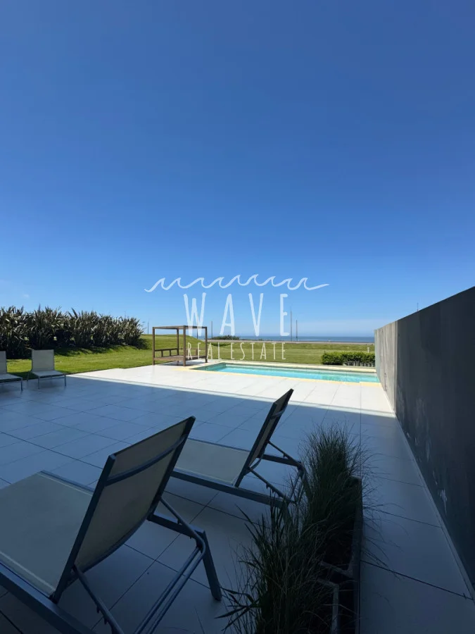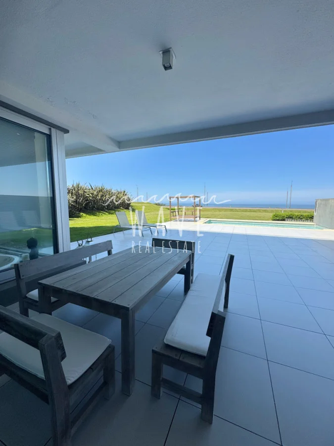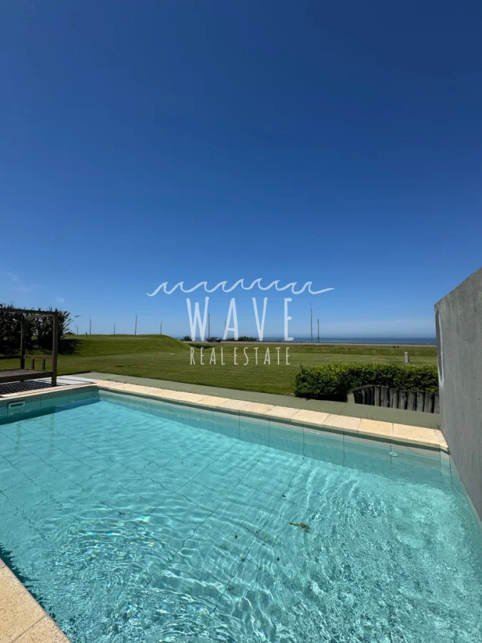 Jardín con vista al océano, piscina propia climatizada, terraza posterior con parrillero, y doble cochera y baulera.