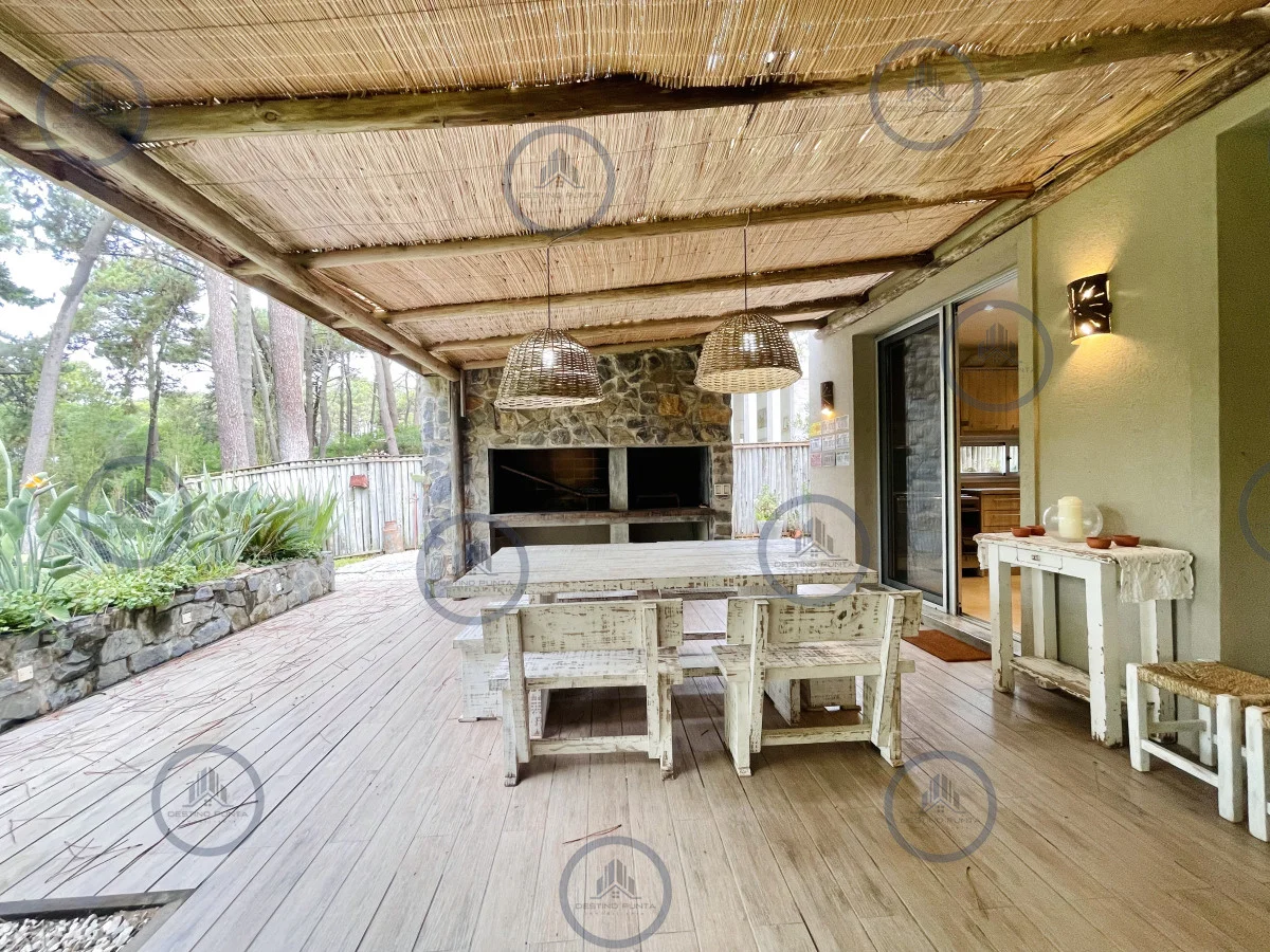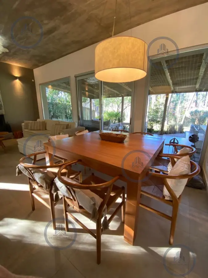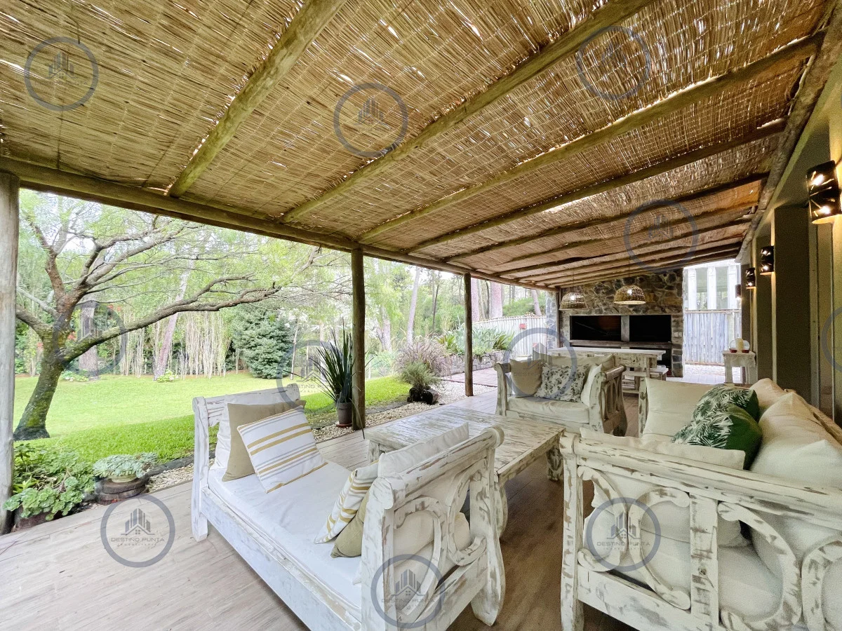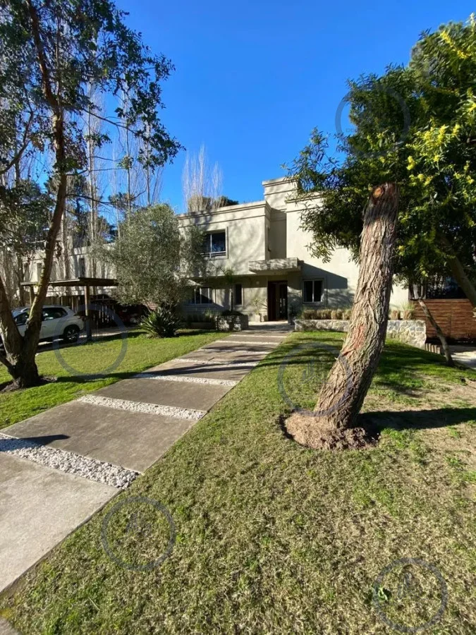 En un lote de 1.056 m2 y desarrollada en 280 m2 distribuidos en dos plantas, esta espléndida propiedad cuenta con un espacioso living comedor con hogar a leña, ventanales de piso a techo que permiten disfrutar el jardín desde el interior de la casa. Parque que rodea toda la casa, ofreciendo una vista despejada y verde desde cualquier rincón. Aquí se ubica el parrillero techado con living exterior y excepcional vista arbolada.