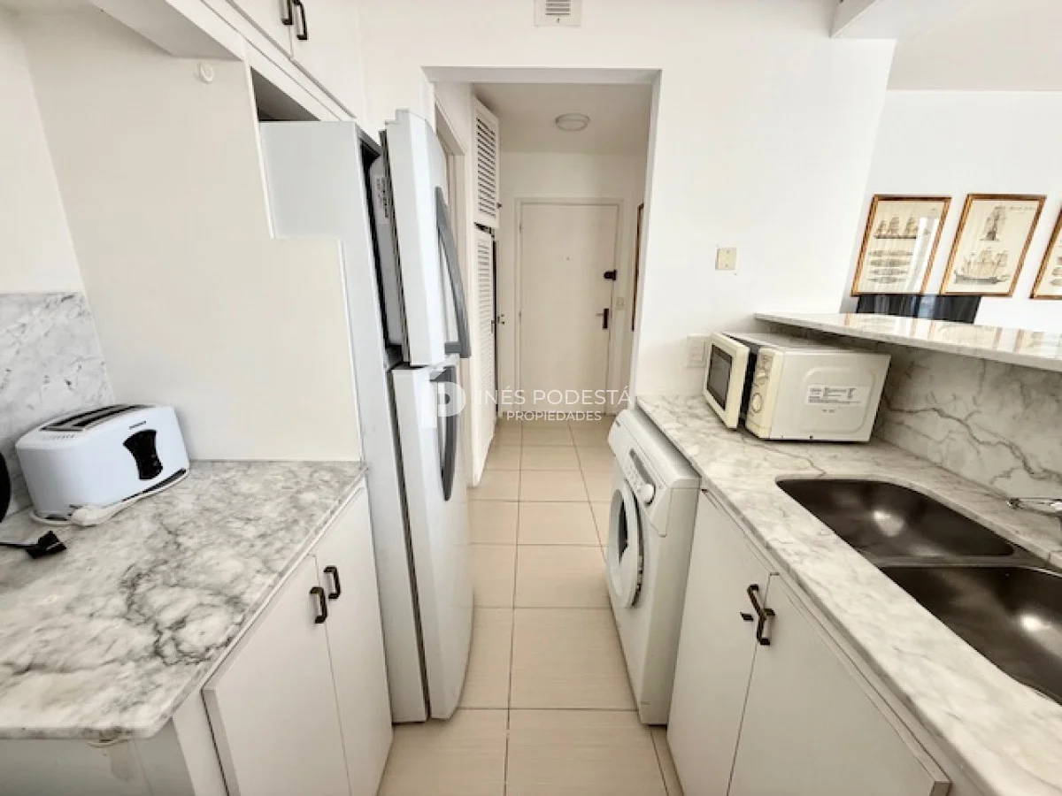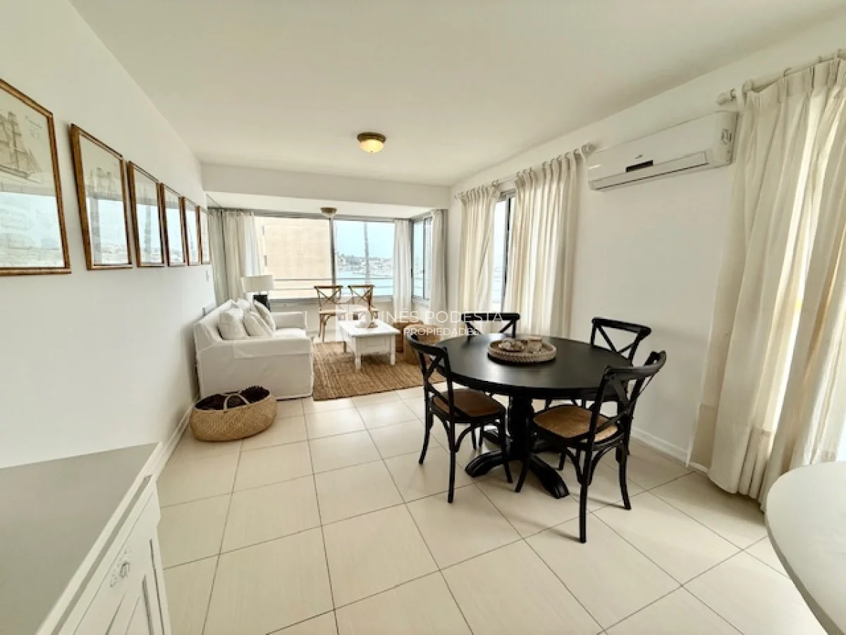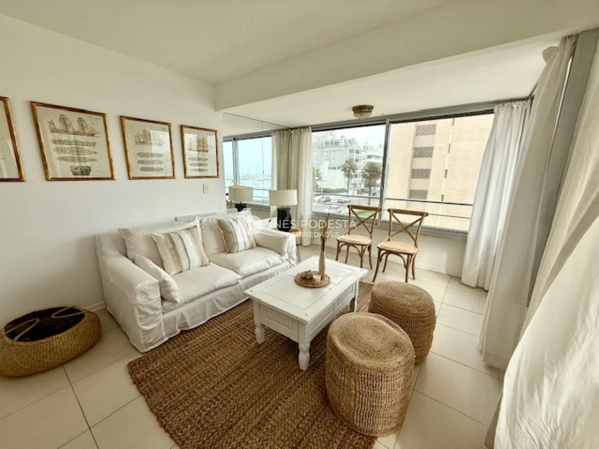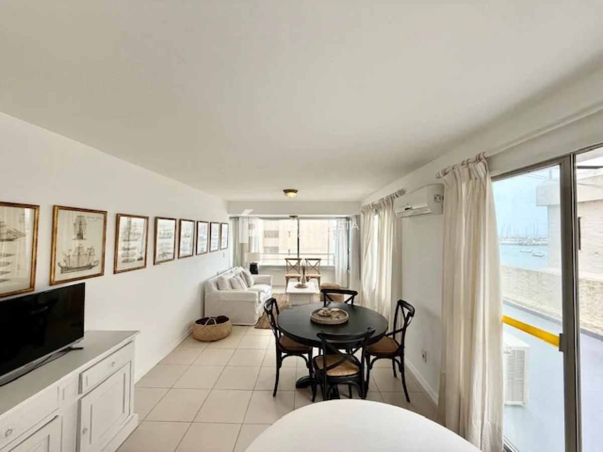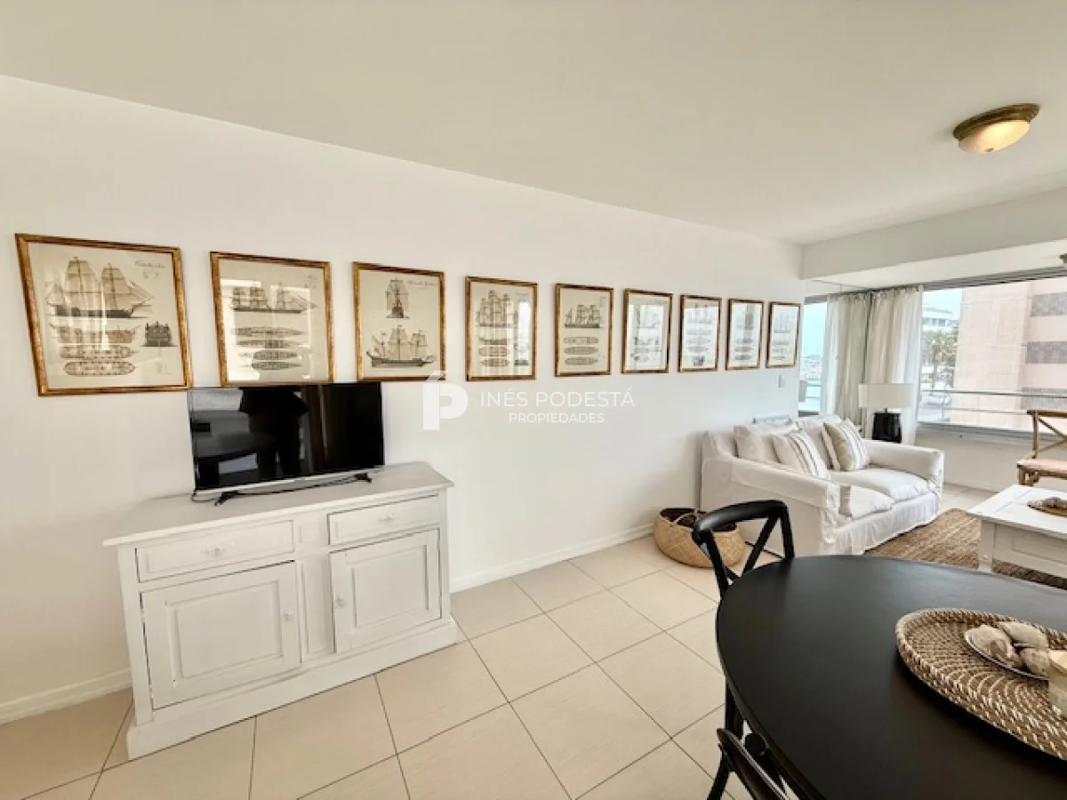 Muy lindo departamento a pasos del Puerto de Punta del Este, 65 m2 propios más 30 m2 de terraza, living comedor, gran terraza con parrillero, cocina americana, 3 dormitorios, 2 baños (principal en suite), garage, portería y servicio de mucama 6 veces a la semana.