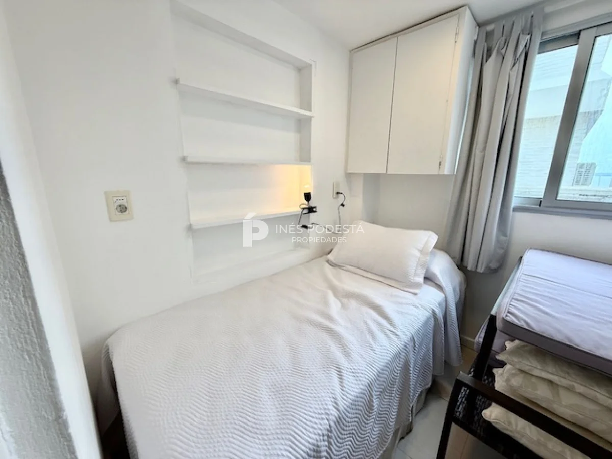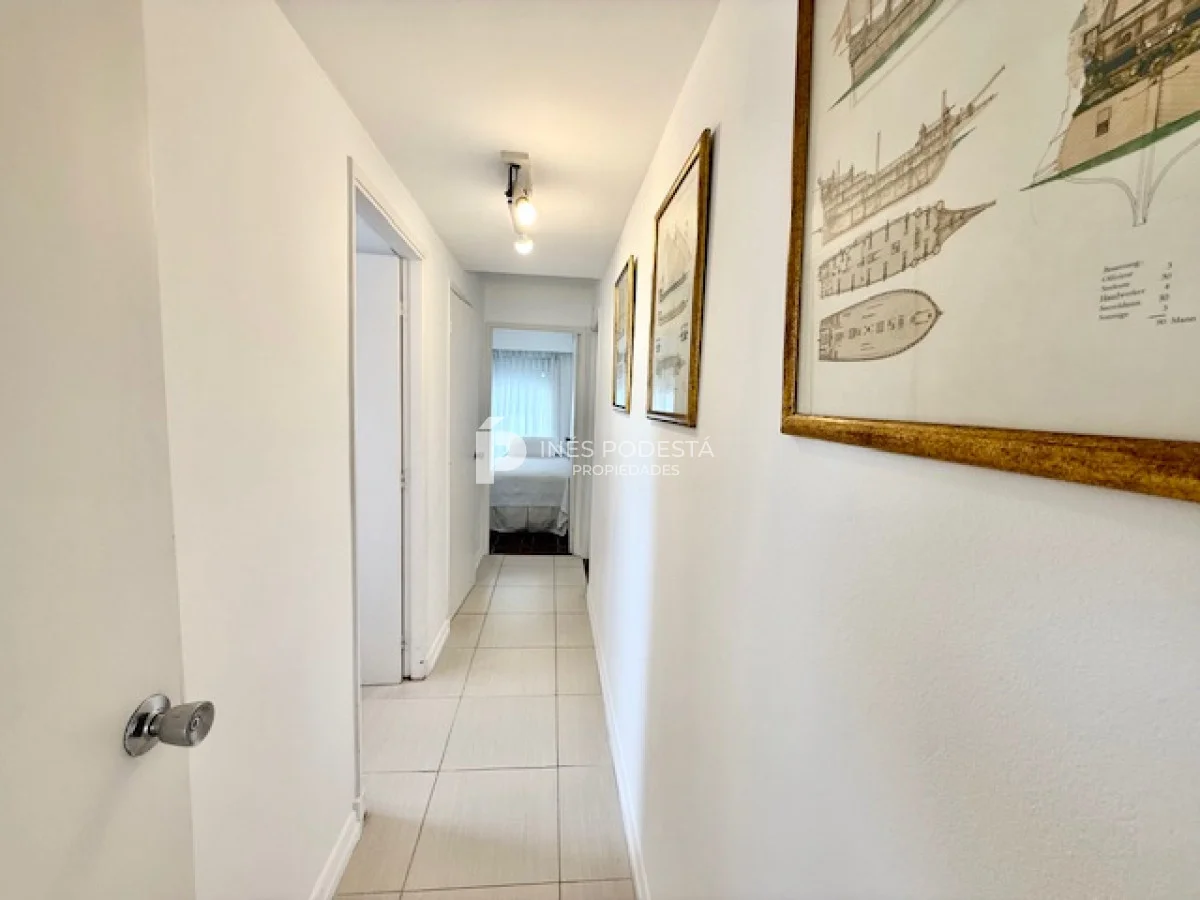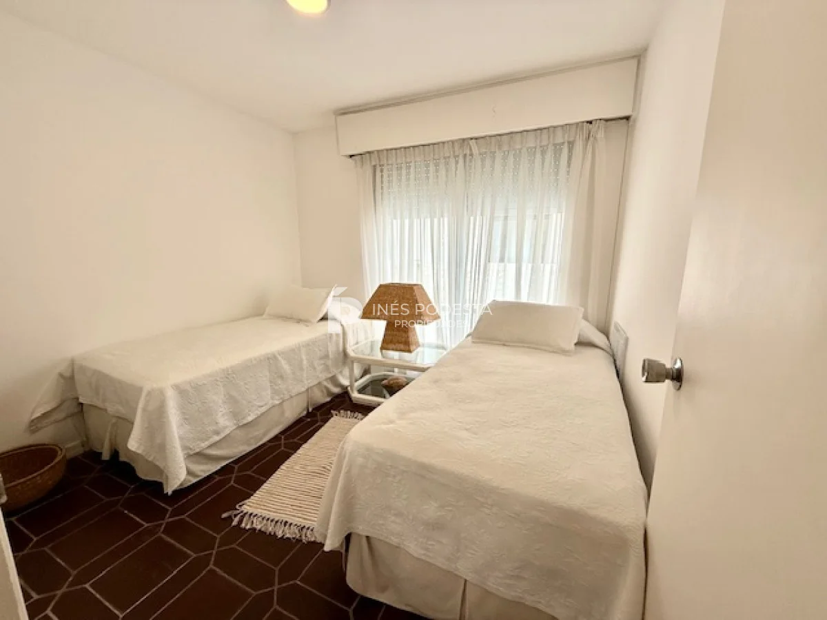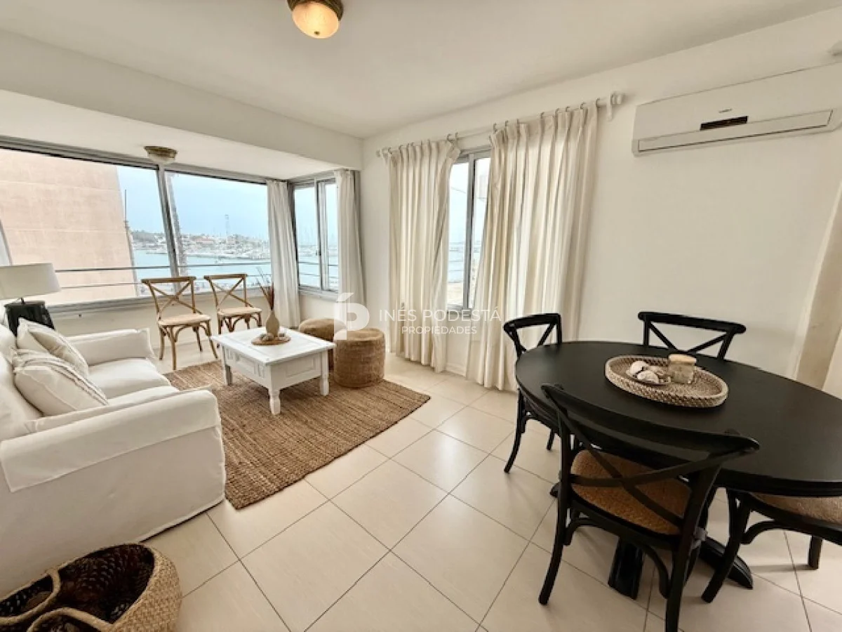 Muy lindo departamento a pasos del Puerto de Punta del Este, 65 m2 propios más 30 m2 de terraza, living comedor, gran terraza con parrillero, cocina americana, 3 dormitorios, 2 baños (principal en suite), garage, portería y servicio de mucama 6 veces a la semana.