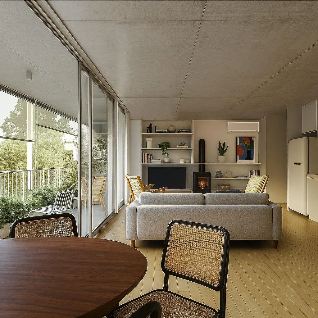 Amplio estar-comedor con estufa de alto rendimiento, al frente con salida a amplio balcón.