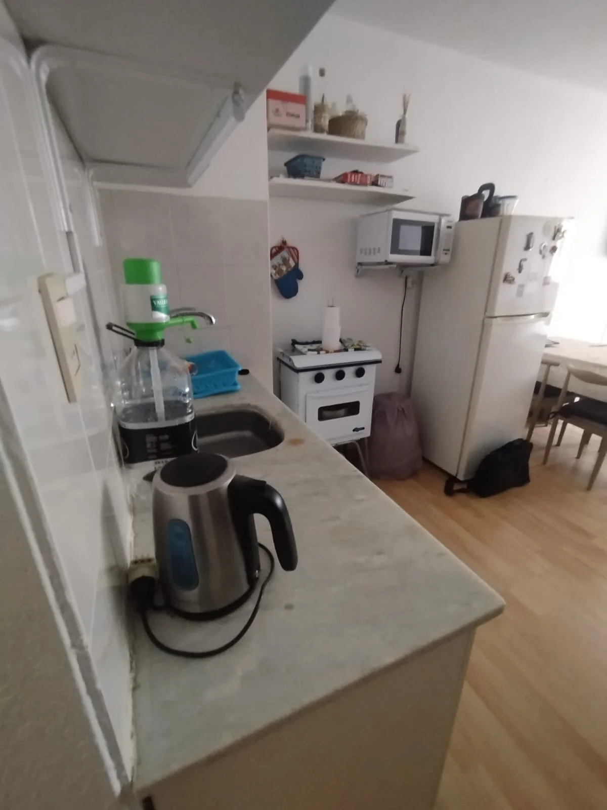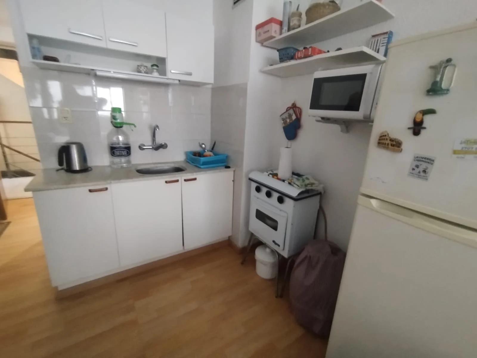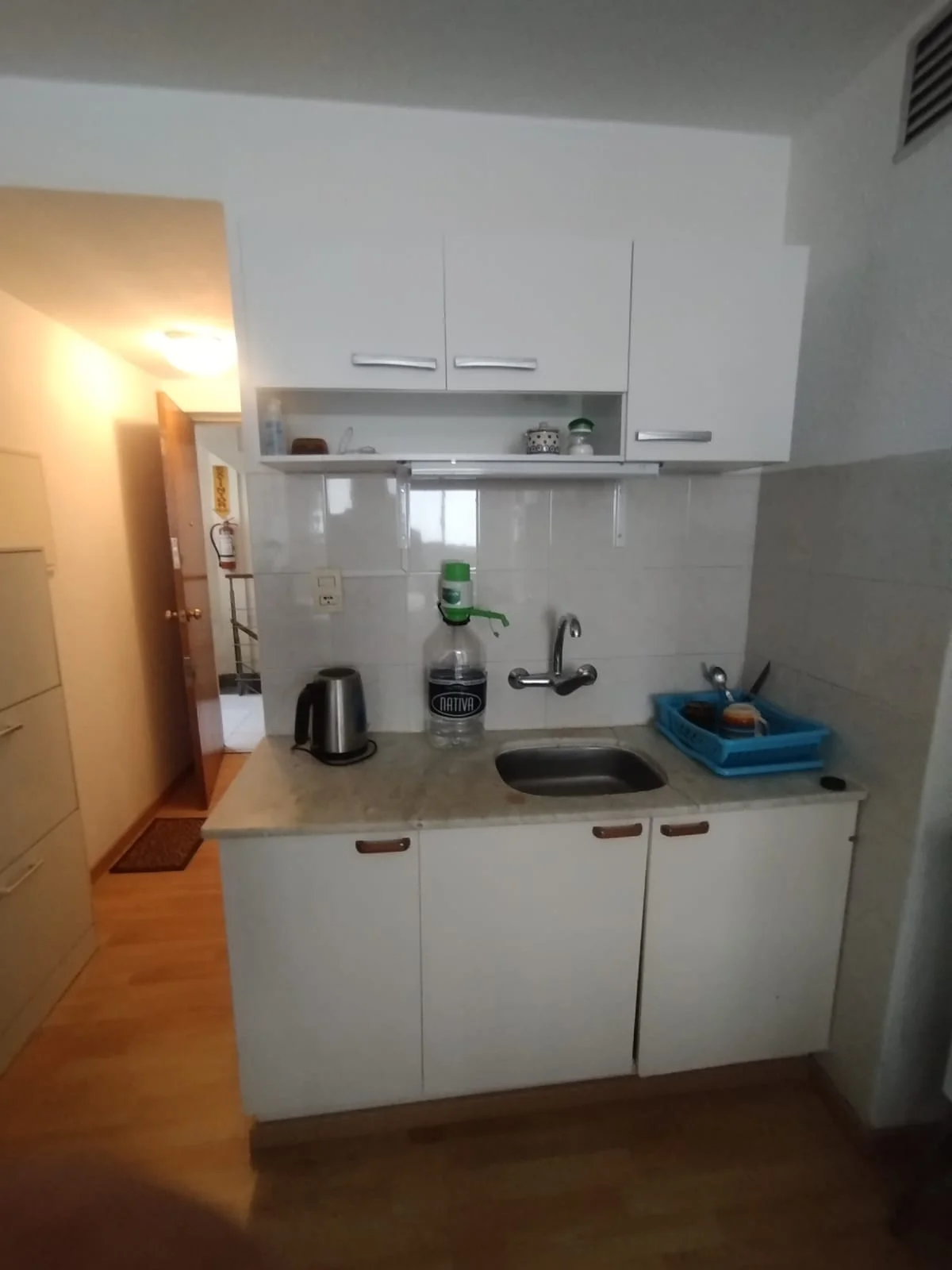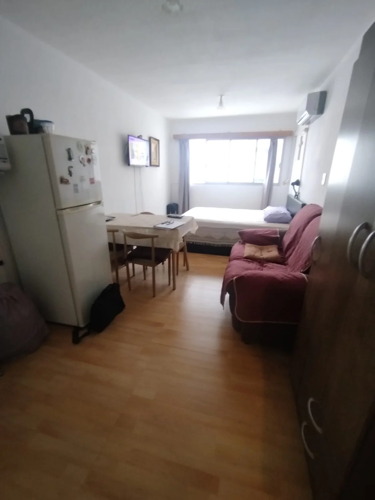 Monoambiente con muebles y electrodomésticos, muy luminoso y funcional.