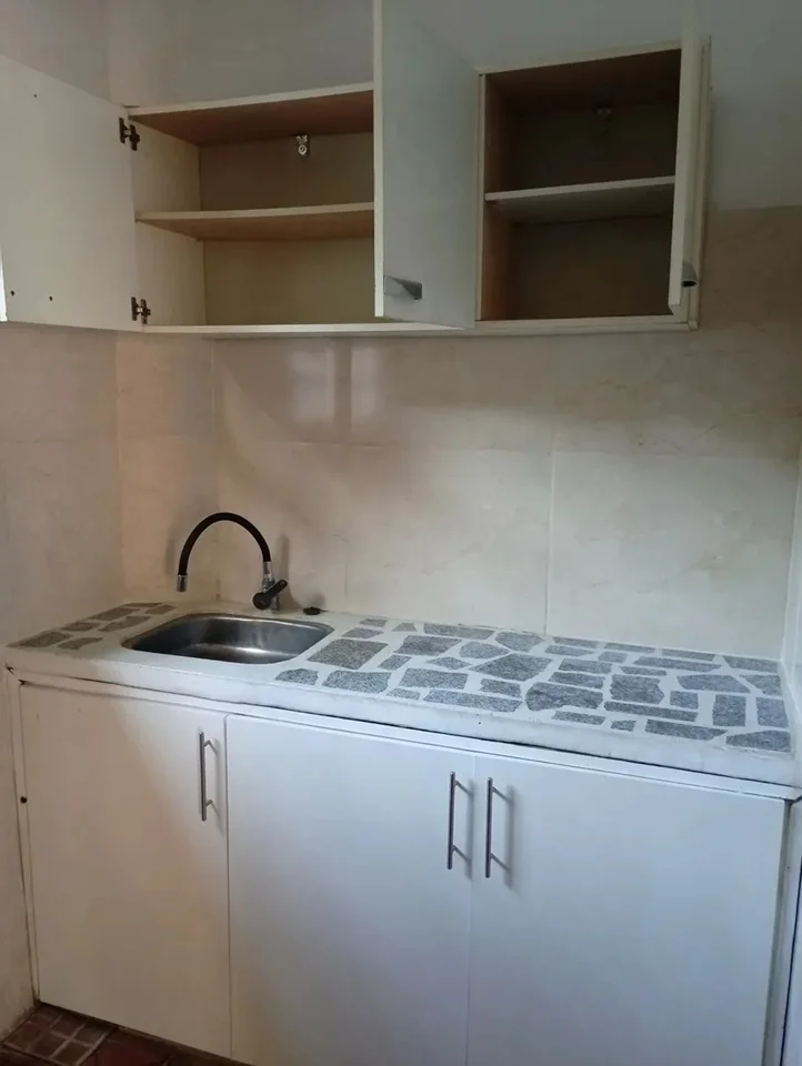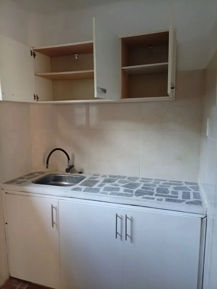 Cocina definida con mesada y placares.