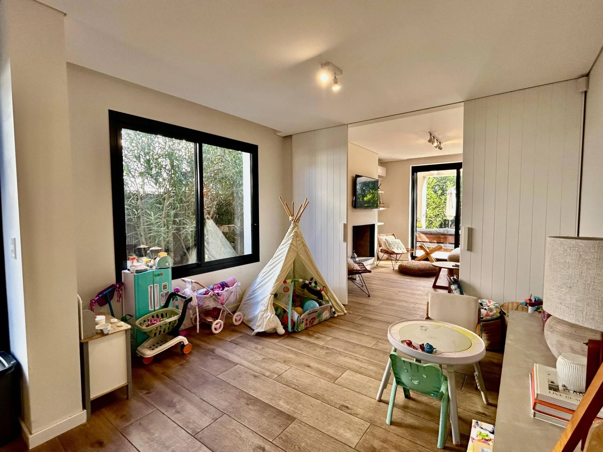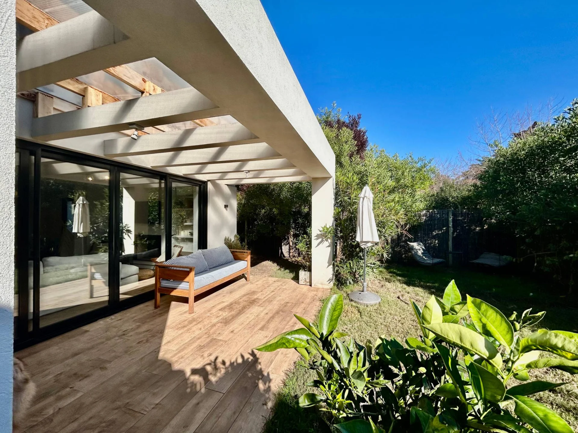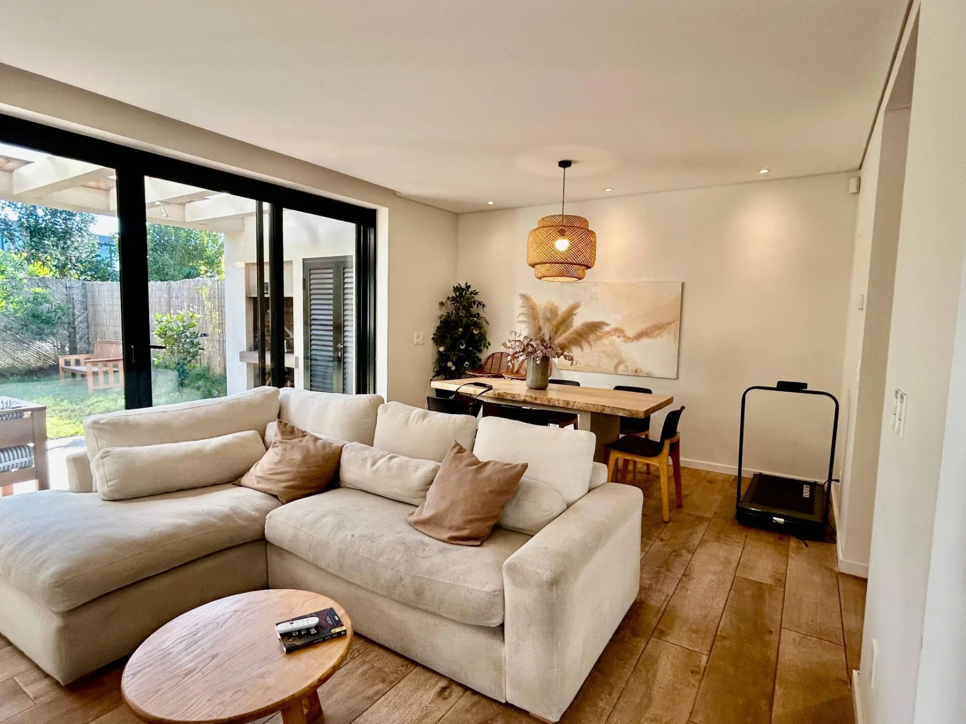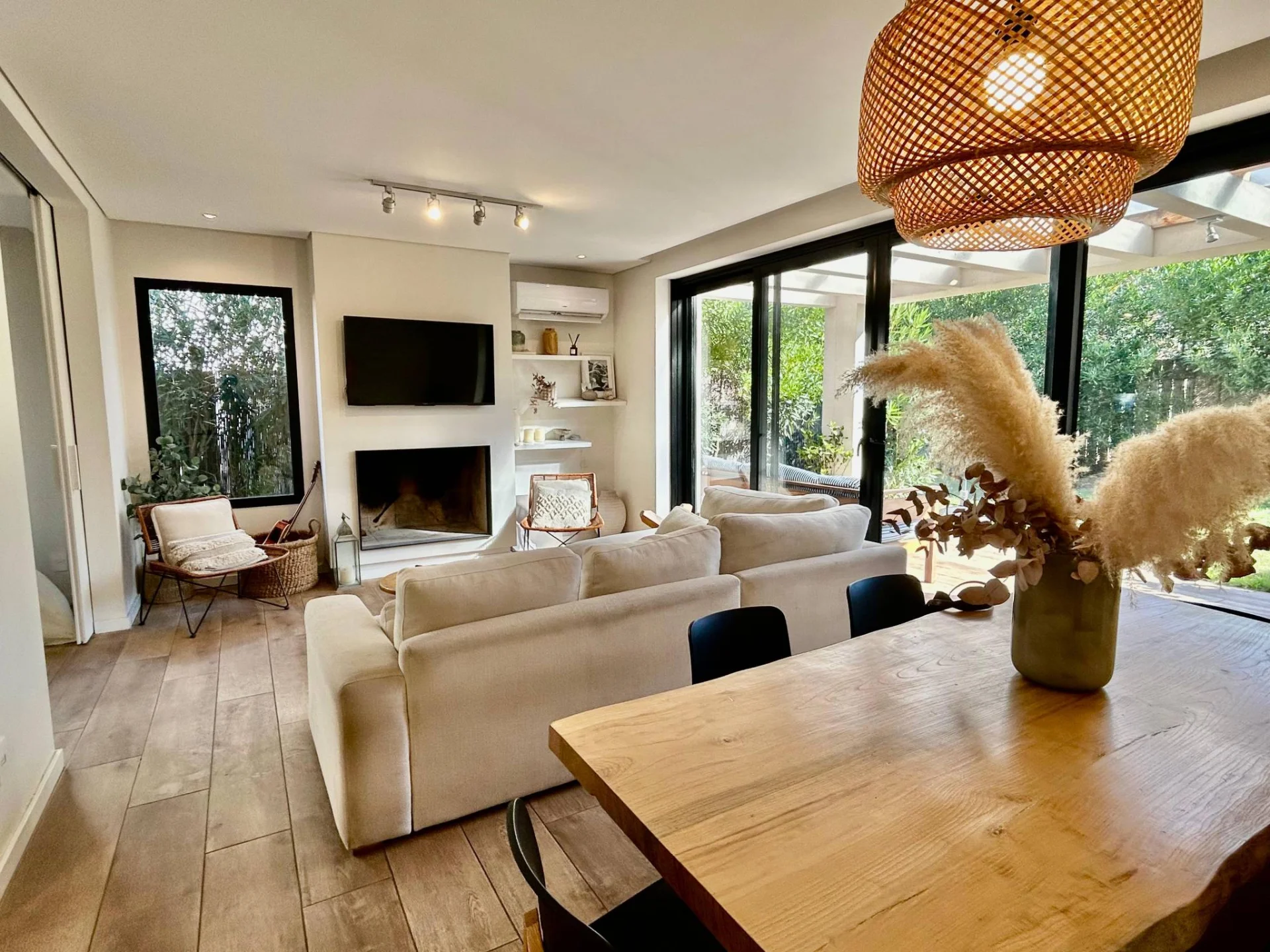 Living-comedor con estufa a leña y salida a jardin con deck y parrillero. Cocina integrada a estar con salida a patio.