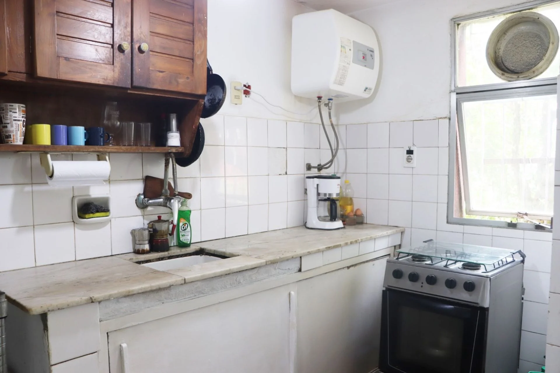 Después tenemos un baño con conexión para lavadora, que necesita actualización si así lo desean los próximos propietarios.