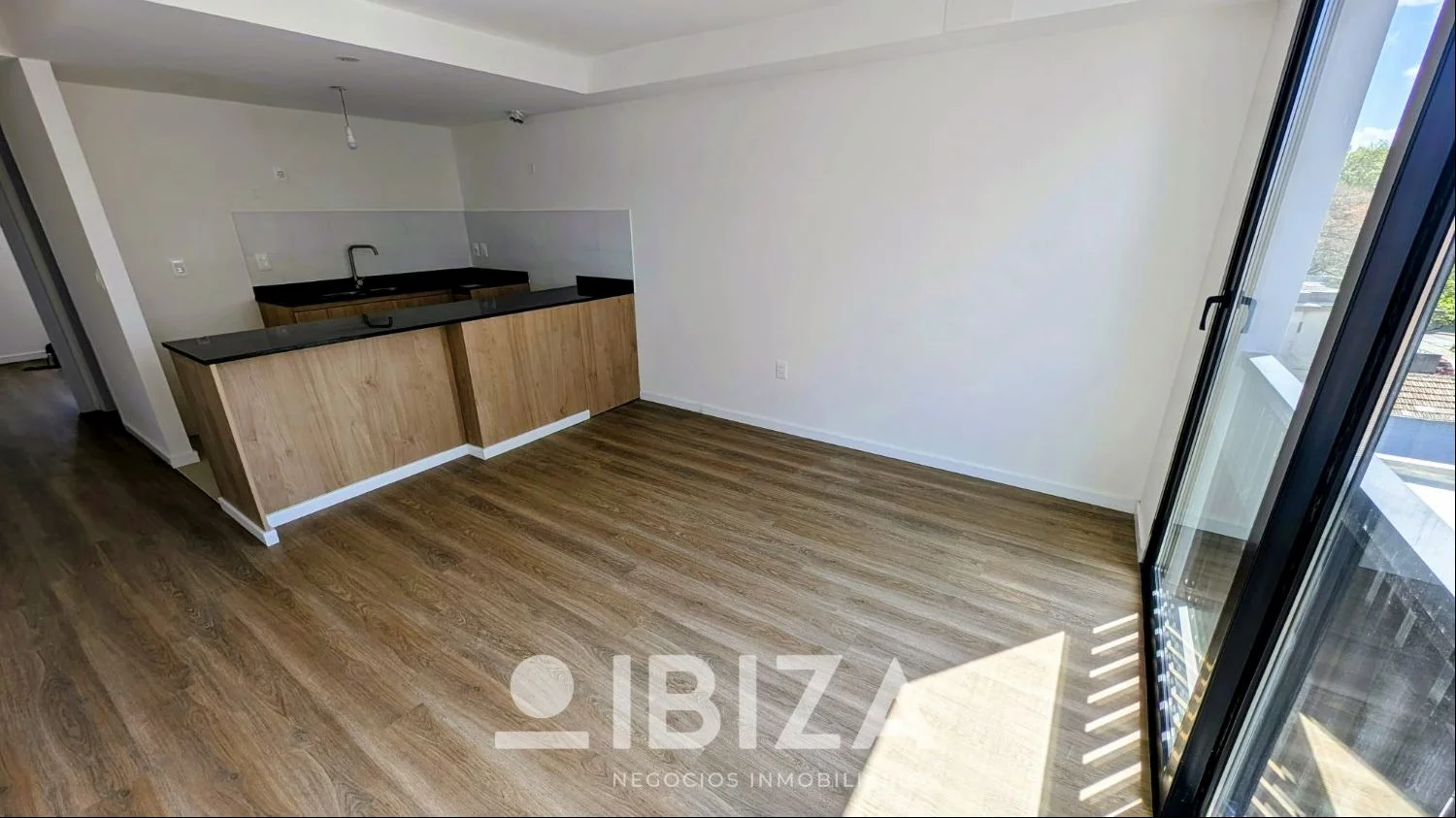 Estar-comedor con cocina integrada. Mesada de granito con placares bajo mesadas.